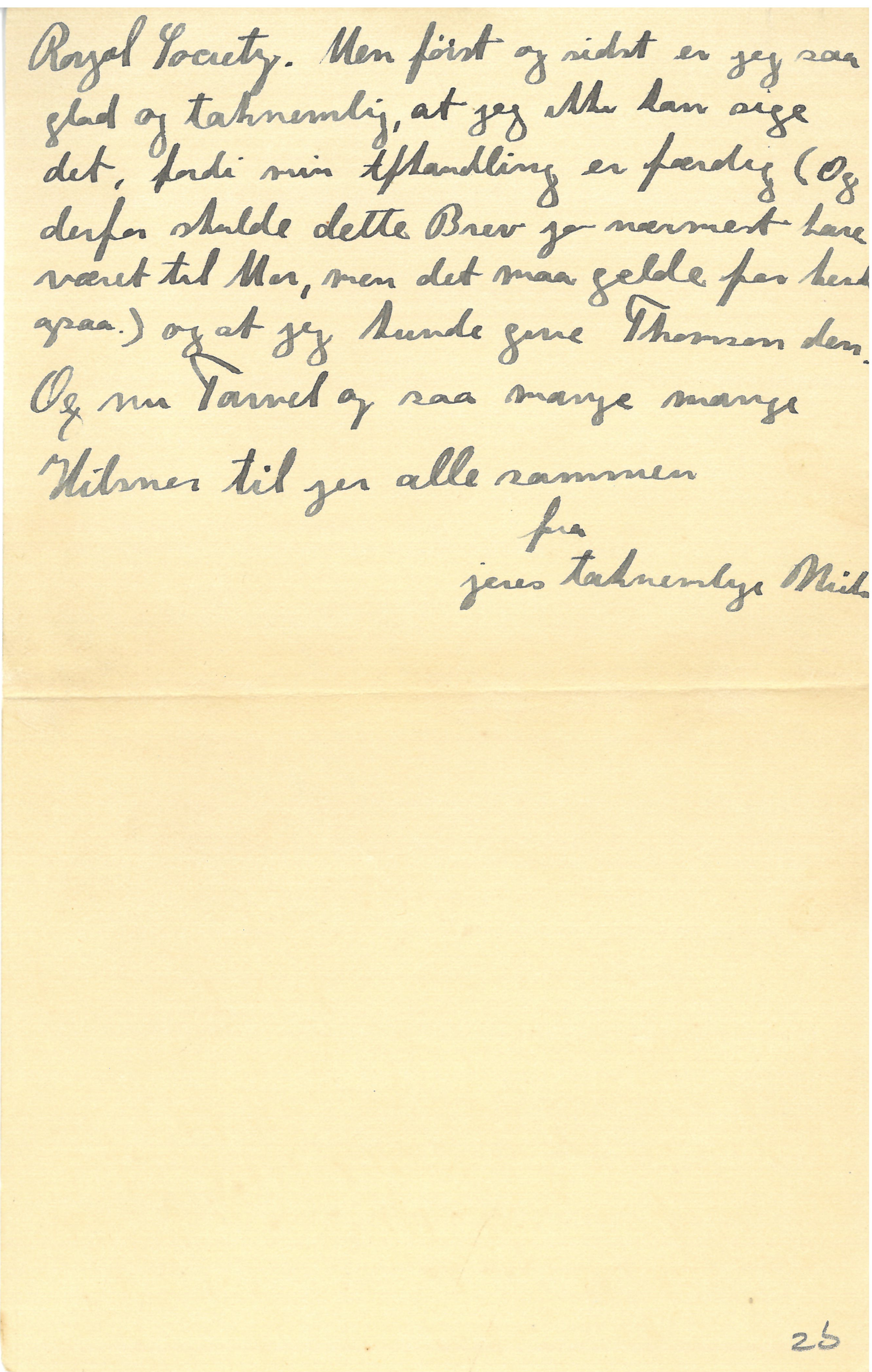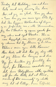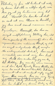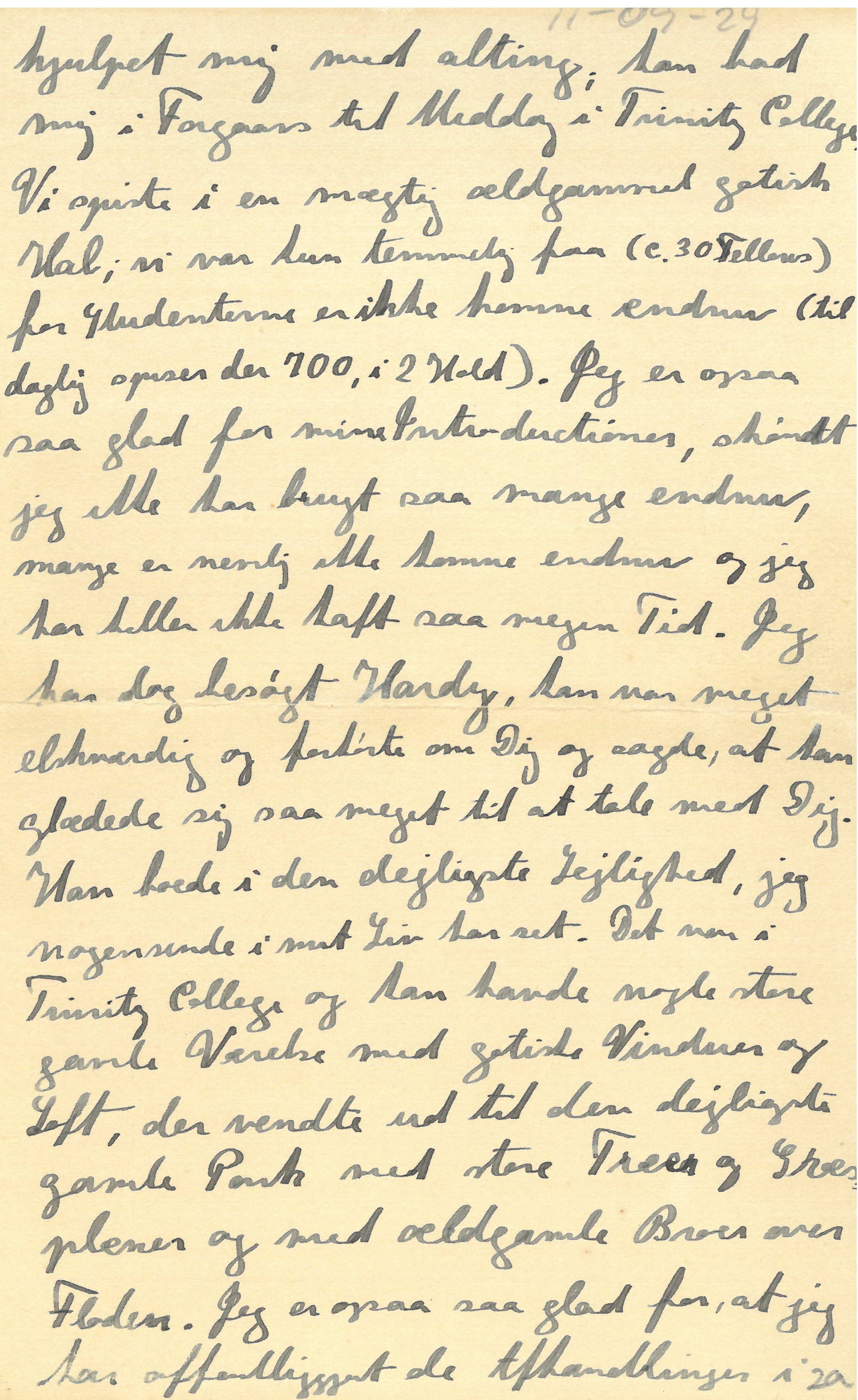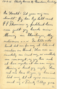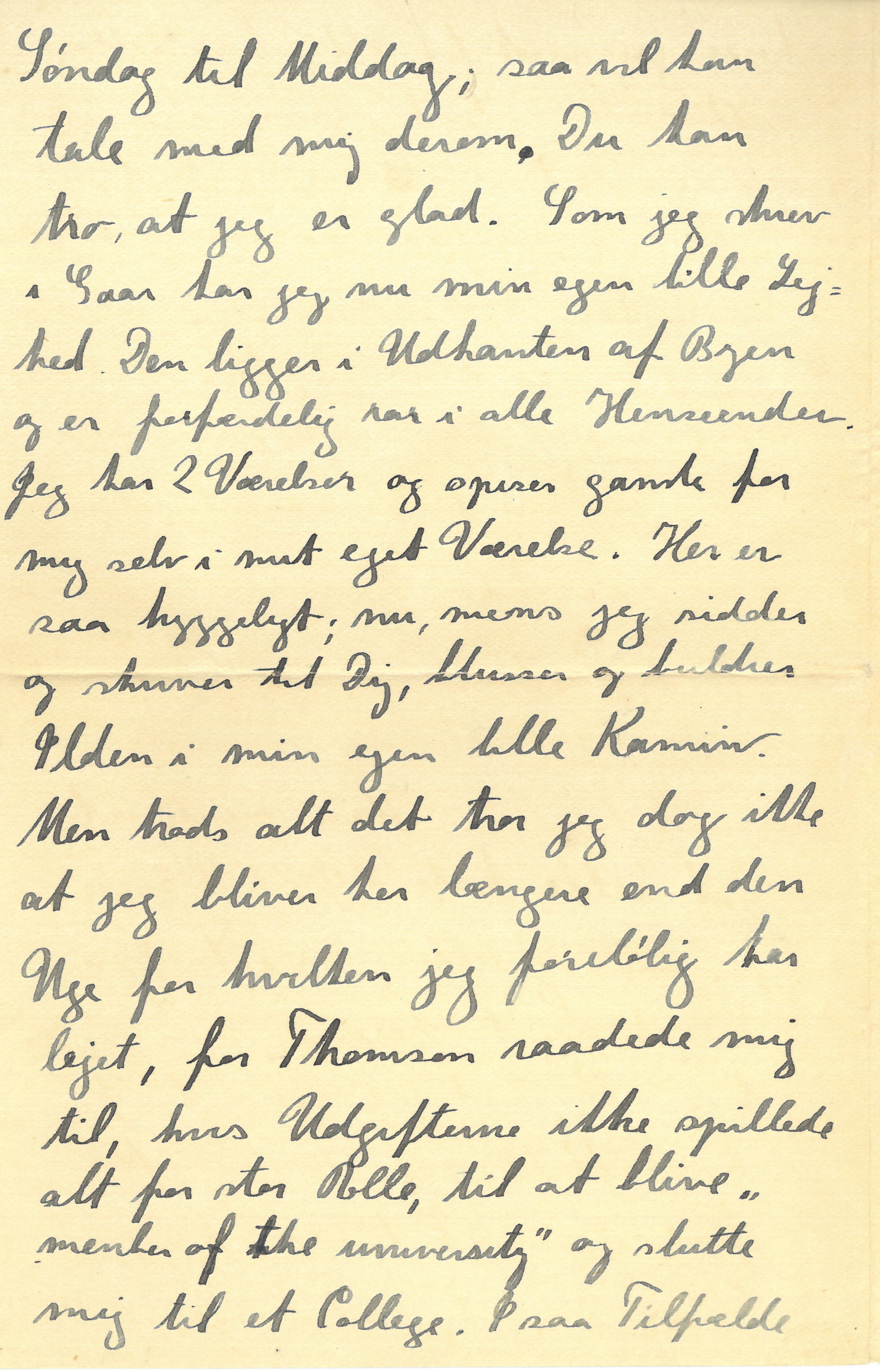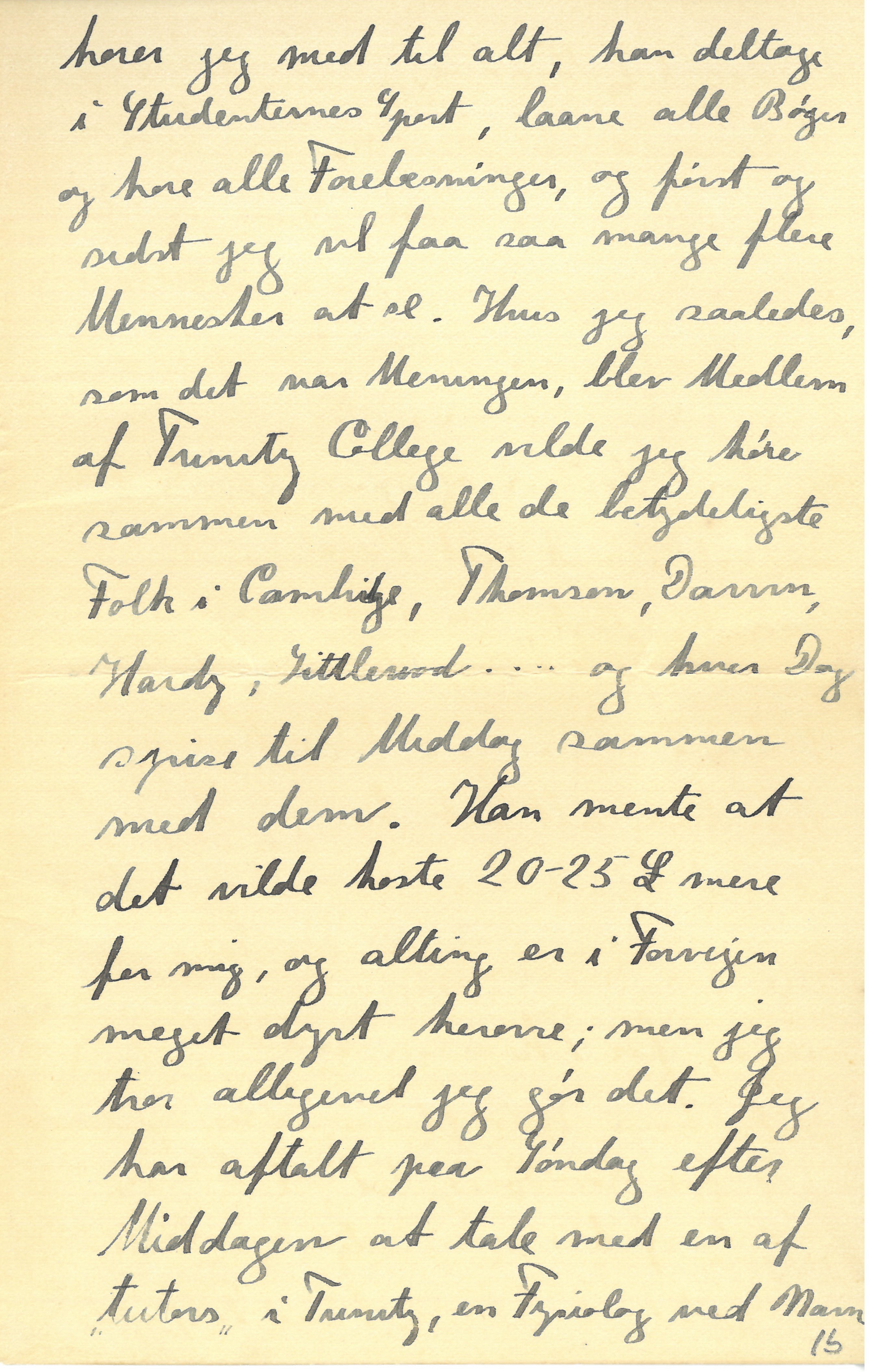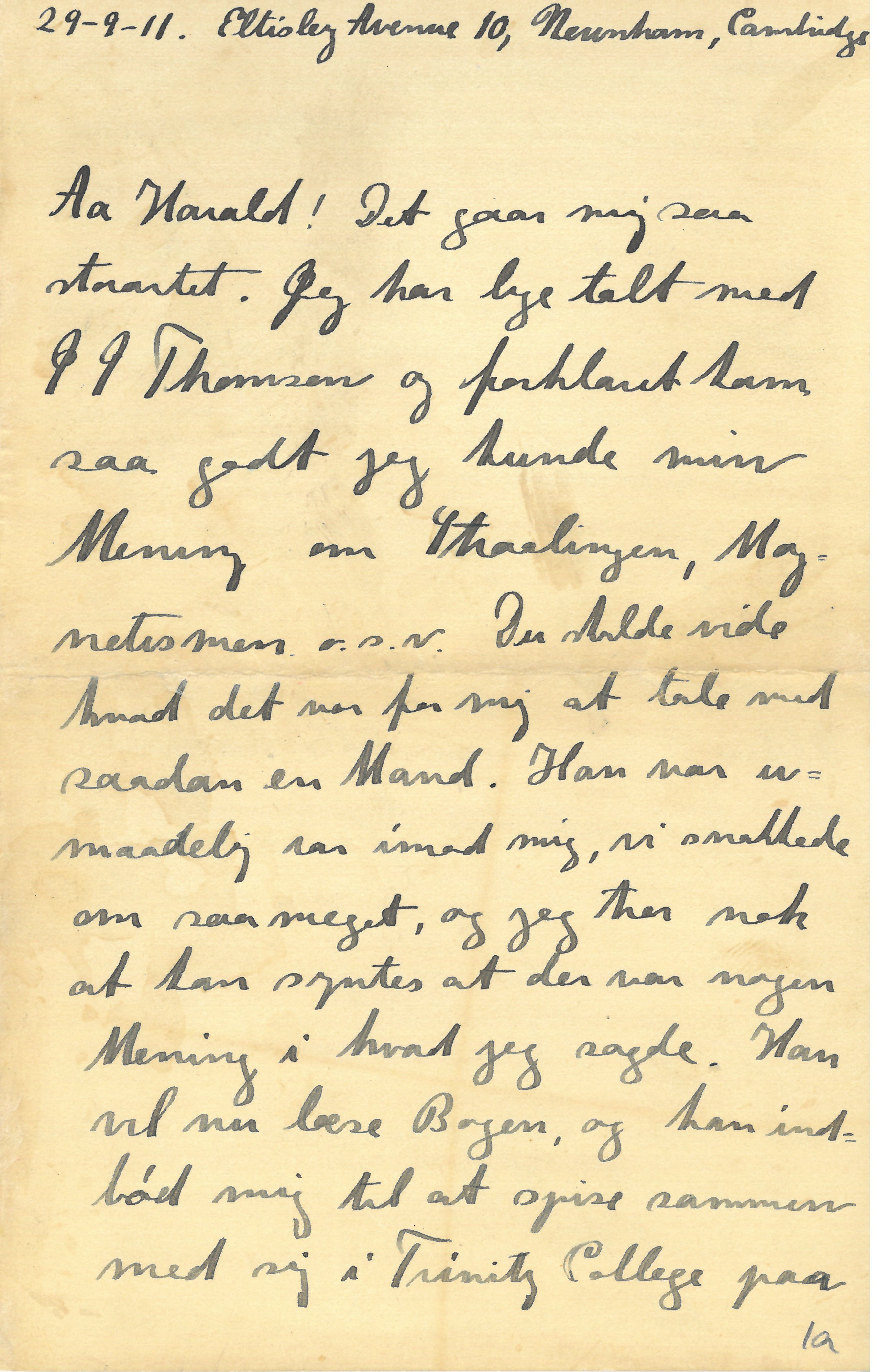 Det gaar mig saa storartet. Jeg har lige talt med J.J. Thomson og forklaret ham saa godt jeg kunde min Mening om Straalingen, Magnetismen o.s.v. Du skulde vide hvad det var for mig at tale med saadan en Mand. Han var umaadelig rar imod mig, vi snakkede om saa meget, og jeg tror nok at han syntes at der var nogen Mening i hvad jeg sagde. Han vil nu læse Bogen, og han indbød mig til at spise sammen med sig i Trinity College paa |Søndag til Middag; saa vil han tale med mig derom. Du kan tro, at jeg er glad. Som jeg skrev i Gaar har jeg nu min egen lille Lejlighed. Den ligger i Udkanten af Byen og er forfærdelig rar i alle Henseender. Jeg har 2 Værelser og spiser ganske for mig selv i mit eget Værelse. Her er saa hyggeligt; nu, mens jeg sidder og skriver til Dig, blusser og buldrer Ilden i min egen lille Kamin. Men trods alt det tror jeg dog ikke at jeg bliver her længere end den Uge for hvilken jeg foreløbig har lejet, for Thomson raadede mig til, hvis Udgifterne ikke spillede alt for stor Rolle, til at blive “member of the university” og slutte mig til et College. I saa Tilfælde |hører jeg med til alt, kan deltage i Studenternes Sport, laane alle Bøger og høre alle Forelæsninger, og først og sidst jeg vil faa saa mange flere Mennesker at se. Hvis jeg saaledes, som det var Meningen, blev Medlem af Trinity College vilde jeg høre sammen med alle de betydeligste Folk i Cambridge, Thomson, Darwin, Hardy, Littlewood ... og hver Dag spise til Middag sammen med dem. Han mente at det vilde koste 20–25£ mere for mig, og alting er i Forvejen meget dyrt herovre; men jeg tror alligevel jeg gør det. Jeg har aftalt paa Søndag efter Middagen at tale med en af “tutors” i Trinity, en Fysiolog ved Navn | Fletscher, og faa alt bestemt at vide, og dersom det ikke er altfor dyrt, saa tror jeg, at jeg bestemmer mig til det. Harald! Du kan tro at det er rart at ens Navn er kendt; jeg har mest været sammen med Fysiologer. Barcroft, der har en meget indflydelsesrig Stilling her, idet han er “proctor of the university”, dvs han repræsenterer den udøvende Magt, og det en meget indgribende Magt, overfor “the undergraduated students”, har været umaadelig rar imod mig, han bad mig straks den anden Dag, jeg var her, til Middag. Jeg var der alene sammen med den tyske Fysiolog Franz Müller, der ogsaa har været hos os (i Rungsted). Det var morsomt at se et saadant rigtig engelsk Hjem. Men navnlig har en ung Fysiolog Hill (til hvem Frk Lehmann havde givet mig Anbefaling) været utrolig elskværdig imod mig, han har skaffet mig denne Bolig og har |hjulpet mig med alting; han bad mig i Forgaars til Middag i Trinity College. Vi spiste i en mægtig ældgammel gotisk Hal; vi var kun temmelig faa (c. 30 Fellows) for Studenterne er ikke komne endnu (til daglig spiser der 700, i 2 Hold). Jeg er ogsaa saa glad for mine Introductioner, skønt jeg ikke har brugt saa mange endnu, mange er nemlig ikke komne endnu og jeg har heller ikke haft saa megen Tid. Jeg har dog besøgt Hardy, han var meget elskværdig og forhørte om Dig og sagde, at han glædede sig saa meget til at tale med Dig. Han boede i den dejligste Lejlighed, jeg nogensinde i mit Liv har set. Det var i Trinity College og han havde nogle store gamle Værelser med gotiske Vinduer og Loft, der vendte ud til den dejligste gamle Park med store Træer og Græsplæner og med ældgamle Broer over Floden. Jeg er ogsaa saa glad for, at jeg har offentliggjort de Afhandlinger i |Royal Society. Men først og sidst er jeg saa glad og taknemlig, at jeg ikke kan sige det, fordi min Afhandling er færdig (Og derfor skulde dette Brev jo nærmest have været til Mor, men det maa gælde for hende ogsaa) og at jeg kunde give Thomson den.