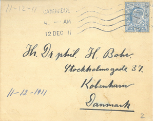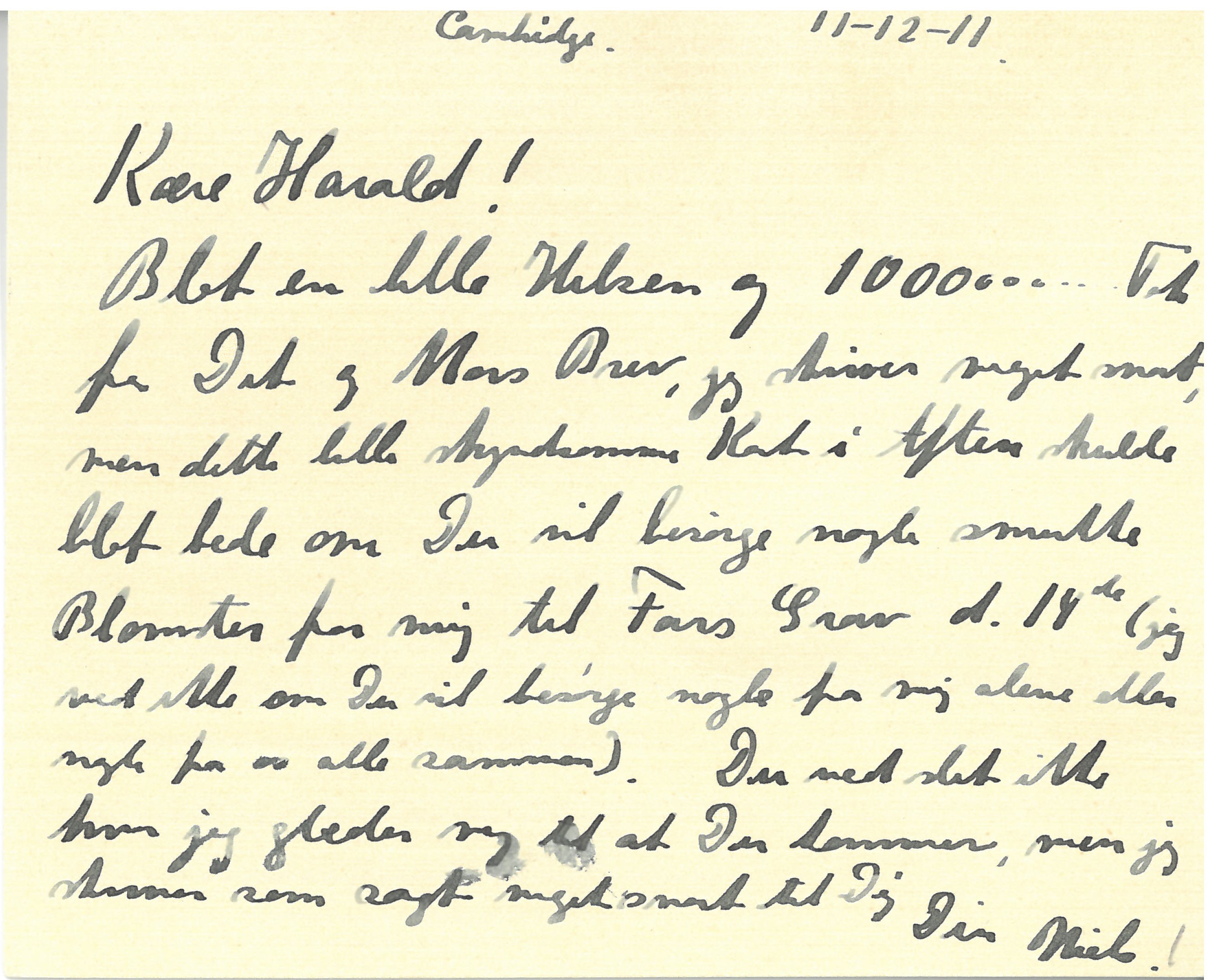 Blot en lille Hilsen og 1000000... Tak for Dit og Mors Brev, jeg skriver meget snart, men dette lille skyndsomme Kort i Aften skulde blot bede om Du vil besørge nogle smukke Blomster for mig til Fars Grav d. 14de (jeg ved ikke om Du vil besørge nogle fra mig alene eller nogle fra os alle sammen). Du ved slet ikke hvor jeg glæder mig til at Du kommer, men jeg skriver som sagt meget snart til Dig.