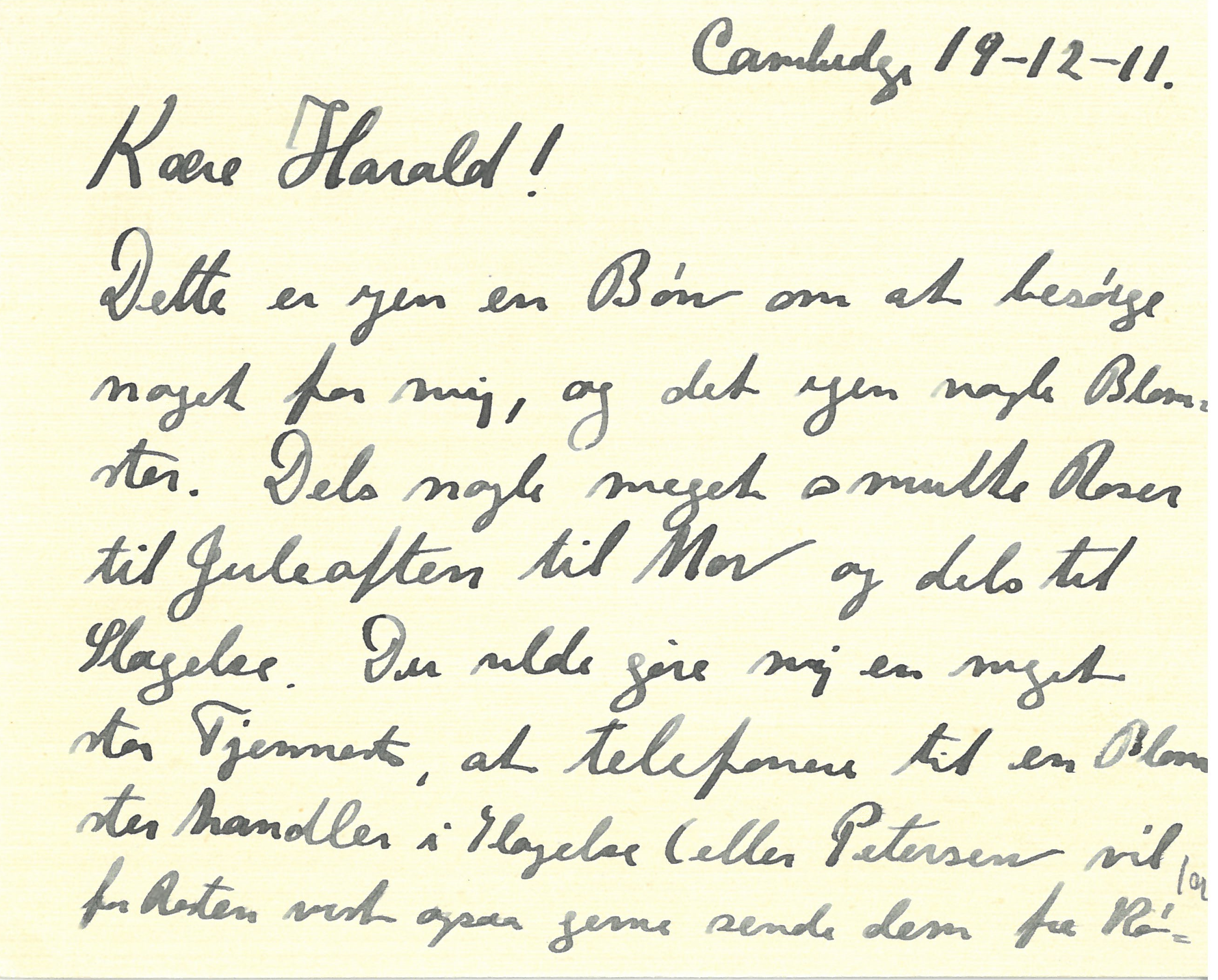 Dette er igen en Bøn om at besørge noget for mig, og det igen nogle Blomster. Dels nogle meget smukke Roser til Juleaften til Mor og dels til Slagelse. Du vilde gøre mig en meget stor Tjeneste, at telefonere til en Blomsterhandler i Slagelse (eller Petersen vil for Resten vist ogsaa gerne sende dem fra Kø1v|benhavn). Det skulde helst være nogle meget smukke lyserøde Roser til Margrethe og nogle mørkerøde til hendes Mor og Bedstemor (Fru L. Holm). Det gør ikke saa meget hvad de koster, naar blot Du vil skrive det op saa jeg kan betale Dig, naar Du kommer (ogsaa alt det andet Du har betalt for mig). Du er ikke ked af alt det Du maa ordne for mig. Du hører snart fra mig. Jeg venter saa længselsfuldt at høre naar Du kommer.