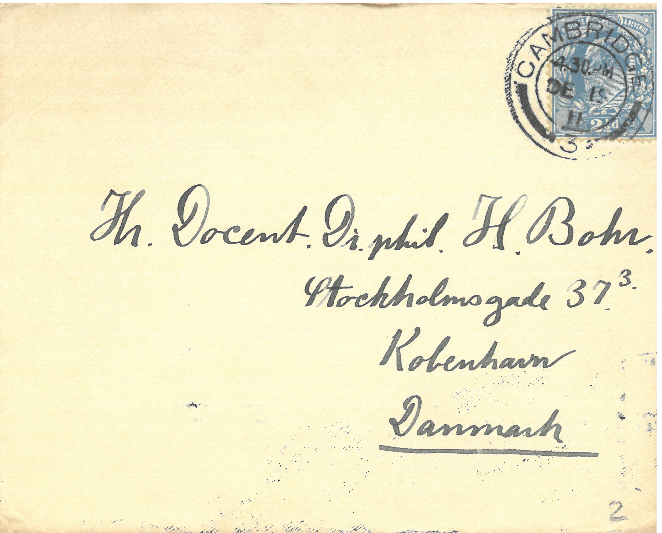 A Copenhagen, Niels Bohr Archive, Harald Bohr Correspondence, HBC-BOHR-111219t. Card, handwritten by Niels Bohr. On the envelope: Hr. Docent. Dr. phil. H. Bohr, Stockholmsgade 373., København,Danmark