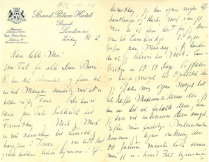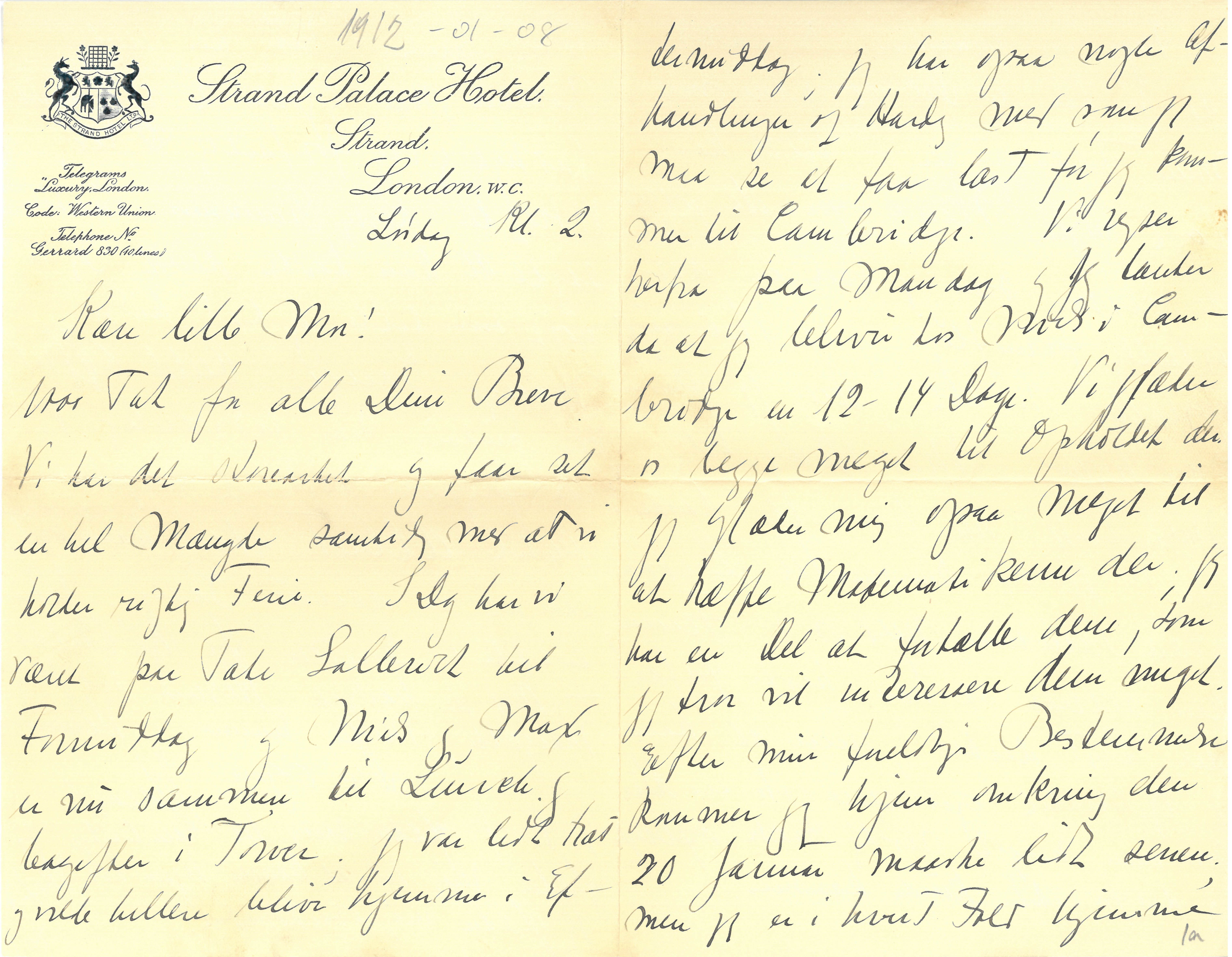 A Copenhagen, Niels Bohr Archive, Family Correspondence, FAM-BE-BOHH-120108ta. Letter, handwritten by Harald Bohr on stationery from Strand Palace Hotel. On the envelope: Fru Professorinde E. Bohr, 37 Stockholmsgade, Copenhagen, Denmark