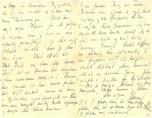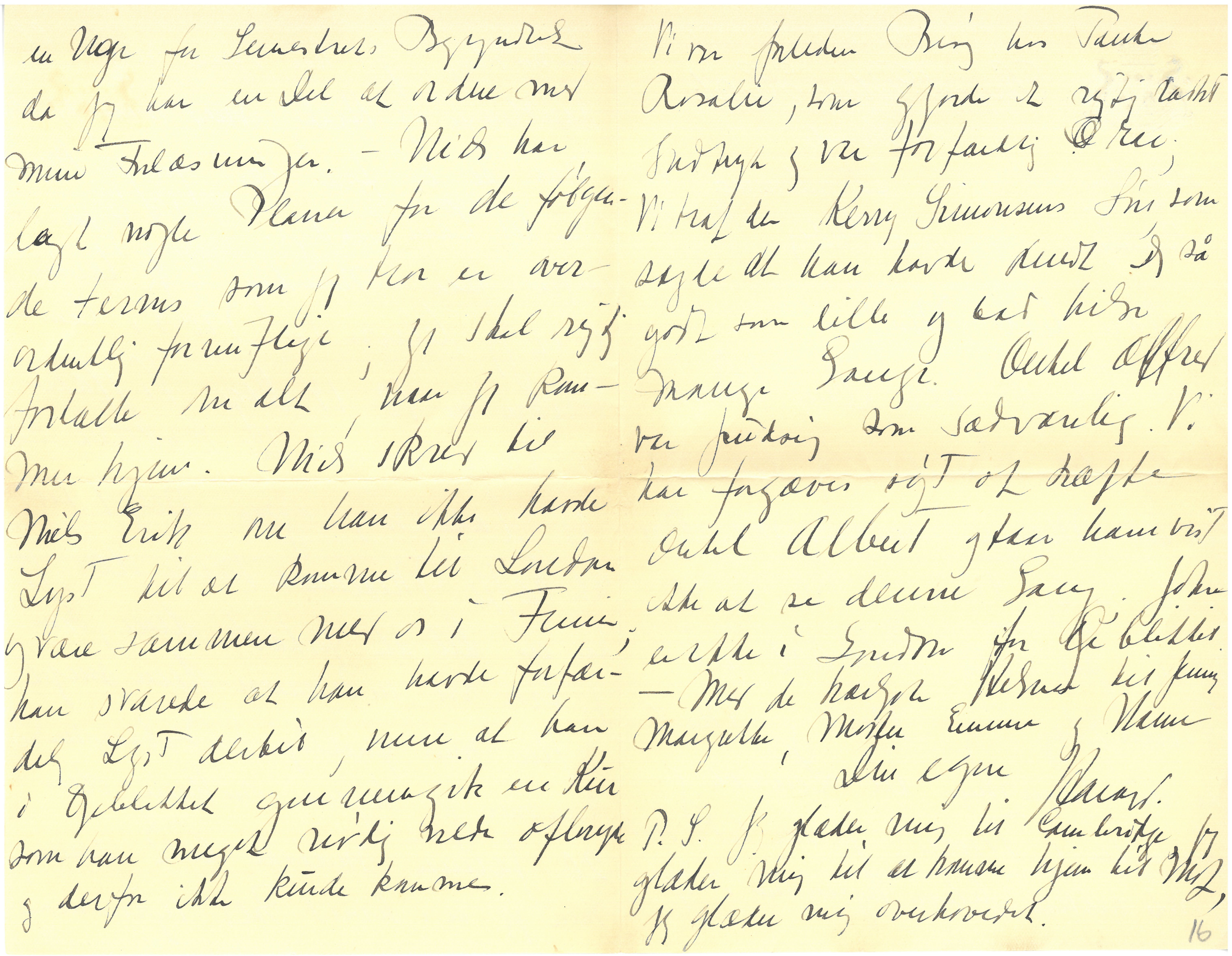 Vi var forleden Besøg hos Tante Rosalie, som gjorde et rigtig raskt Indtryk og var forfærdelig rar; vi traf der Kerry Simonsens Søn, som sagde at han havde kendt Dig saa godt som lille og bad hilse mange Gange. Onkel Alfred var pudsig som sædvanlig. Vi har forgæves søgt at træffe Onkel Albert og faar ham vist ikke at se denne Gang. John er ikke i London for Øjeblikket.