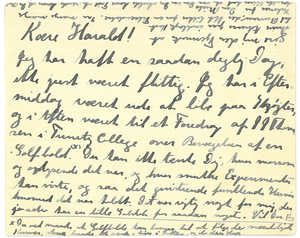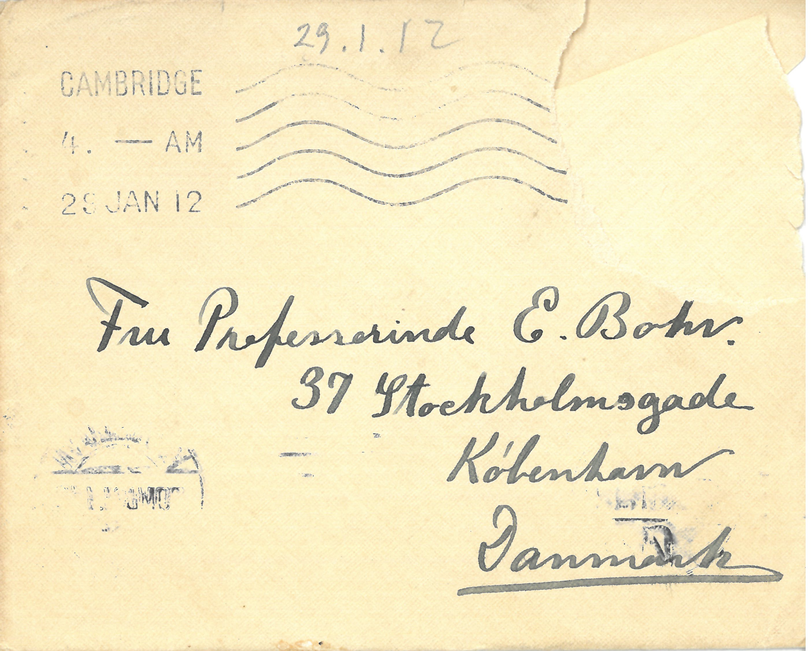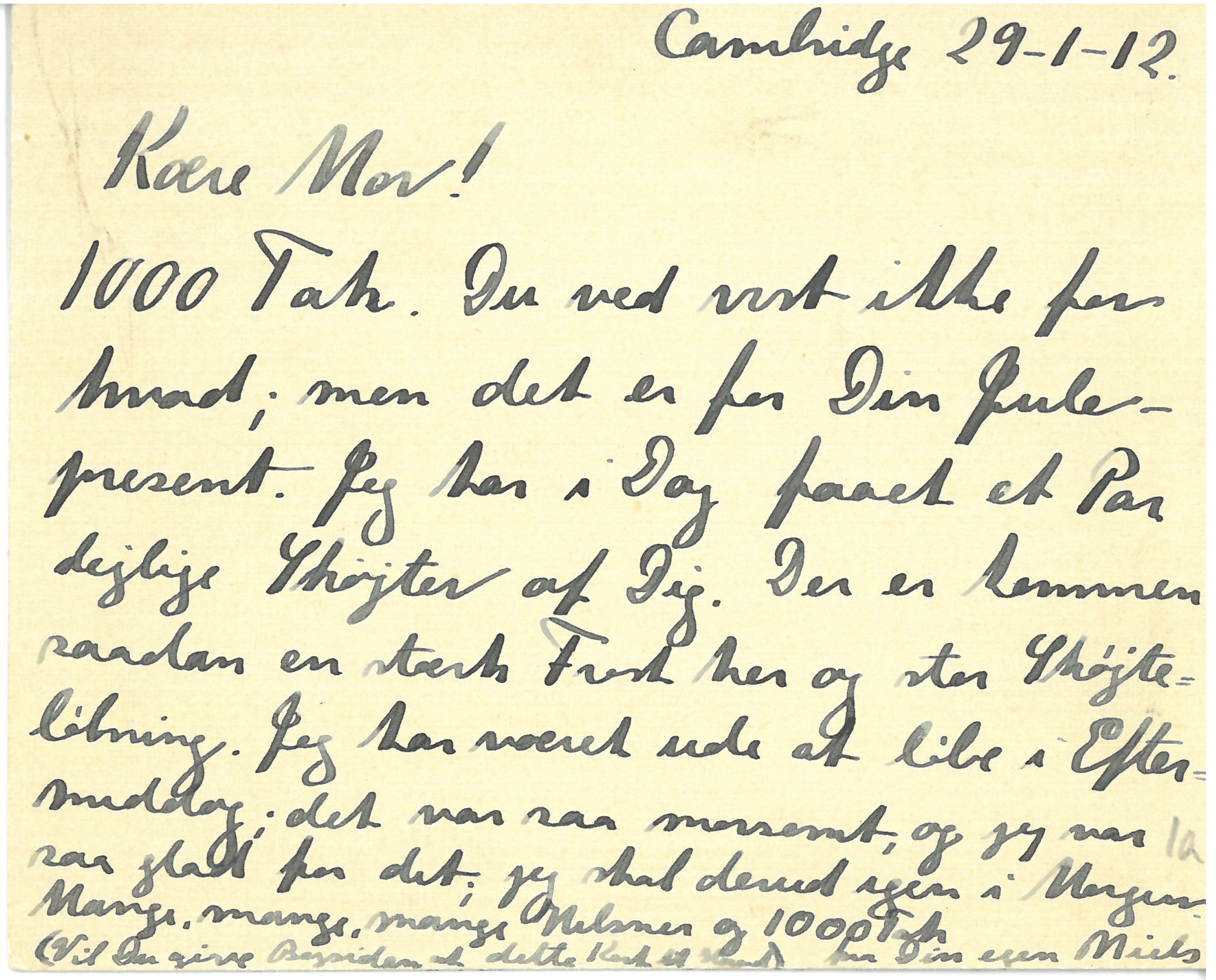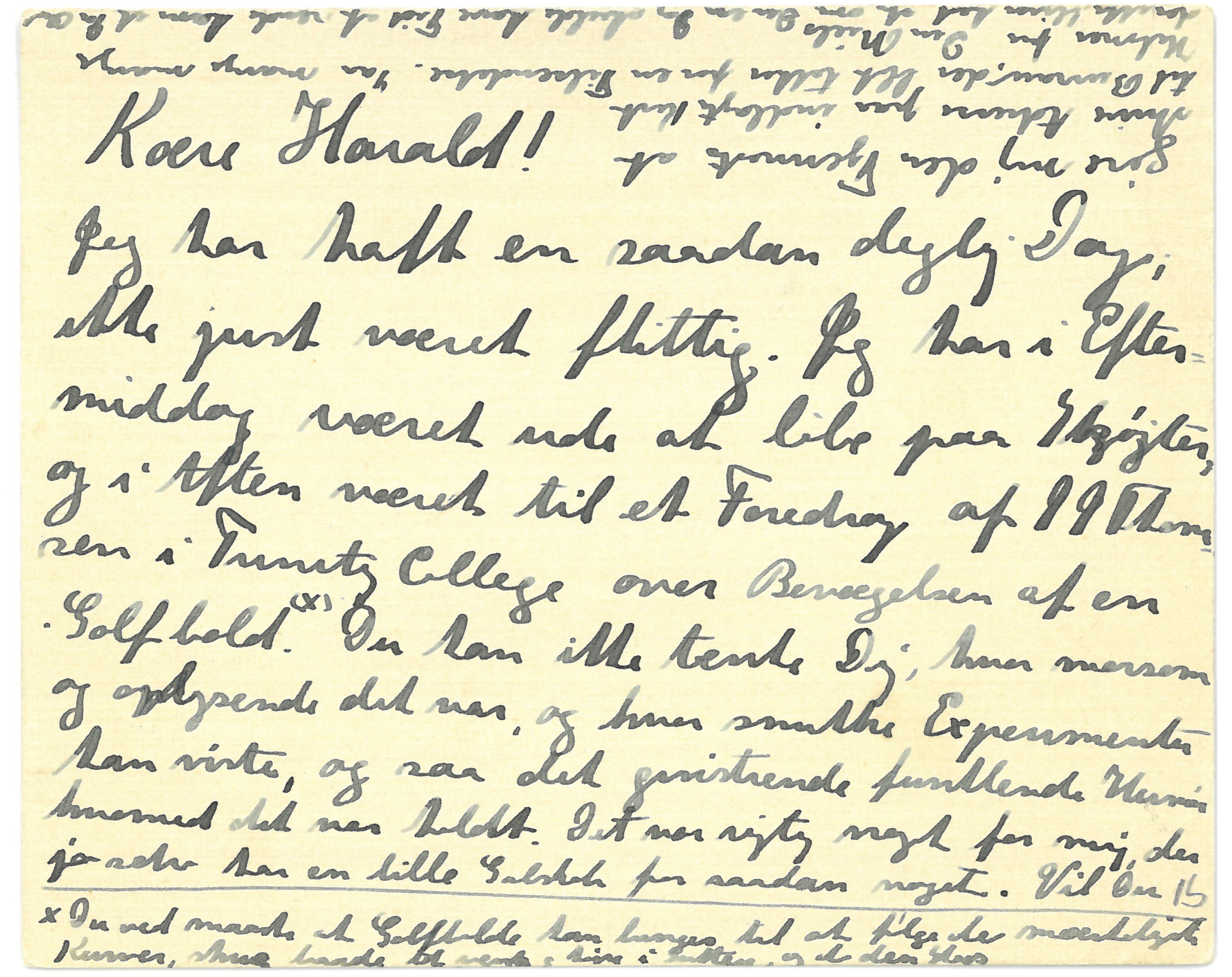 Jeg har haft en saadan dejlig Dag; ikke just været flittig. Jeg har i Eftemiddag været ude at løbe paa Skøjter, og i Aften været til et Foredrag af J.J. Thomson i Trinity College over Bevægelsen af en Golfbold(x). Du kan ikke tænke Dig, hvor morsom og oplysende det var, og hvor smukke Experimenter han viste, og saa det gnistrende funklende Humør hvormed det var holdt. Det var rigtig noget for mig, der jo selv har en lille Galskab for saadan noget. Vil Du gøre mig den Tjeneste at skrive Adresse paa indlagte Kort til Burrau, der blot takker for en Tilsendelse.