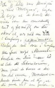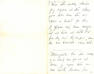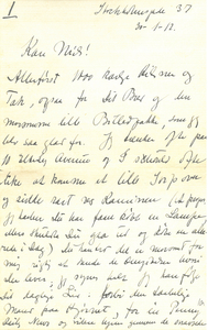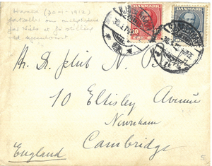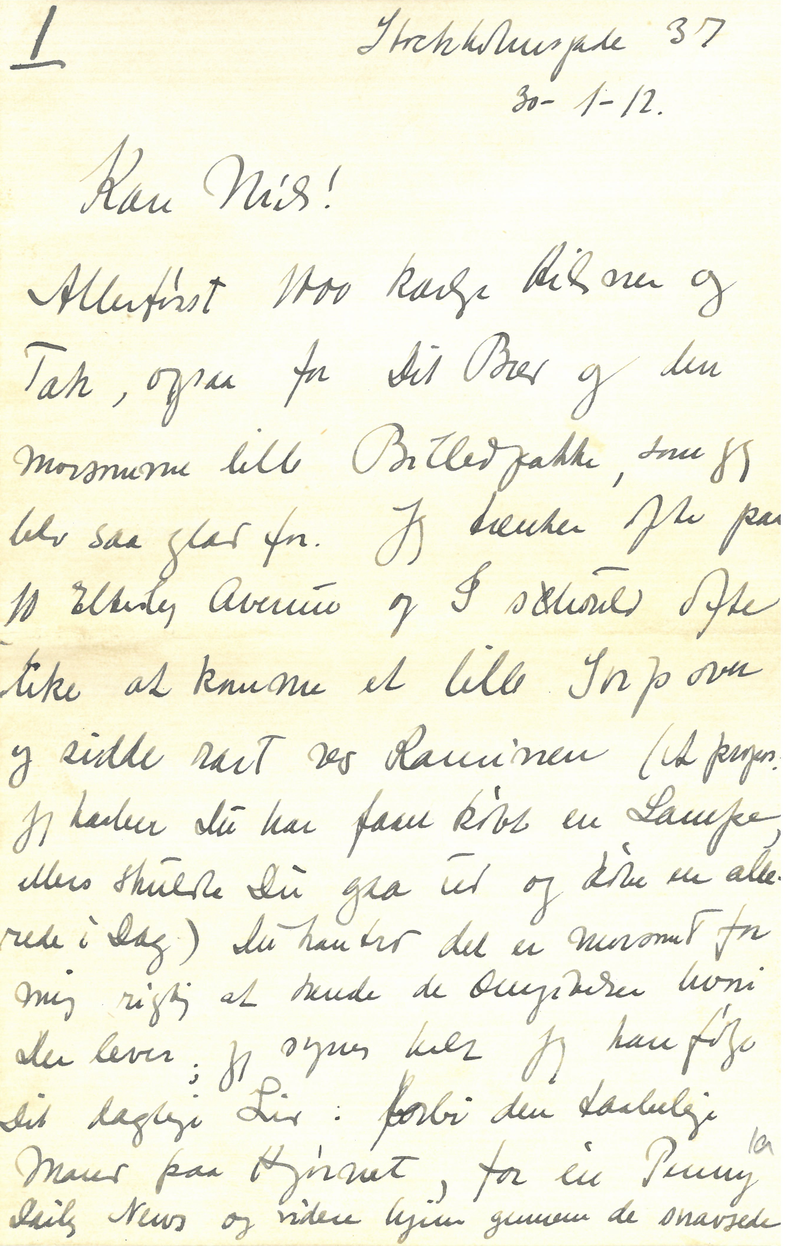 Allerførst 1000 kærlige Hilsner og Tak, ogsaa for Dit Brev og den morsomme lille Billedpakke, som jeg blev saa glad for. Jeg tænker ofte paa 10 Eltisley Avenue og I should often like at komme et lille Svip over og sidde rart ved Kaminen (A propos: jeg haaber Du har faaet købt en Lampe, ellers skulde Du gaa ud og købe en allerede i Dag). Du kan tro det er morsomt for mig rigtig at kende de Omgivelser hvori Du lever; jeg synes helt jeg kan følge Dit daglige Liv: forbi den taabelige Mand paa Hjørnet, for én Penny Daily News og videre hjem gennem de snavsede |Gader. Hils Owen, Biddey og Matematikerne mange Gange fra mig, hvis og naar Du ser dem.