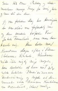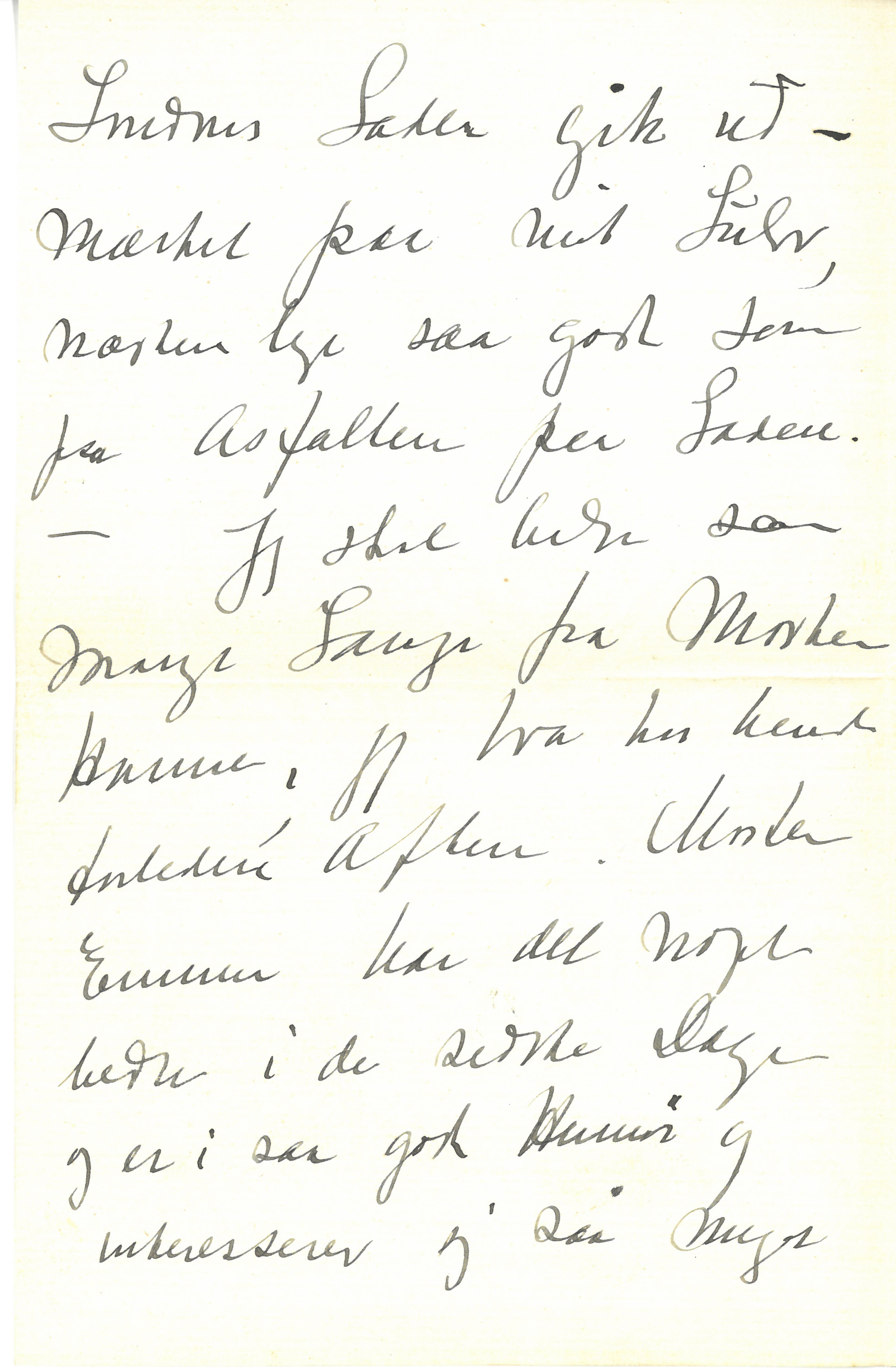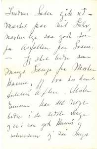 - Jeg skal hilse saa mange Gange fra Moster Hanna, jeg var hos hende forleden Aften. Moster Emma har det noget bedre i de sidste Dage og er i saa godt Humør og interesserer sig saa meget |for alt; men er jo ret svag. Det var forfærdelig pænt af Dig at skrive til Tante Otilia. Jenny var her i Søndags og er jo utrolig rask og sød og kærlig.