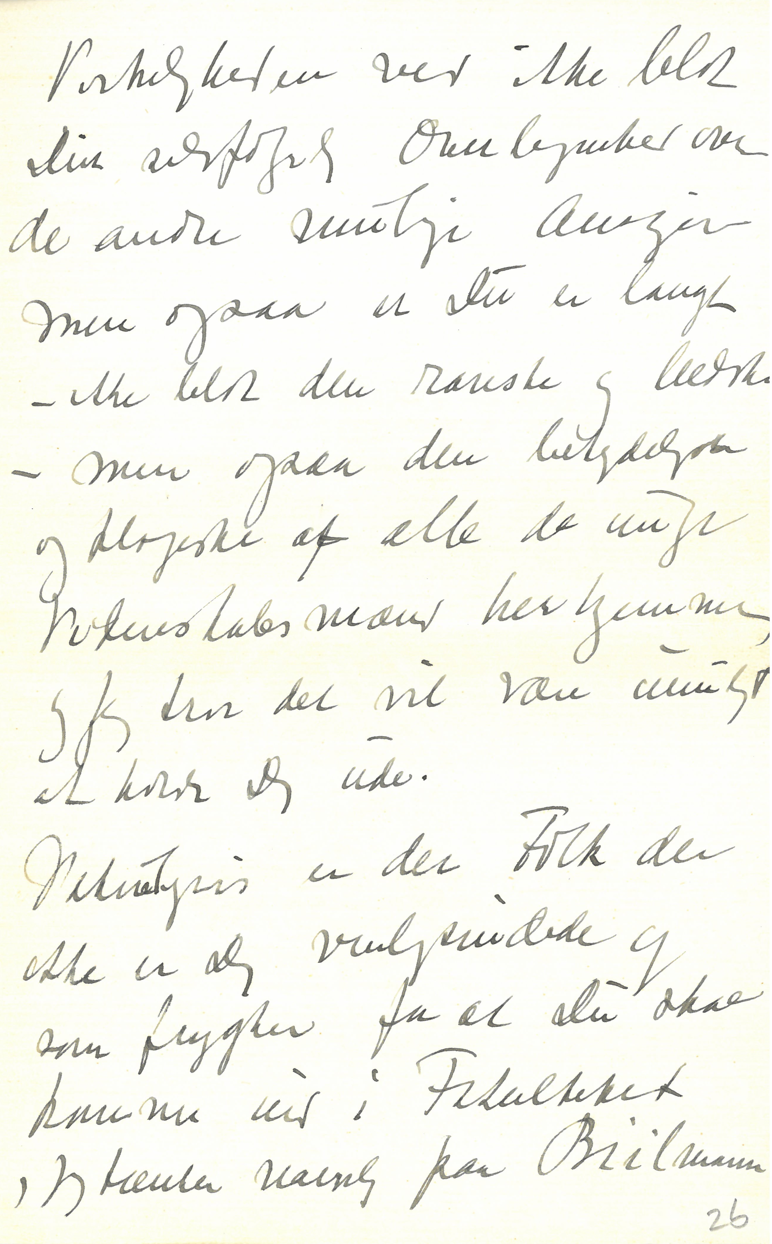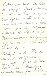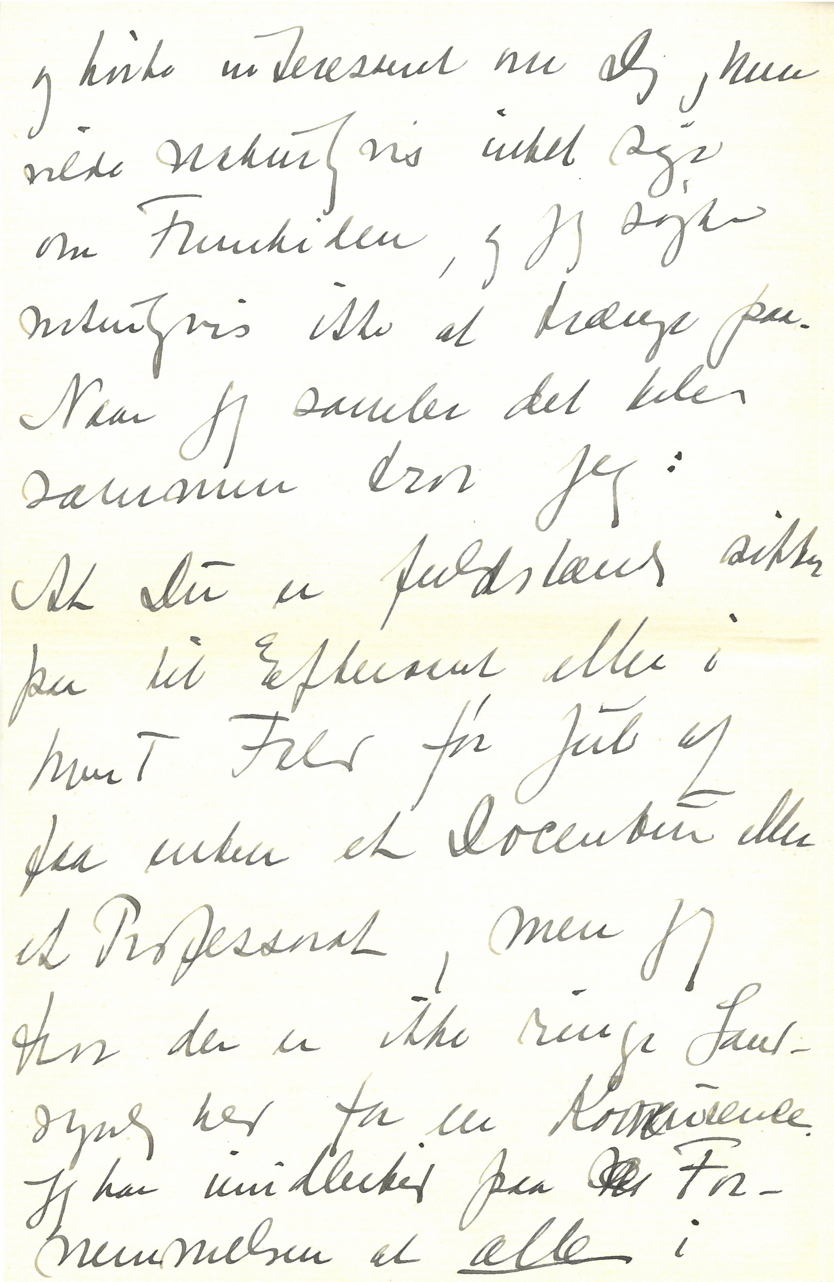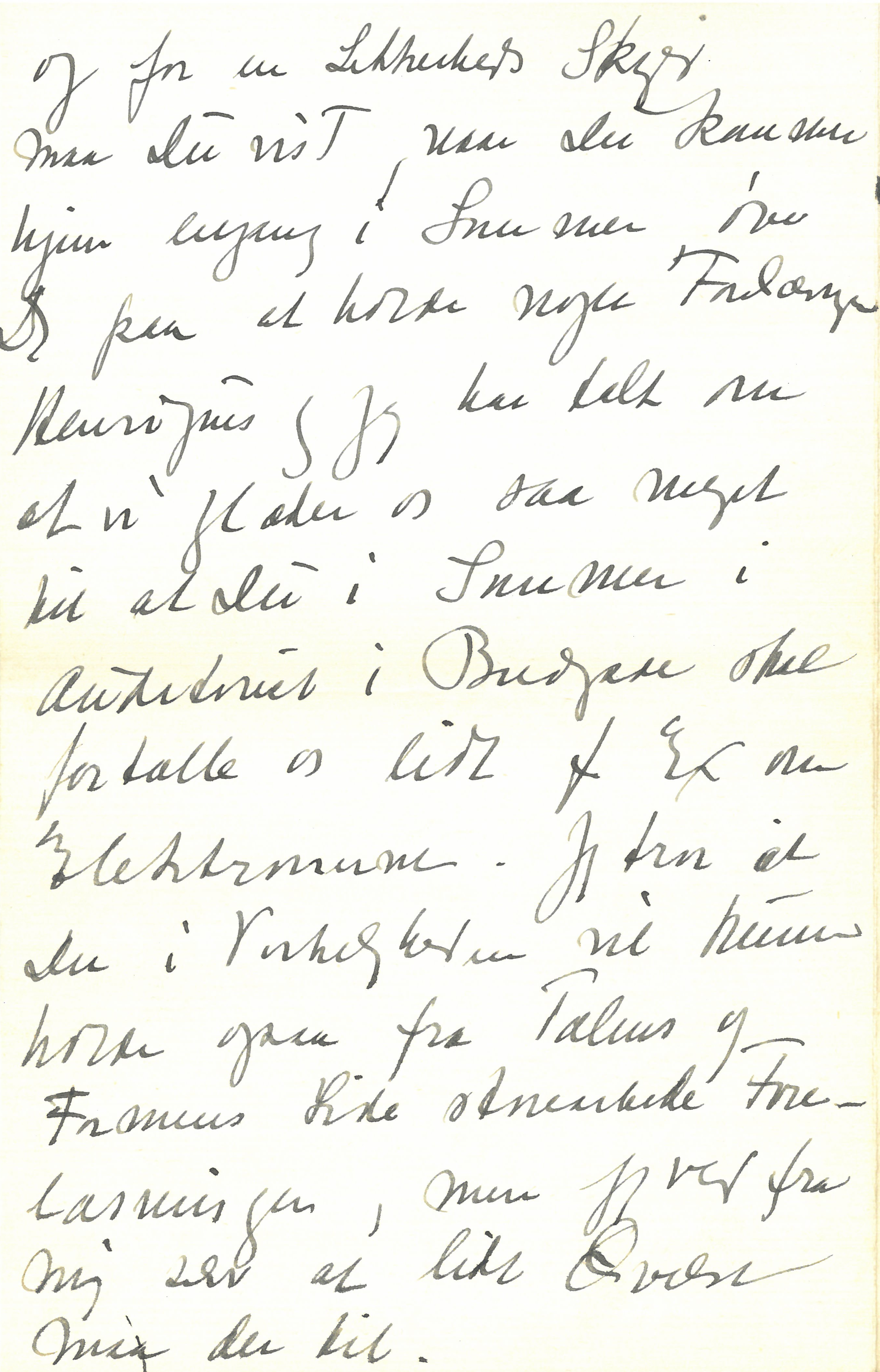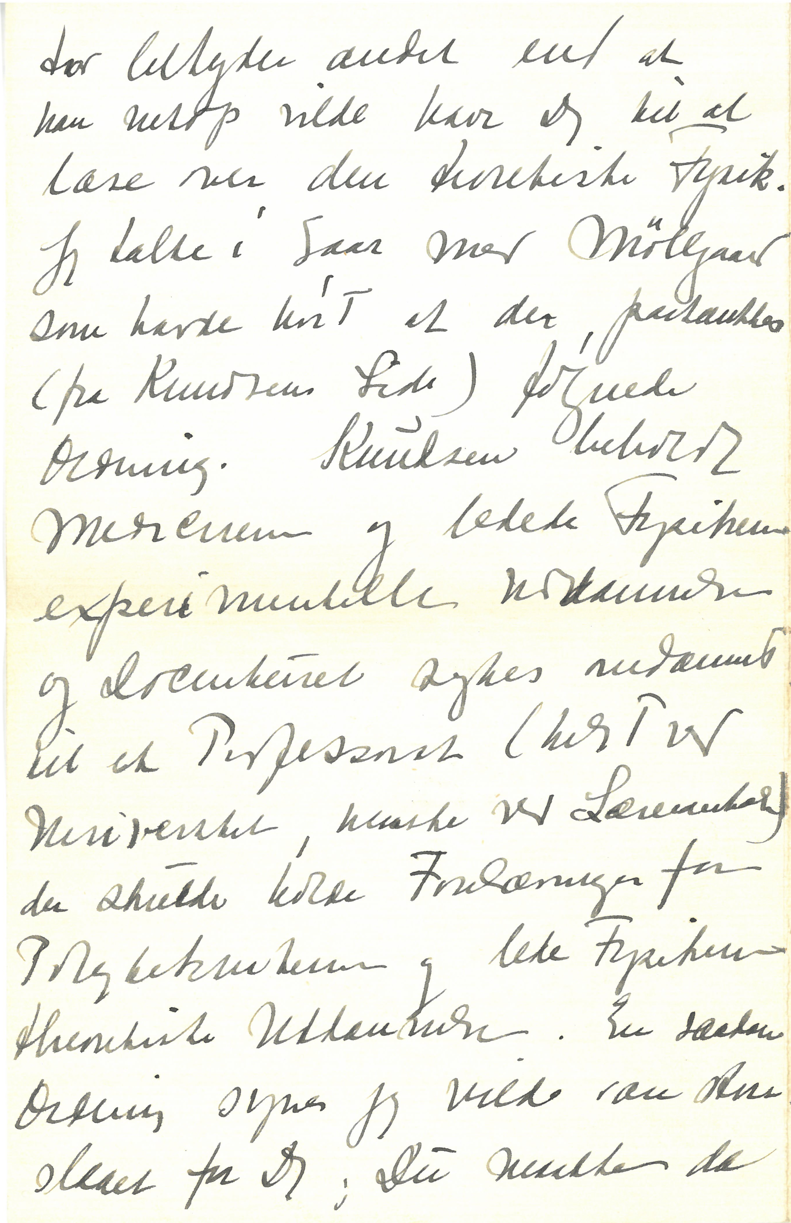Naturligvis er der Folk der ikke er Dig venligsindede og som frygter for at Du skal komme ind i Fakultetet, jeg tænker navnlig paa Biilmann |og for en Sikkerheds Skyld maa Du vist, naar Du kommer hjem engang i Sommer, øve Dig paa at holde nogle Forelæsninger. Henriques og jeg har talt om at vi glæder os saa meget til at Du i Sommer i Auditoriet i Bredgade skal fortælle os lidt f. Ex. om Elektronerne. Jeg tror at Du i Virkeligheden vil kunne holde ogsaa fra Talens og Formens Side storartede Forelæsninger, men jeg ved fra mig selv at lidt Øvelse maa der til.