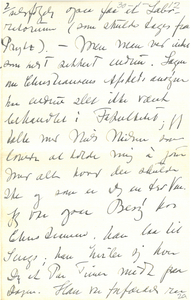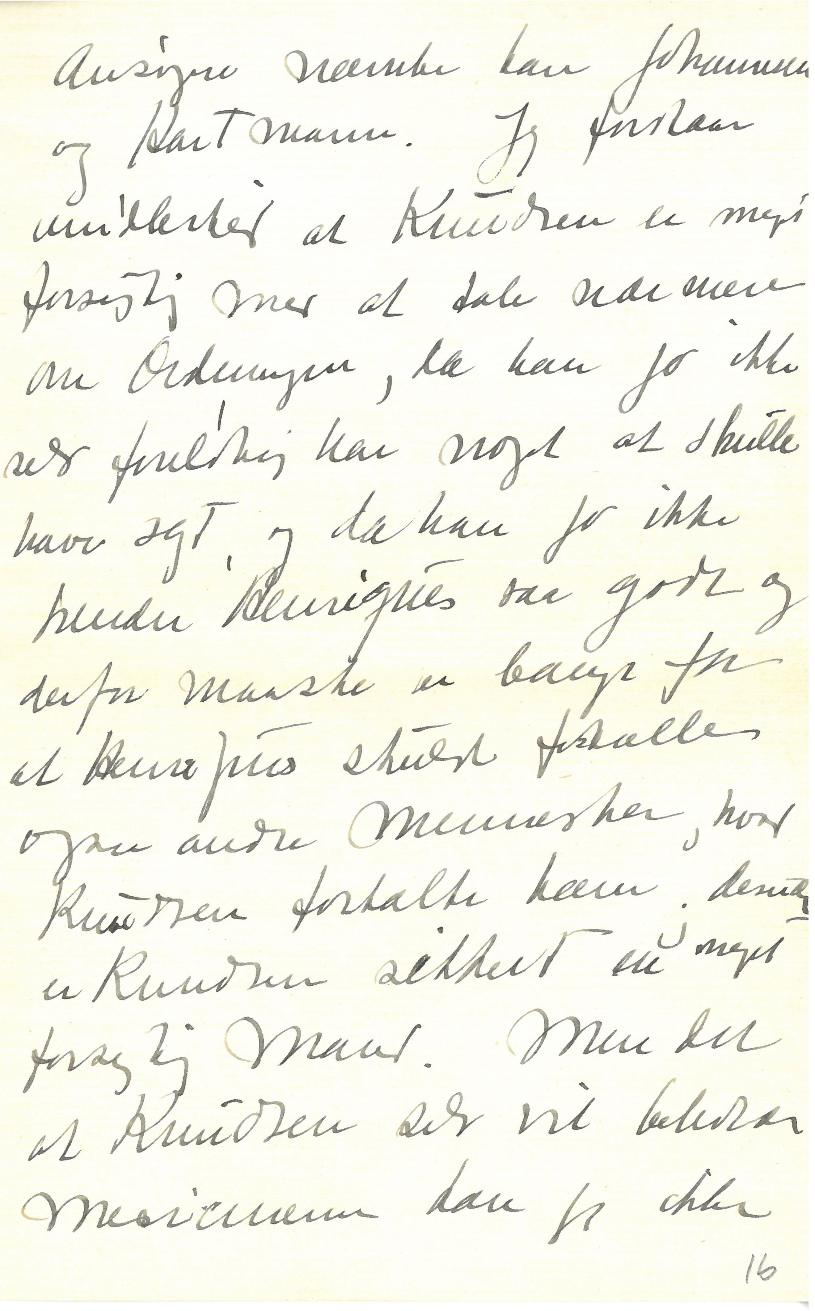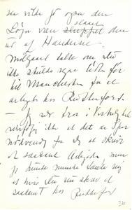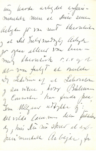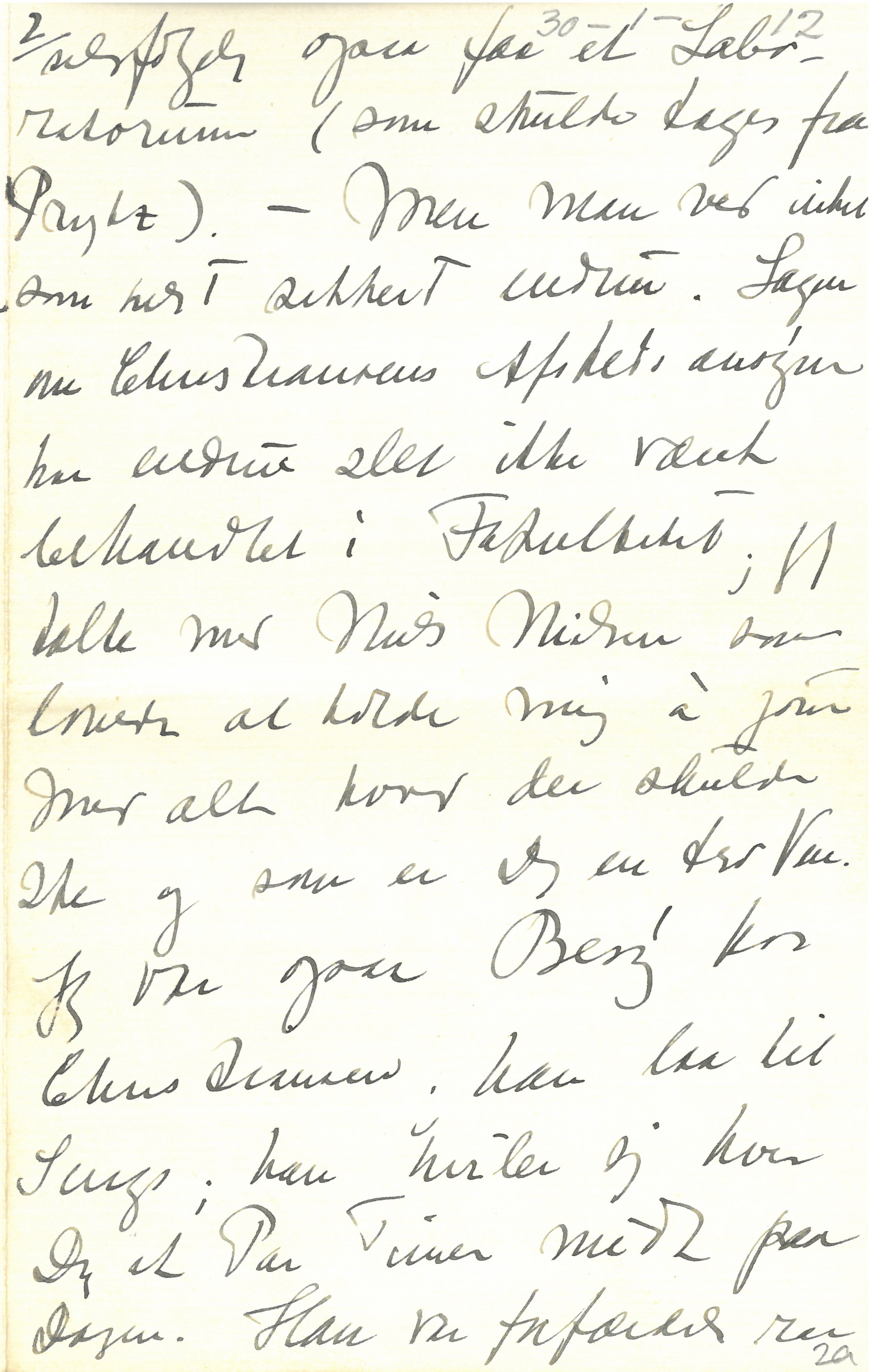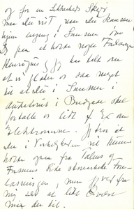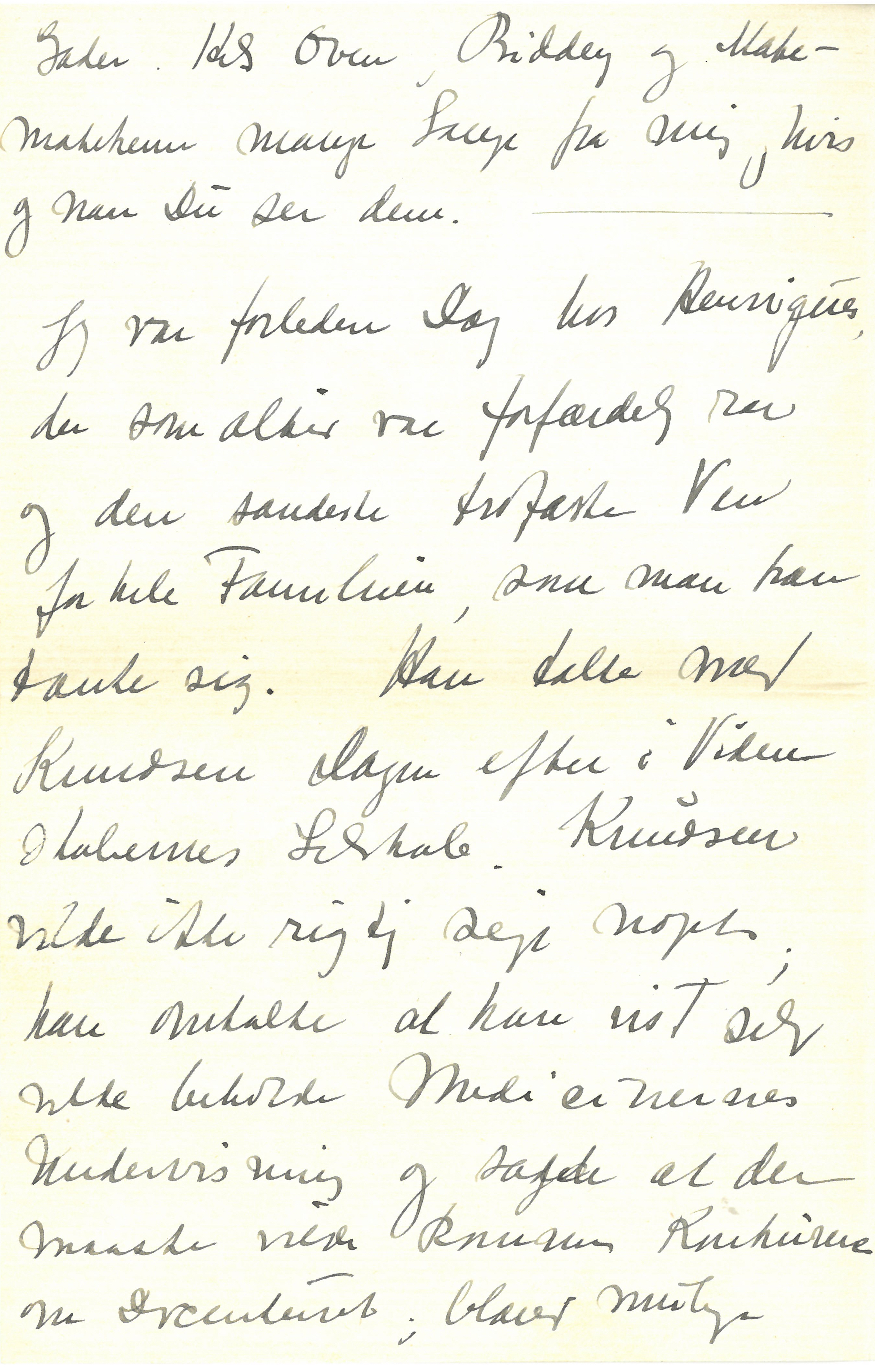 Naturligvis er der Folk der ikke er Dig venligsindede og som frygter for at Du skal komme ind i Fakultetet, jeg tænker navnlig paa Biilmann |og for en Sikkerheds Skyld maa Du vist, naar Du kommer hjem engang i Sommer, øve Dig paa at holde nogle Forelæsninger. Henriques og jeg har talt om at vi glæder os saa meget til at Du i Sommer i Auditoriet i Bredgade skal fortælle os lidt f. Ex. om Elektronerne. Jeg tror at Du i Virkeligheden vil kunne holde ogsaa fra Talens og Formens Side storartede Forelæsninger, men jeg ved fra mig selv at lidt Øvelse maa der til.