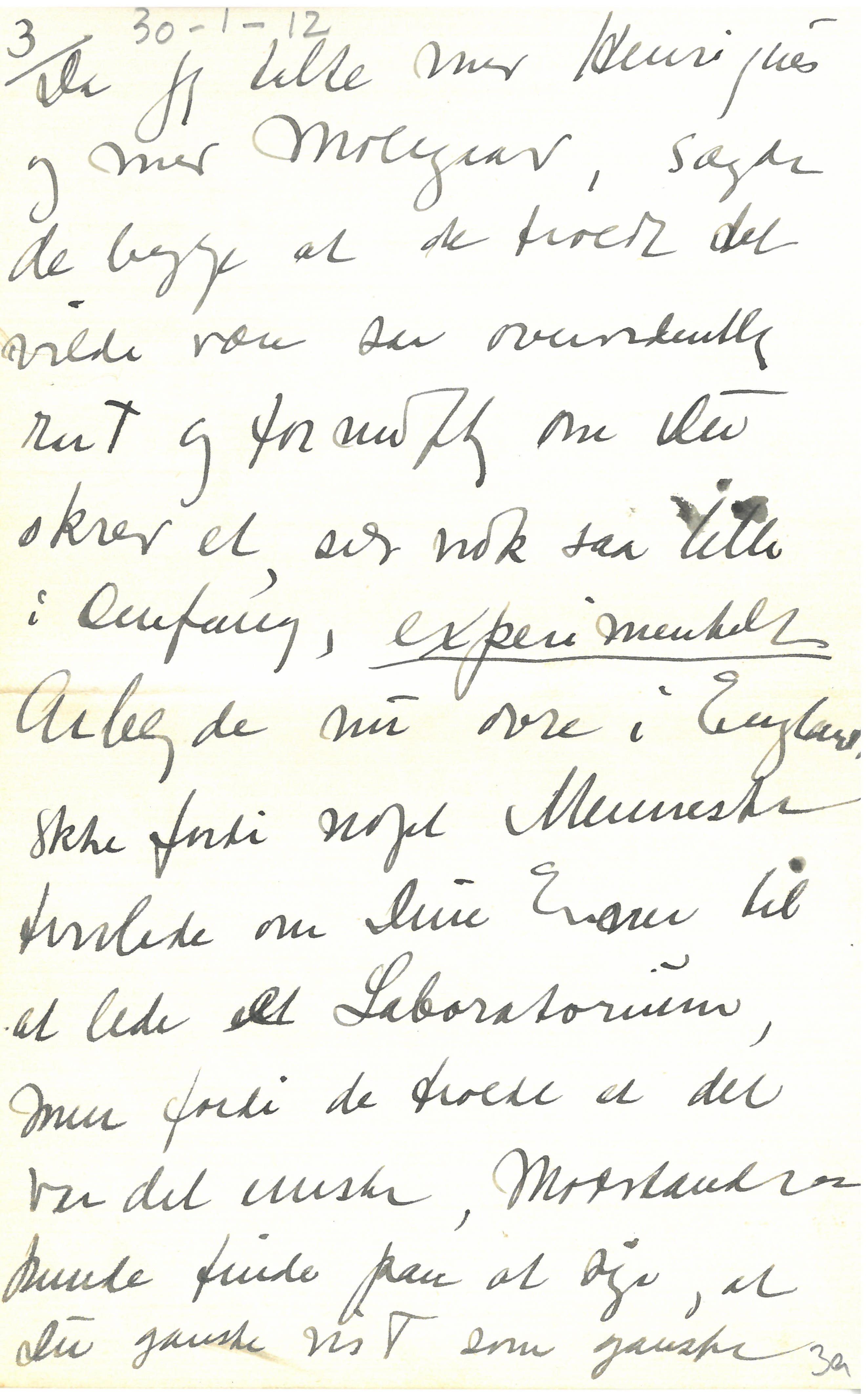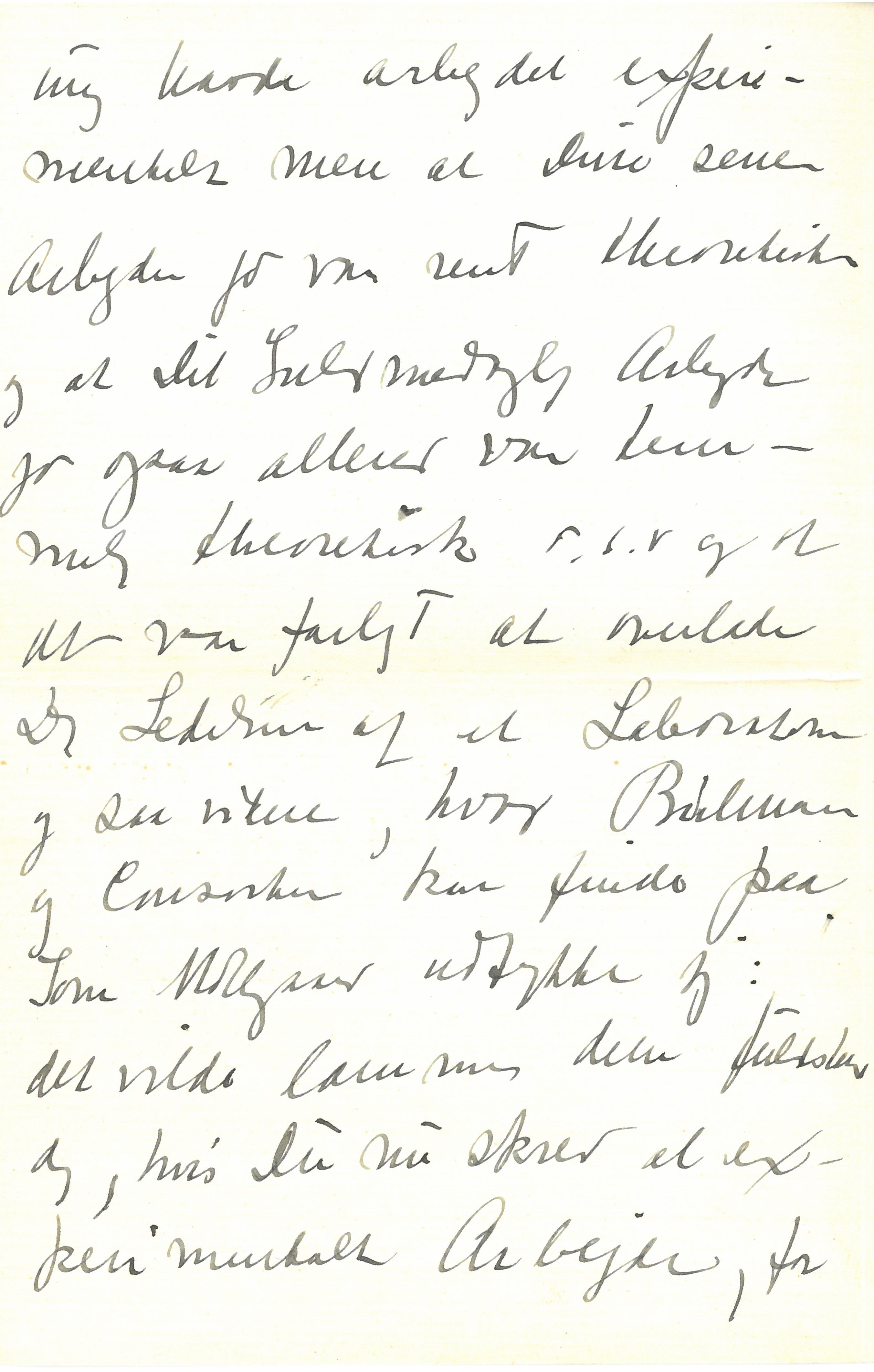 |Da jeg talte med Henriques og med Møllgaard, sagde de begge at de troede det vilde være saa overordentlig rart og fornuftigt om Du skrev et, selv nok saa lille i Omfang, experimentelt Arbejde nu ovre i England, ikke fordi noget Menneske tvivlede om Dine Evner til at lede et Laboratorium, men fordi de troede at det var det eneste, Modstanderne kunde finde paa at sige, at Du ganske vist som ganske |ung havde arbejdet experimentelt men at Dine senere Arbejder jo var rent theoretiske og at Dit Guldmedalje Arbejde jo ogsaa allerede var temmelig theoretisk o.s.v. og at det var farligt at overlade Dig Ledelsen af et Laboratorium og saa videre, hvad Biilmann og Consorter kan finde paa.