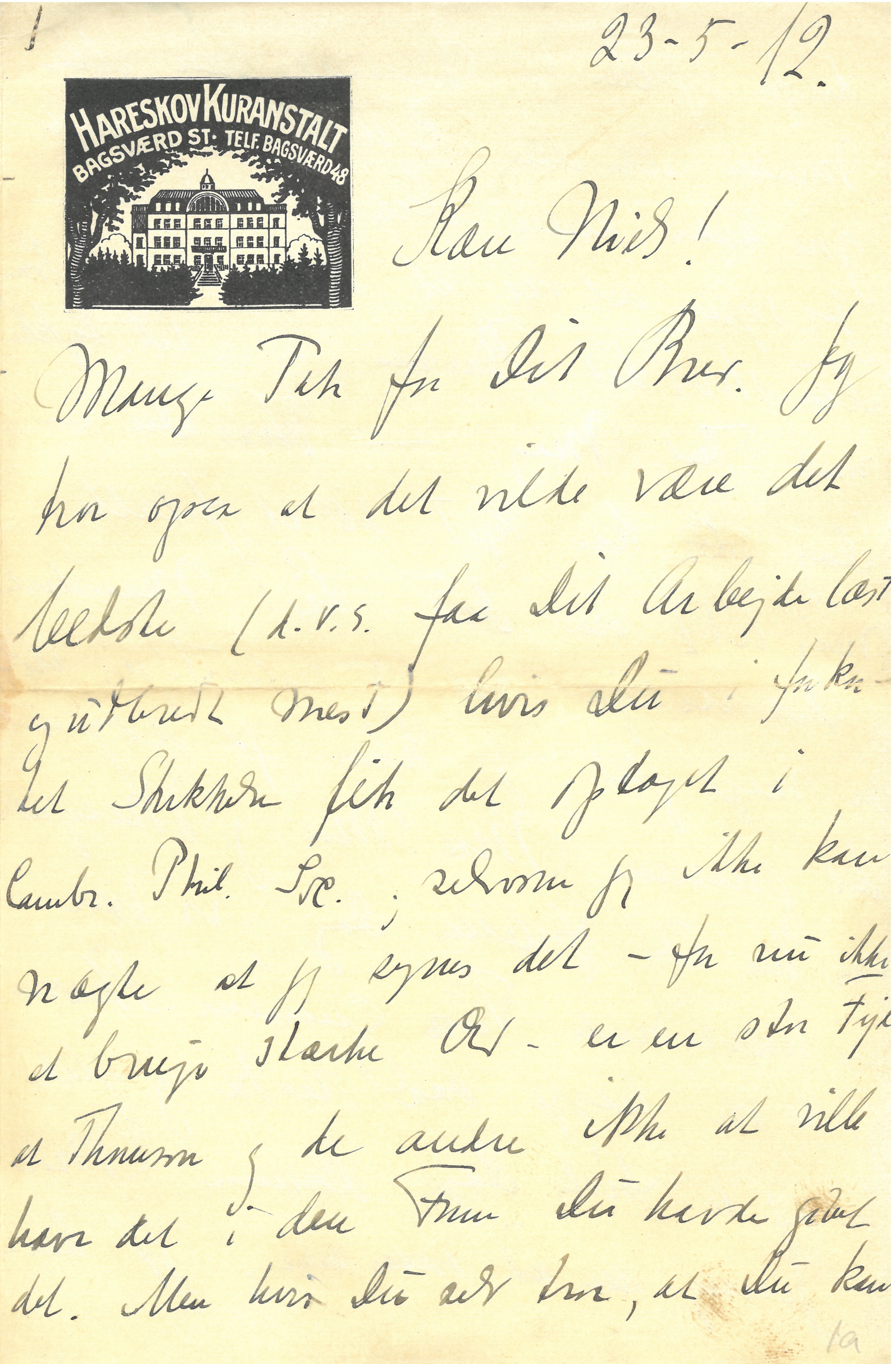 Jeg har dog lidt svært ved rigtig at raade Dig, da jeg jo slet ikke ved, hvor travlt Du har hos Rutherford og hvor vidt Du kan finde nogen Tid til Omredaktionen. Men, selvom det som Du skriver haster, og det gør det, saa gør det dog en stor Forskel at Du har offentliggjort Sagen paa Dansk og |derfor spiller en Maaned mer eller Mindre ikke den Rolle som det vilde gøre under andre Omstændigheder. – Jeg synes det var et udmærket Svar Du skrev til Barnes, og “Til Lykke” med Phil. Mag. – Hvis Du en Dag har Lyst til at fortælle mig lidt om Dit Liv i Manchester og Dit Arbejde vil jeg naturligvis blive meget glad; jeg hører jo dog en Del gennem Mor. Mor og Margrethe var her ude forleden Dag; vi var en henrivende Tur gennem Skoven og de var begge saa raske og glade. En af de første Dage kommer Mor og Jenny her ud sammen; jeg hen |ter dem med Vogn i Lyngby og kører dem en Tur i Omegnen. Jeg har en Del Besøg i den sidste Tid: Steffensen, Hjelmslev, Lautrup et. cet.; de har alle bedt mig hilse Dig naar jeg skrev. Med mit Helbred, eller for sige det lige ud, min Mave, gaar det fremad, men lidt langsomt. Jeg haaber dog den snart vil makke helt ret og glæder mig til at komme til Byen og tage fat i Juni; der er en Del jeg gerne vilde have gjort færdig – og saa er der jo Examen. – Jeg glæder mig saameget til at træffe Niels Erik og ogsaa gennem ham høre lidt fra Dig.