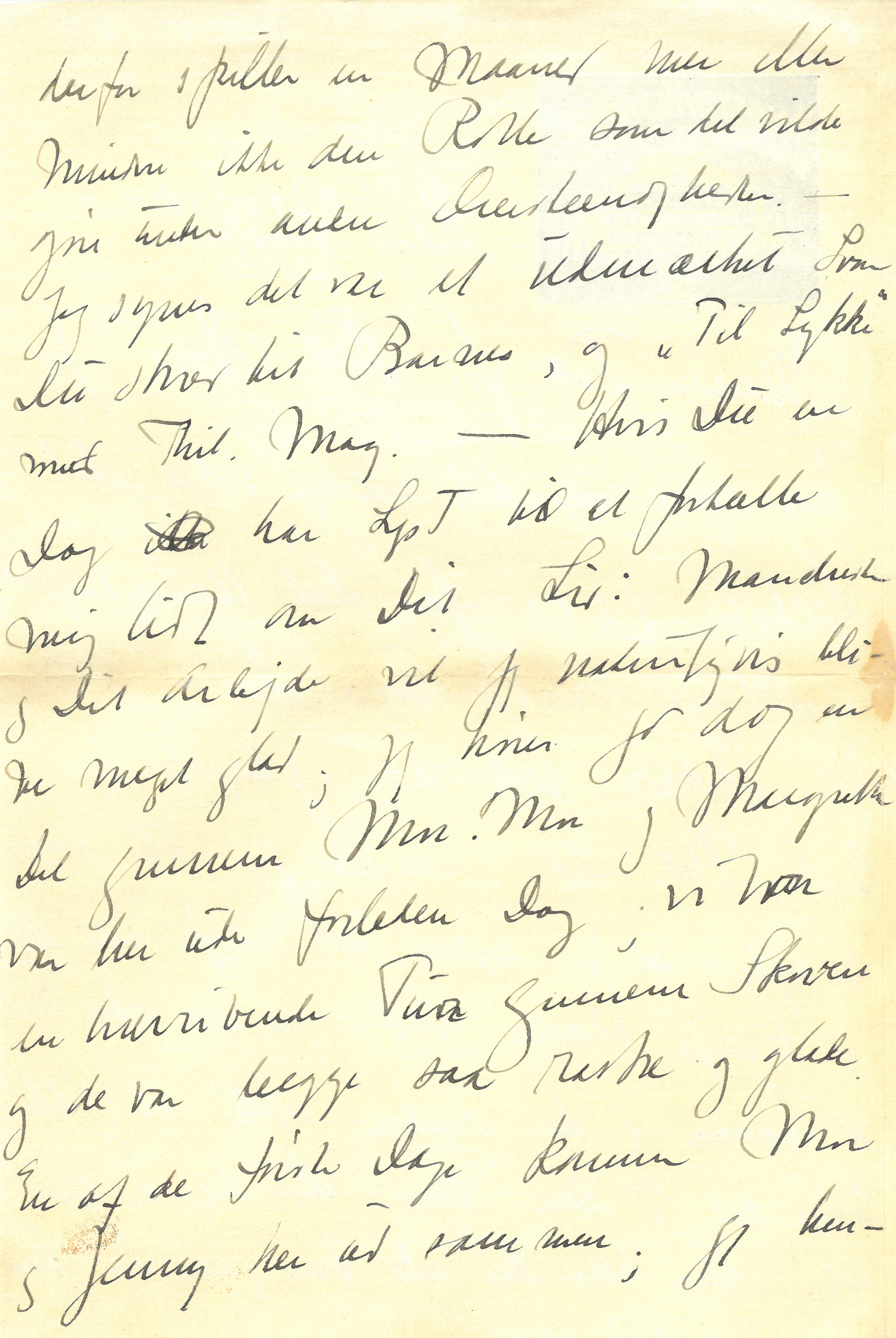 Mange Tak for Dit Brev. Jeg tror ogsaa at det vilde være det bedste (d.v.s. faa Dit Arbejde læst og udbredt mest) hvis Du i forkortet Skikkelse fik det optaget i Camb. Phil. Soc.; selvom jeg ikke kan nægte at jeg synes det – for nu ikke at bruge stærke Ord – er en stor Fejl at Thomson og de andre ikke at ville have det i den Form Du havde givet det. Men hvis Du selv tror, at Du kun |kan forkorte Arbejdet med c. Halvdelen uden at vanskeliggøre Sagkyndige Læsningen, synes jeg absolut det, som Sagen nu staar, vilde være det bedste.