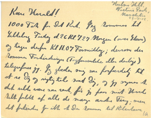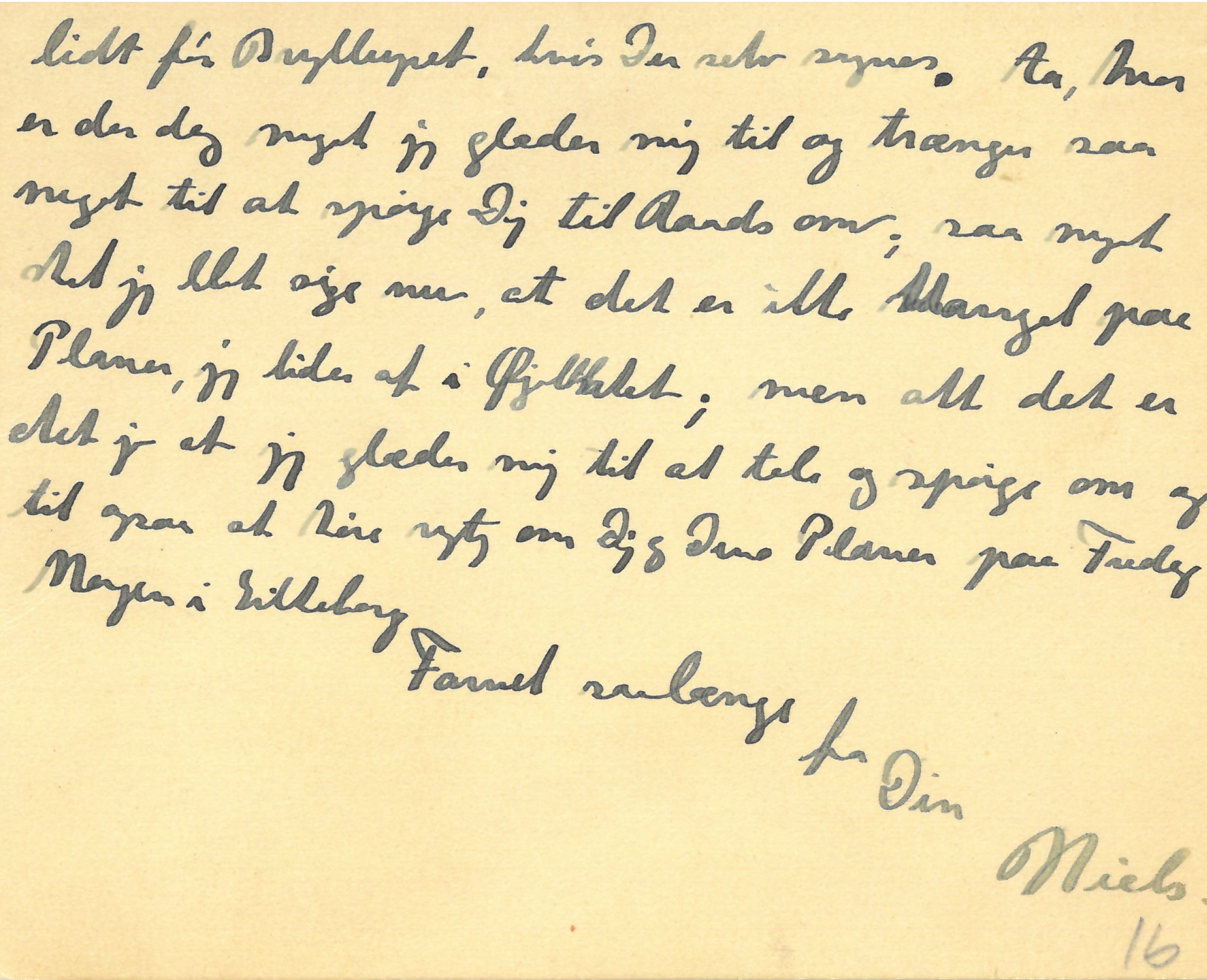 1000 Tak for Dit Kort. Jeg kommer til Silkeborg Fredag d. 26 Kl. 7.27 Morgen (over Skern) og tager derfra Kl. 11.07 Formiddag; dersom der kommer Forhindringer (Togforsinkelse eller deslige) telegraferer jeg. Jeg glæder mig saa forfærdelig til at se Dig og rigtig tale med Dig, og jeg synes at det vilde være saa rart, før jeg faar mit Hovede helt fuldt af alle de mange andre Ting; men det forhindrer jo ikke at Du kommer til København |lidt før Brylluppet, hvis Du selv synes. Aa, hvor er der dog meget jeg glæder mig til og trænger saa meget til at spørge Dig til Raads om; saa meget skal jeg blot sige nu, at det er ikke Mangel paa Planer, jeg lider af i Øjeblikket; men alt det er det jo at jeg glæder mig til at tale og spørge om og til ogsaa at høre rigtig om Dig og Dine Planer paa Fredag Morgen i Silkeborg.