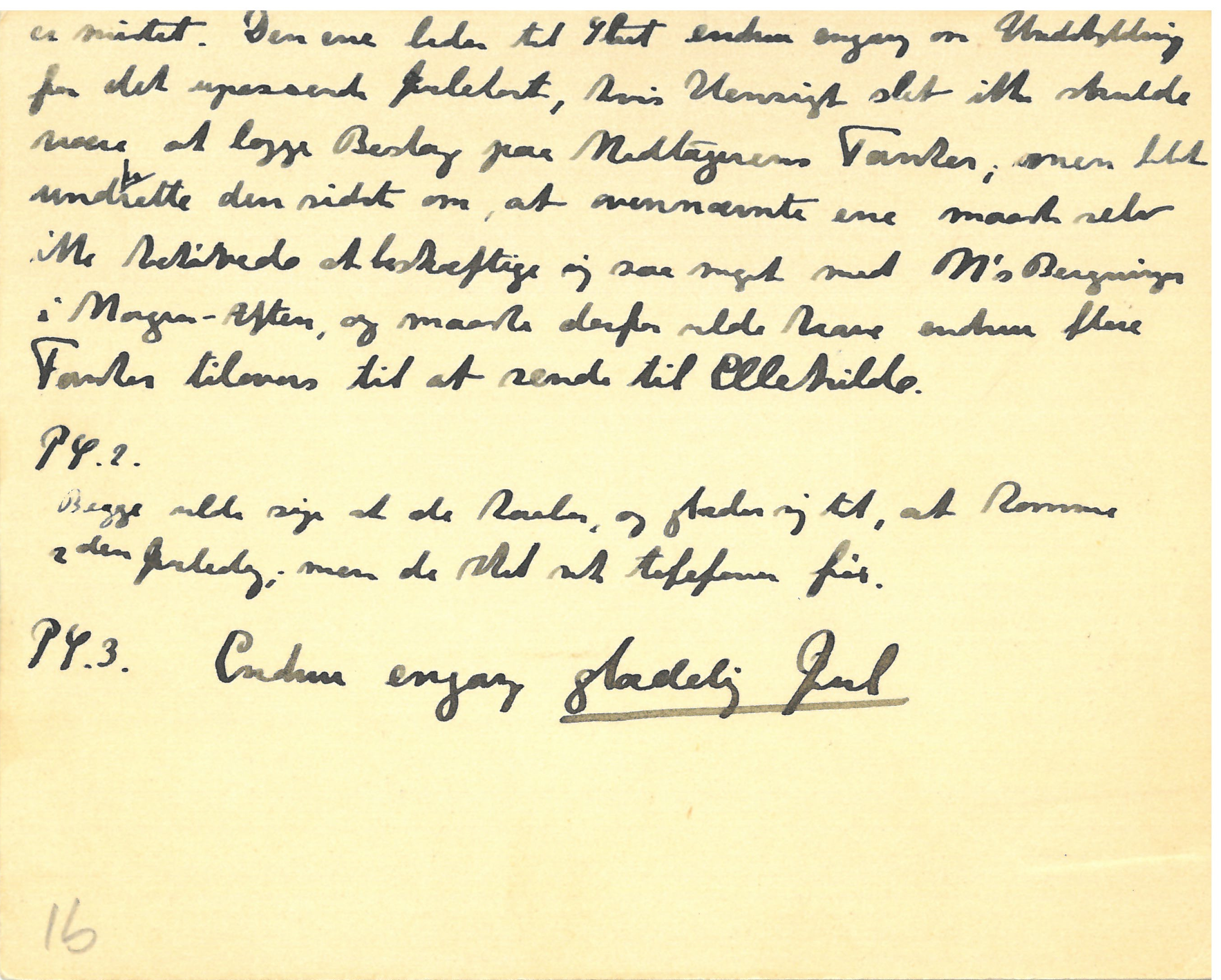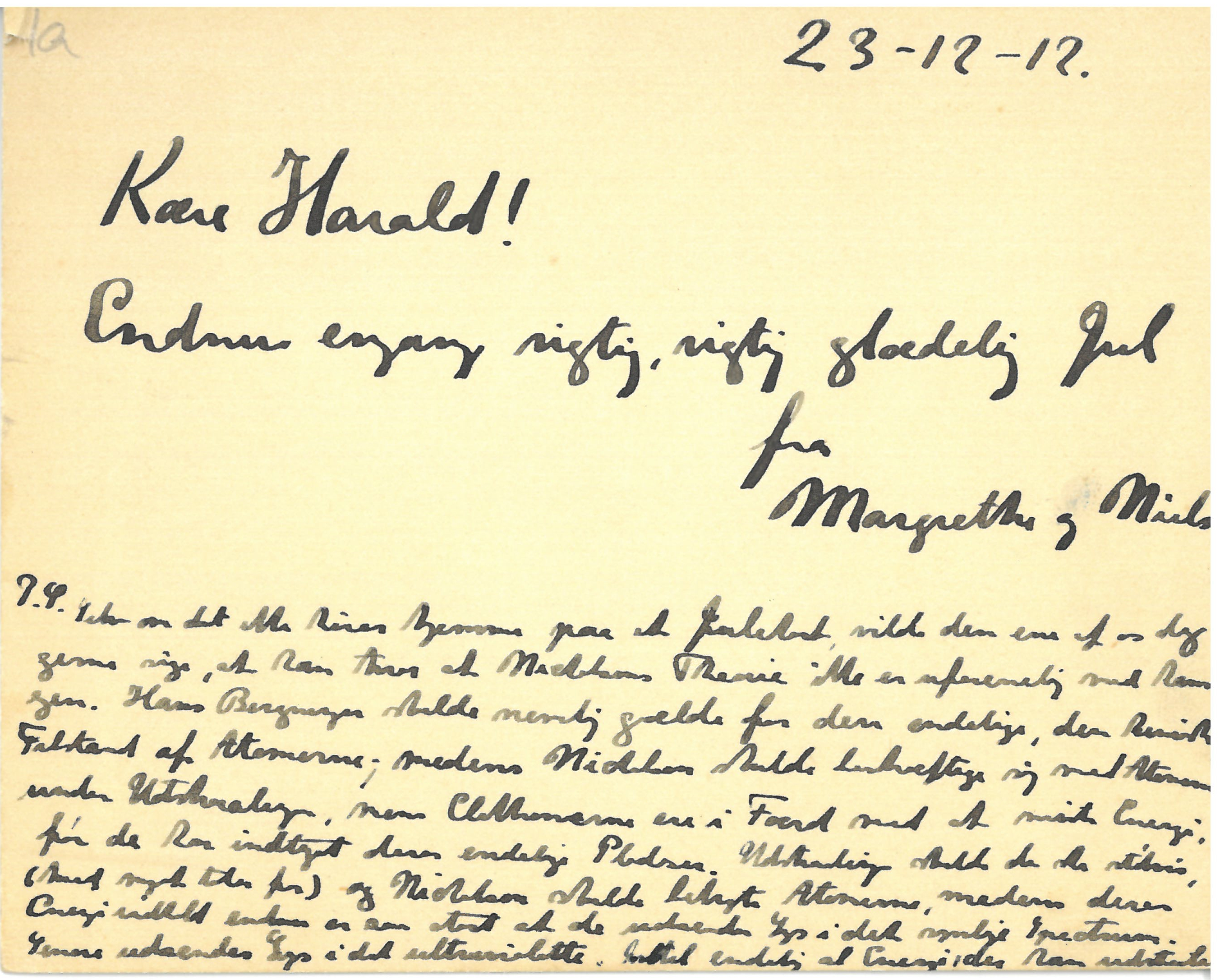 P.S. Selv om det ikke hører hjemme paa et Julekort, vilde den ene af os dog gerne sige, at han tror at Nicholsons Theorie ikke er uforenelig med hans egen. Hans Beregninger skulde nemlig gælde for den endelige, den klassiske, Tilstand af Atomerne; medens Nicholson skulde beskæftige sig med Atomerne under Udstraalingen, mens Elektronerne er i Færd med at miste Energi, før de har indtaget deres endelige Pladser. Udstraalingen skulde da ske stødvis, (hvad meget taler for) og Nicholson skulde betragte Atomerne, medens deres Energiindhold endnu er saa stort at de udsender Lys i det synlige Spectrum. Senere udsendes Lys i det ultraviolette. Indtil endelig al Energi, der kan udstraales |er mistet. Den ene beder til Slut endnu engang om Undskyldning for det upassende Julekort, hvis Hensigt slet ikke skulde være at lægge Beslag paa Modtagerens Tanker; men blot underrette den sidste om, at ovennævnte ene maaske selv ikke behøvede at beskæftige sig saa meget med N’s Beregninger i Morgen-Aften, og maaske derfor vilde have endnu flere Tanker tilovers til at sende til Ellekilde.