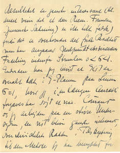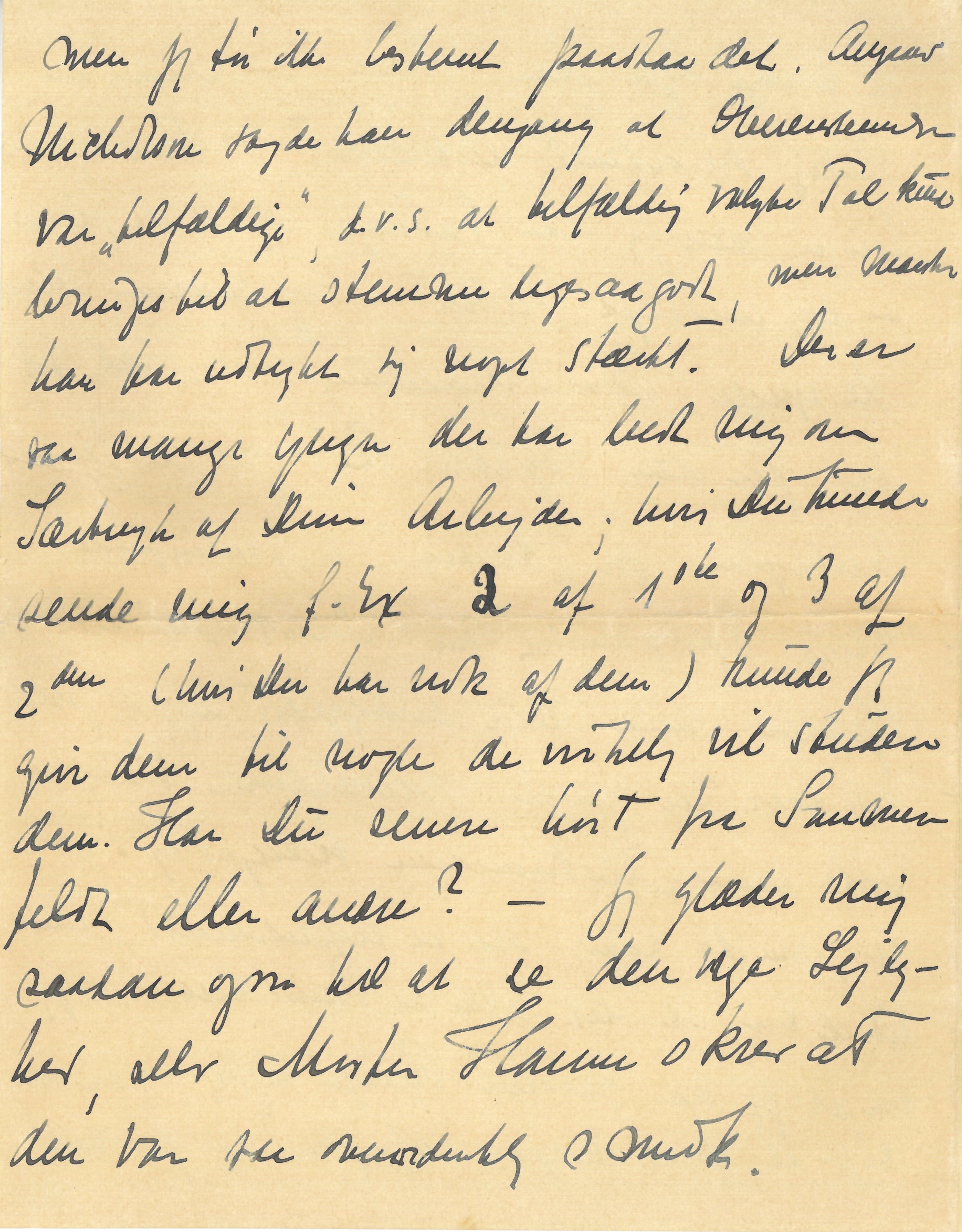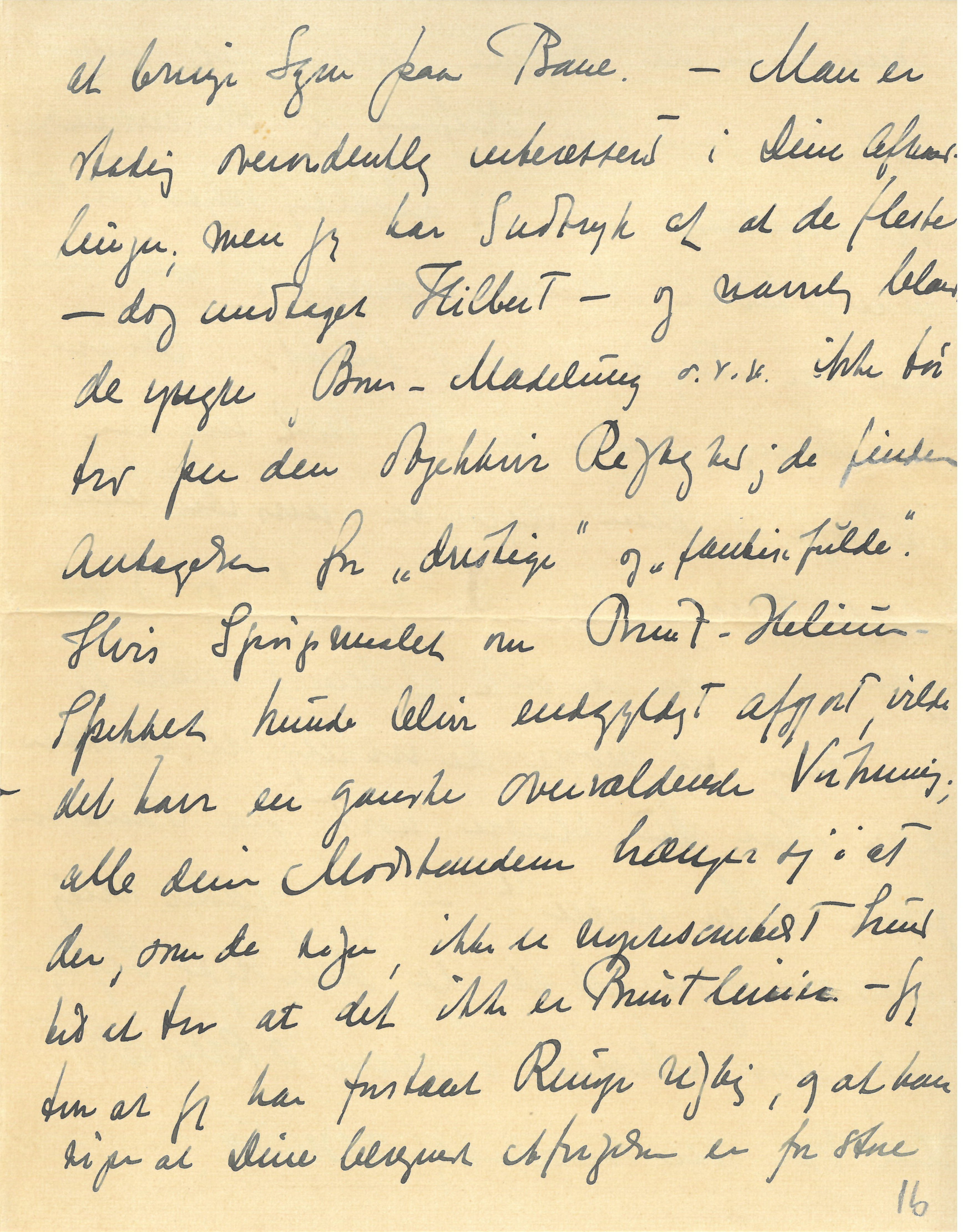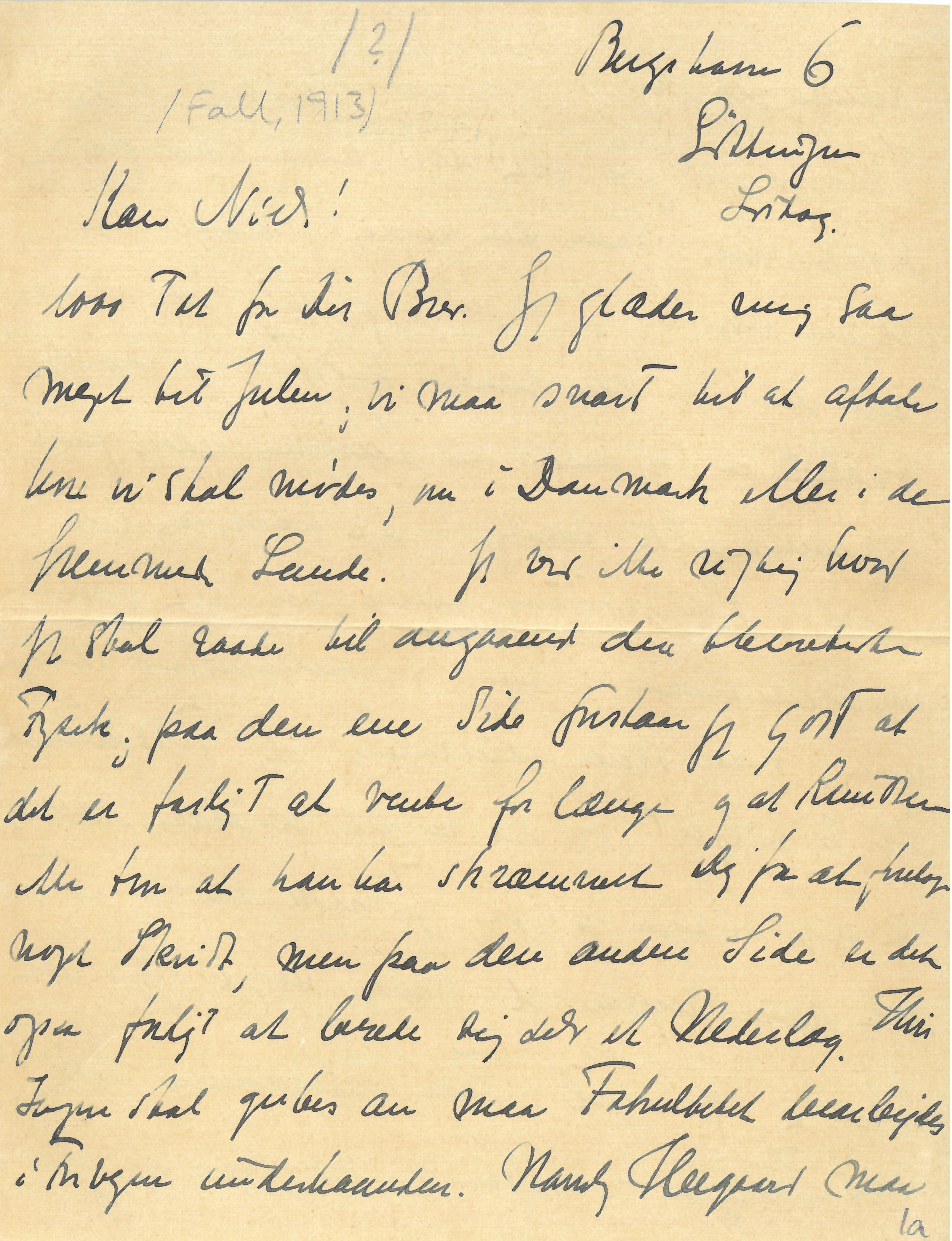 1000 Tak for Dit Brev. Jeg glæder mig saa meget til Julen; vi maa snart til at aftale hvor vi skal mødes, nu i Danmark eller i de fremmede Lande. Jeg ved ikke rigtig hvad jeg skal raade til angaaende den teoretiske Fysik; paa den ene Side forstaar jeg godt at det er farligt at vente for længe og at Knudsen ikke tror at han har skræmmet Dig fra at foretage noget Skridt, men paa den anden Side er det ogsaa farligt at berede Dig selv et Nederlag. Hvis Sagen skal gribes an maa Fakultetet bearbejdes i Forvejen underhaanden. Navnlig Heegaard maa |kunne hjælpe og jeg har Indtryk af at Heegaard vil gøre alt hvad han kan for at støtte Dig. Kan Du rigtig forklare Henriques hvor vigtig Sagen er for Dig; han er dog den der her kan raade bedst. Jeg tror det farligste er at sende en Ansøgning uden først – gennem alle mulige – at have agiteret, ogsaa i Konsistorium; ellers gaar det som da Christiansen i sin Tid behandlede Ansøgning: man skrev uden videre at Tidspunktet ikke er belejligt, og saa er det dobbelt vanskeligt at tage Sagen op igen. Jeg vilde ikke tro at det kan nytte at foretage noget officielt Skridt før Jul. Har Salomonsen talt med Heegaard? ellers var det maaske godt |at bringe Sagen paa Bane. – Man er stadig overordentlig interesseret i Dine Afhandlinger; men jeg har Indtryk af at de fleste – dog undtaget Hilbert – og navnlig blandt de yngre Born – Madelung o.s.v. ikke tør tro paa den objektive Rigtighed; de finder Antagelserne for “dristige” og “fantasifulde”. Hvis Spørgsmaalet om Brint-Helium-Spektret kunde blive endgyldigt afgjort, vilde det have en ganske overvældende Virkning; alle dine Modstandere hænger sig i at der, som de siger, ikke er nogetsomhelst Grund til at tro at det ikke er Brintlinier. – Jeg tror at jeg har forstaaet Runge rigtig, og at han siger at Dine beregnede Afvigelser er for store |men jeg tør ikke bestemt paastaa det. Angaaende Nicholson sagde han dengang at Overensstemmelserne var “tilfældige”, d.v.s. at tilfældig valgte Tal kunde bruges til at stemme ligesaa godt, men maaske han har udtrykt sig noget stærkt. Der er saa mange yngre der har bedt mig om Særtryk af Dine Arbejder; hvis Du kunde sende mig f.Ex 2 af 1ste og 3 af 2den (hvis Du har nok af dem) kunde jeg give dem til nogle der virkelig vil studere dem. Har Du senere hørt fra Sommerfeldt eller andre? – Jeg glæder mig saadan ogsaa til at se den nye Lejlighed, selv Moster Hanne skrev at den var saa overordentlig smuk.