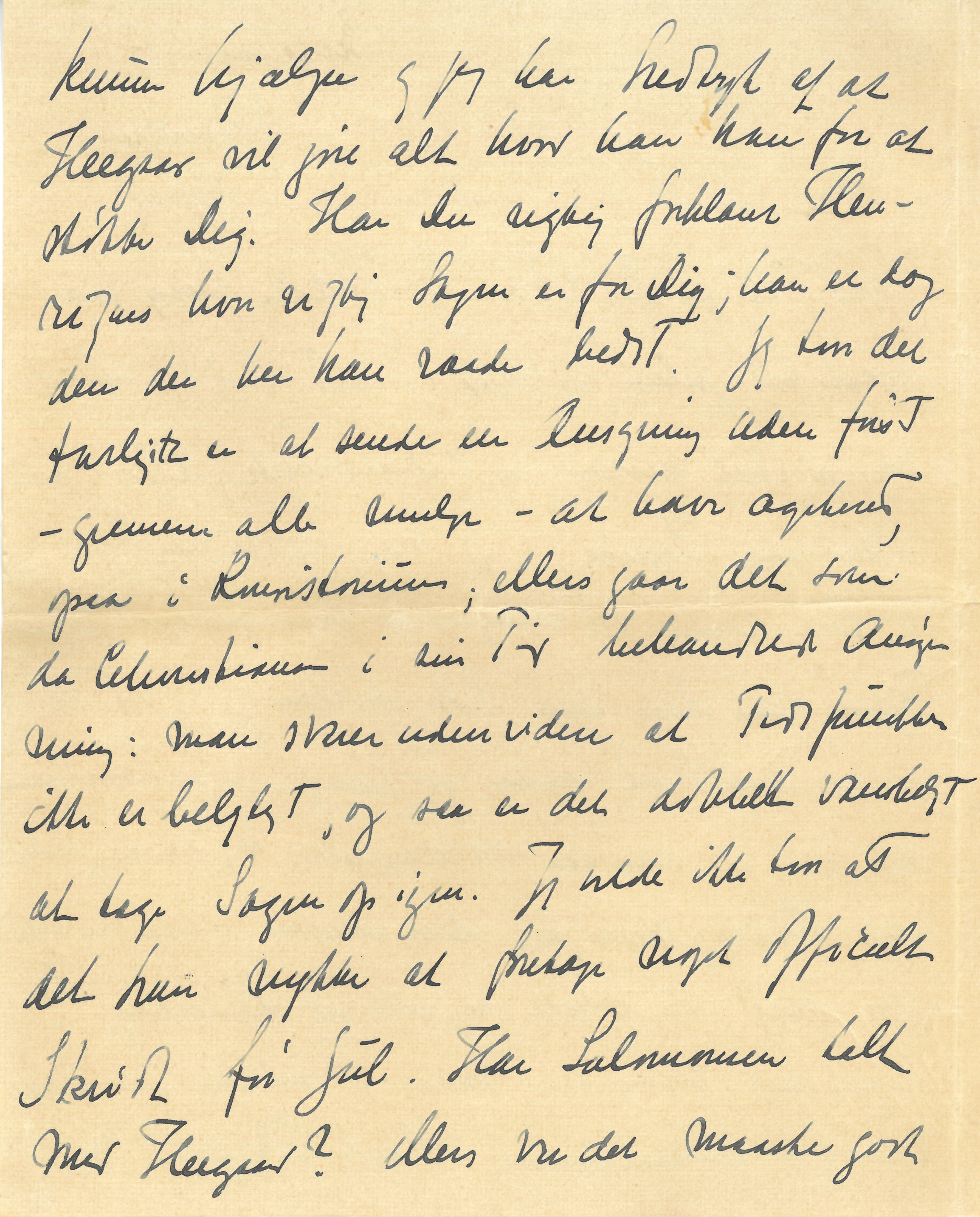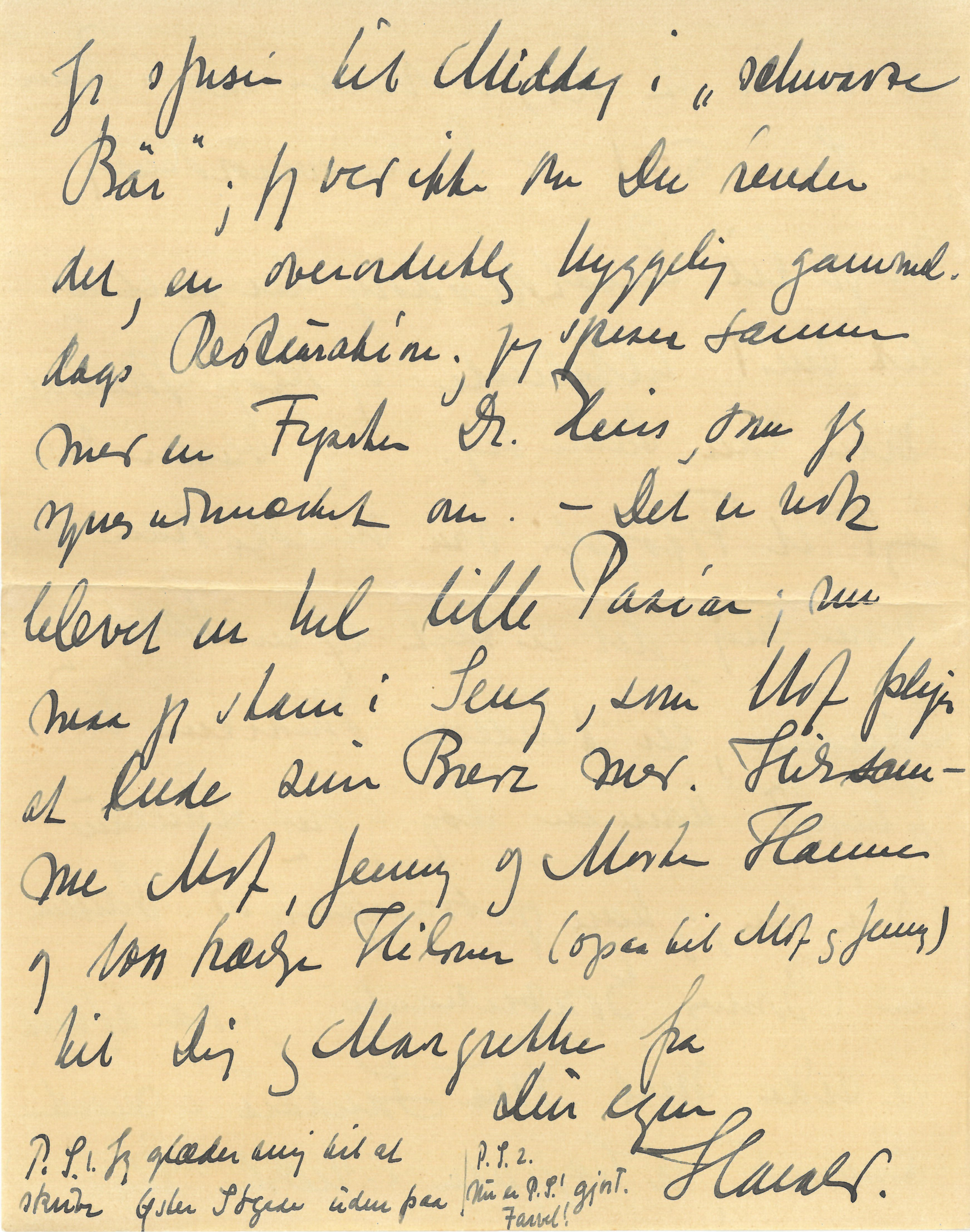|Jeg spiser til Middag i “schwarze Bär”; jeg ved ikke om Du kender det, en overordentlig hyggelig gammeldags Restauration; jeg spiser sammen med en Fysiker Dr. Hein , som jeg synes udmærket om. – Det er nok blevet en hel lille Pasiar; nu maa jeg skam i Seng, som Mof plejer at ende sine Breve med. Hils samme Mof, Jenny og Moster Hanne og 1000 kærlige Hilsner (ogsaa til Mof og Jenny) til Dig og Margrethe fra