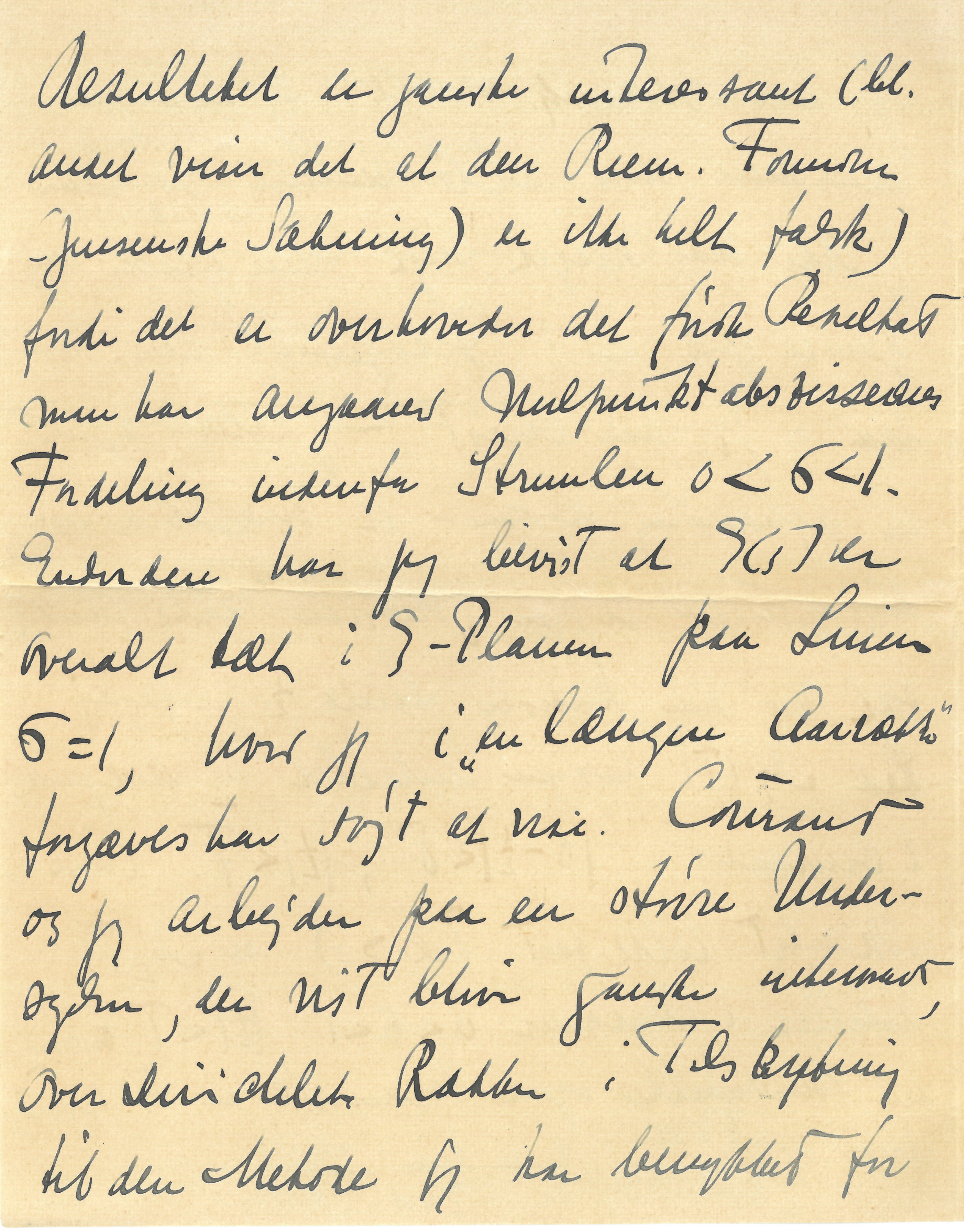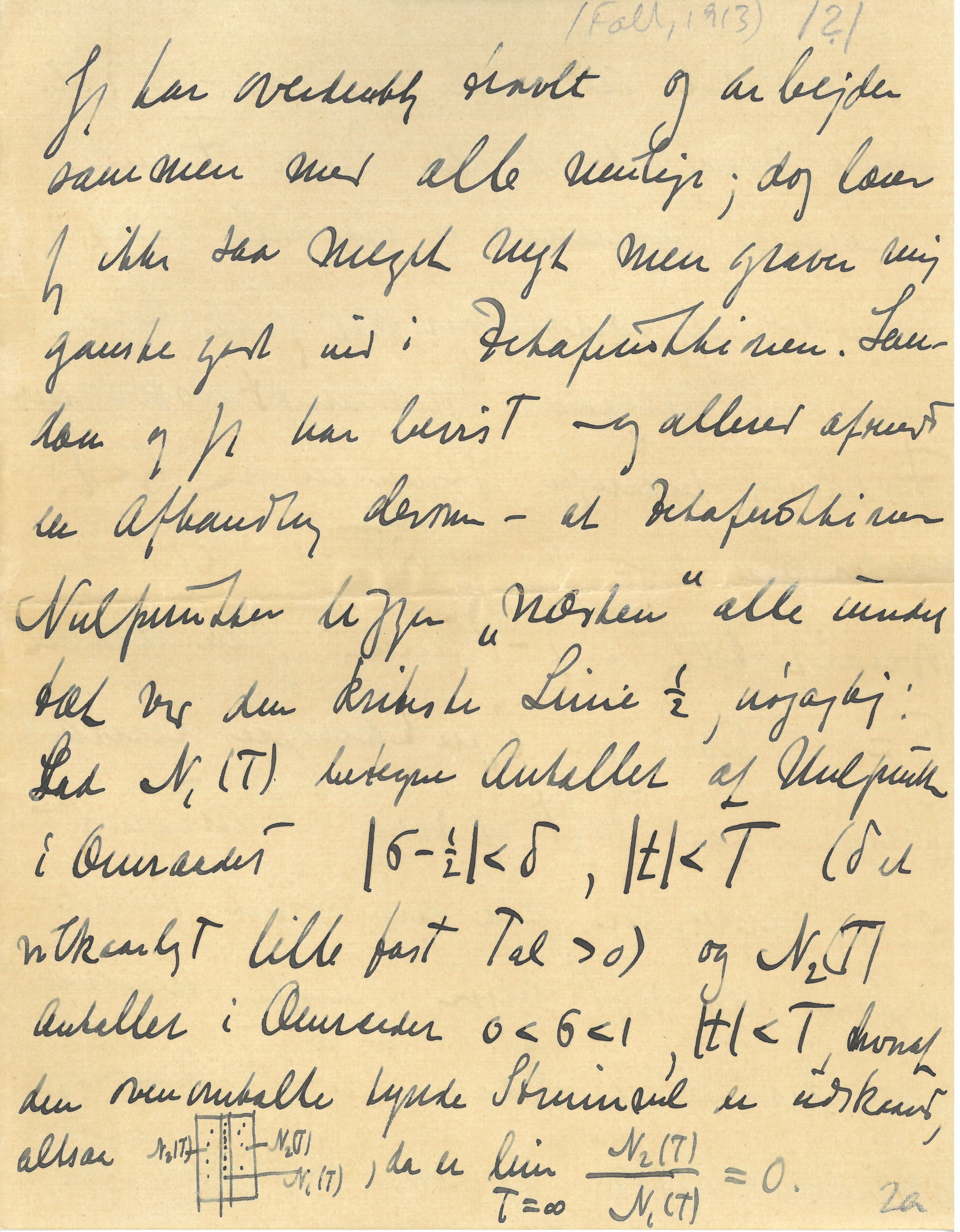 |Jeg har overordentlig travlt og arbejder sammen med alle mulige; dog læser jeg ikke saa meget nyt men graver mig ganske godt ned i Zetafunktionen. Landau og jeg har bevist – og allerede afleveret en Afhandling derom – at Zetafunktionens Nulpunkter ligger “næsten” alle under tæt ved den kritiske Linie \(\frac{1}{2}\), nøjagtig: Lad \(N_1(T)\) betegne Antallet af Nulpunkter i Omraadet \(|\sigma-\frac{1}{2}|<\delta, \hspace{0.2 cm}|t|<T\) (\(\delta\) et vilkaarligt lille fast Tal \(> 0\)) og \(N_2(T)\) Antallet i Omraadet \(0 < \sigma < 1\), \(|t|< T\), hvoraf den ovenomtalte tynde Strimmel er udskaaret, altsaa [TEGNING], da er \(\lim_{T=\infty}\frac{N_2(T)}{N_1(T)}=0\).
