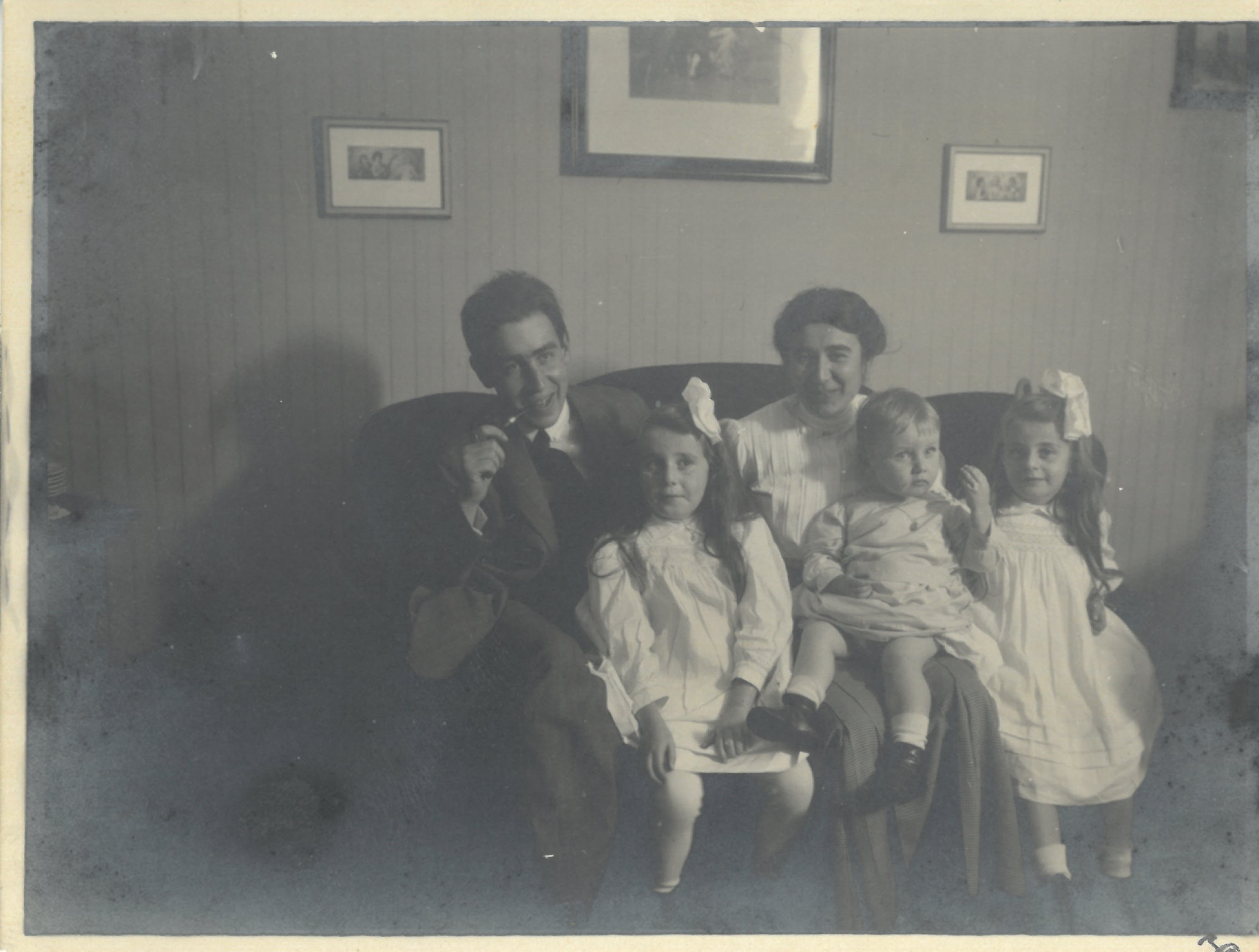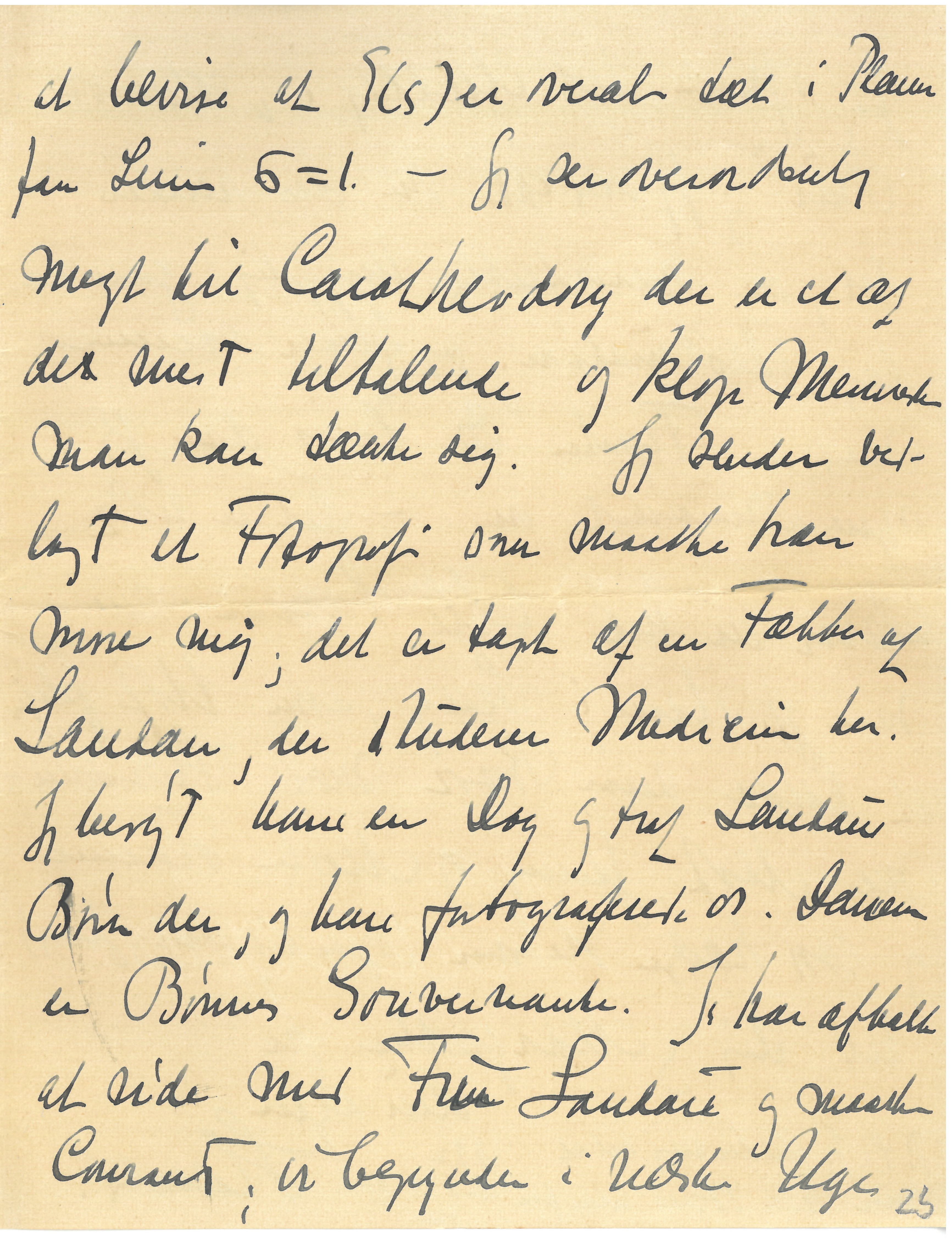 Endvidere har jeg bevist at \(\zeta(s)\) er overalt tæt i \(\zeta\)-Planen paa Linien \(\sigma=1\), hvad jeg i “en længere Aarrække” forgæves har søgt at vise. Courant og jeg arbejder paa en større Undersøgelse, der vist bliver ganske interessant, over Dirichlets Rækker i Tilknyning til den Metode jeg har benyttet for |at bevise at \(\zeta(s)\) er overalt tæt i Planen for Linien \(\sigma=1\). – Jeg ser overordentlig meget til Caratheodory der er et af de mest tiltalende og kloge Mennesker man kan tænke sig. Jeg sender vedlagt et Fotografi som maaske kan more dig; det er taget af en Fætter af Landau, der studerer Medicin her. Jeg besøgte ham en Dag og traf Landaus Børn der, og han fotograferede os. Damen er Børnenes Gouvernante. Jeg har aftalt at ride med Fru Landau og maaske Courant; vi begynder i næste Uge