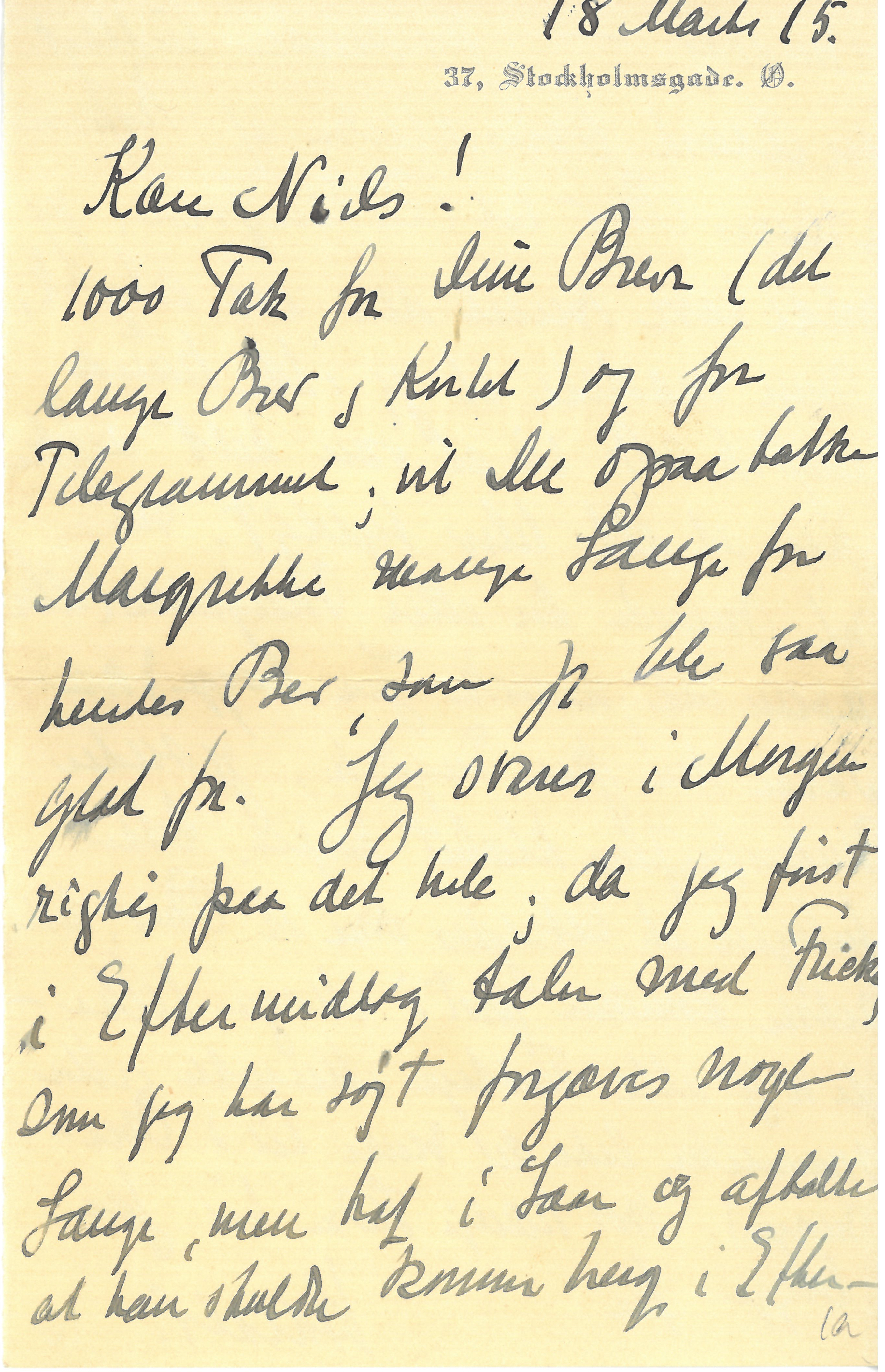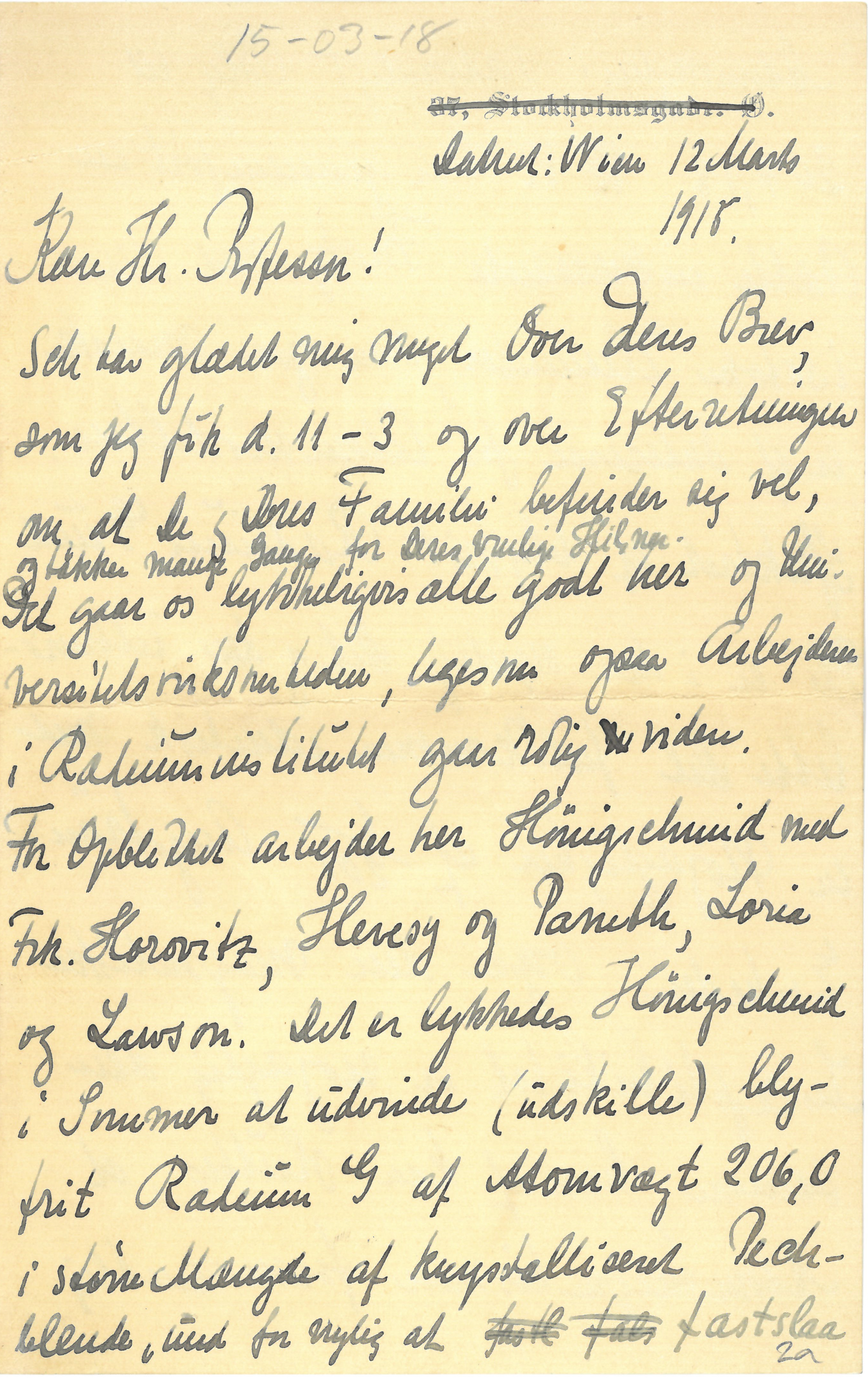 Selv har glædet mig meget over Deres Brev, som jeg fik d. 11-3 og over Efterretningen om at De og Deres Familie befinder sig vel, og takker mange Gange for Deres venlige Hilsner. Det gaar os lykkeligvis alle godt her og Universitetsvirksomheden, ligesom ogsaa Arbejderne i Radiumsinstitutet gaar rolig videre.