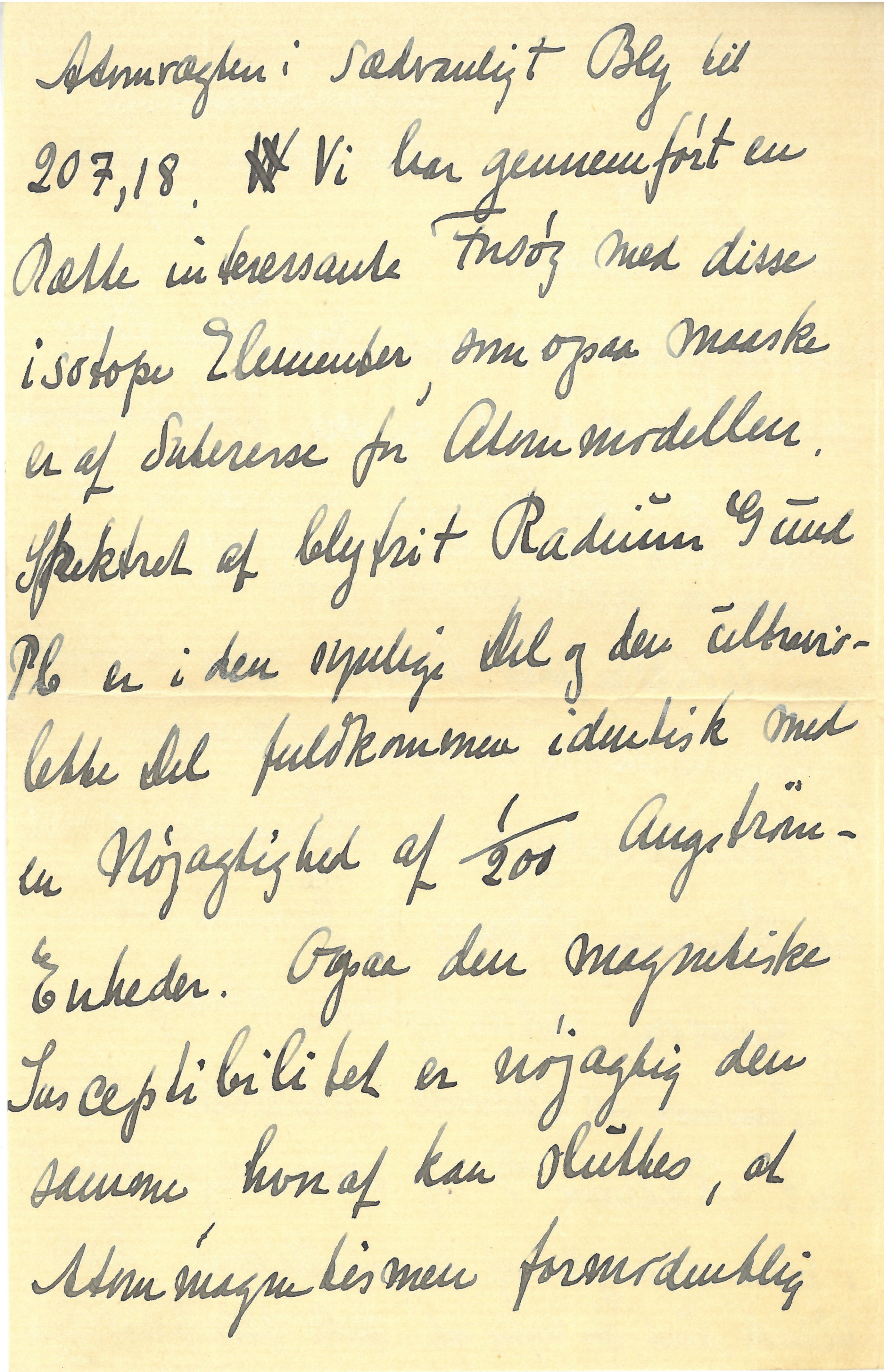 For Øjeblikket arbejder her Hönigschmid med Frk. Horovitz, Hevesy og Paneth, Loria og Lawson. Det er lykkedes Hönigschmid i Sommer at udvinde (udskille) blyfrit Radium G og Atomvægt 206,0 i større Mængde af krystalliseret Pechblende, ved for nylig at fastslaa |Atomvægten i sædvanligt Bly til 207,18. Vi har gennemført en Række interessante Forsøg med disse isotope Elementer, som ogsaa maaske er af Interesse for Atommodellen. Spektret af blyfrit Radium Grund Pb er i den synlige Del og den ultraviolette Del fuldkommen identisk med en Nøjagtighed af 1/200 Angström-Enheder. Ogsaa den magnetiske Susceptibilitet er nøjagtig den samme hvoraf kan sluttes, at Atommagnetismen formodentlig |ikke er Kærne – men Ring – Egenskab. Hevesy og Paneth har vist, at ogsaa Diffusionshastigheden afhænger væsentlig af Atomets Volumen og næppe af Atomets Masse. Lawson arbejder uforstyrret over Joniseringskurven, det gaar ham meget godt og han beder Dem, hvis De har Lejlighed dertil at hilse Arthur Holmes og hans (sine? H.B.) Forældre fra ham. Mache og Flamm arbejder paa den videre Fuldkommengørelse af Maalingerne over Emanationens Strømæquivalent.