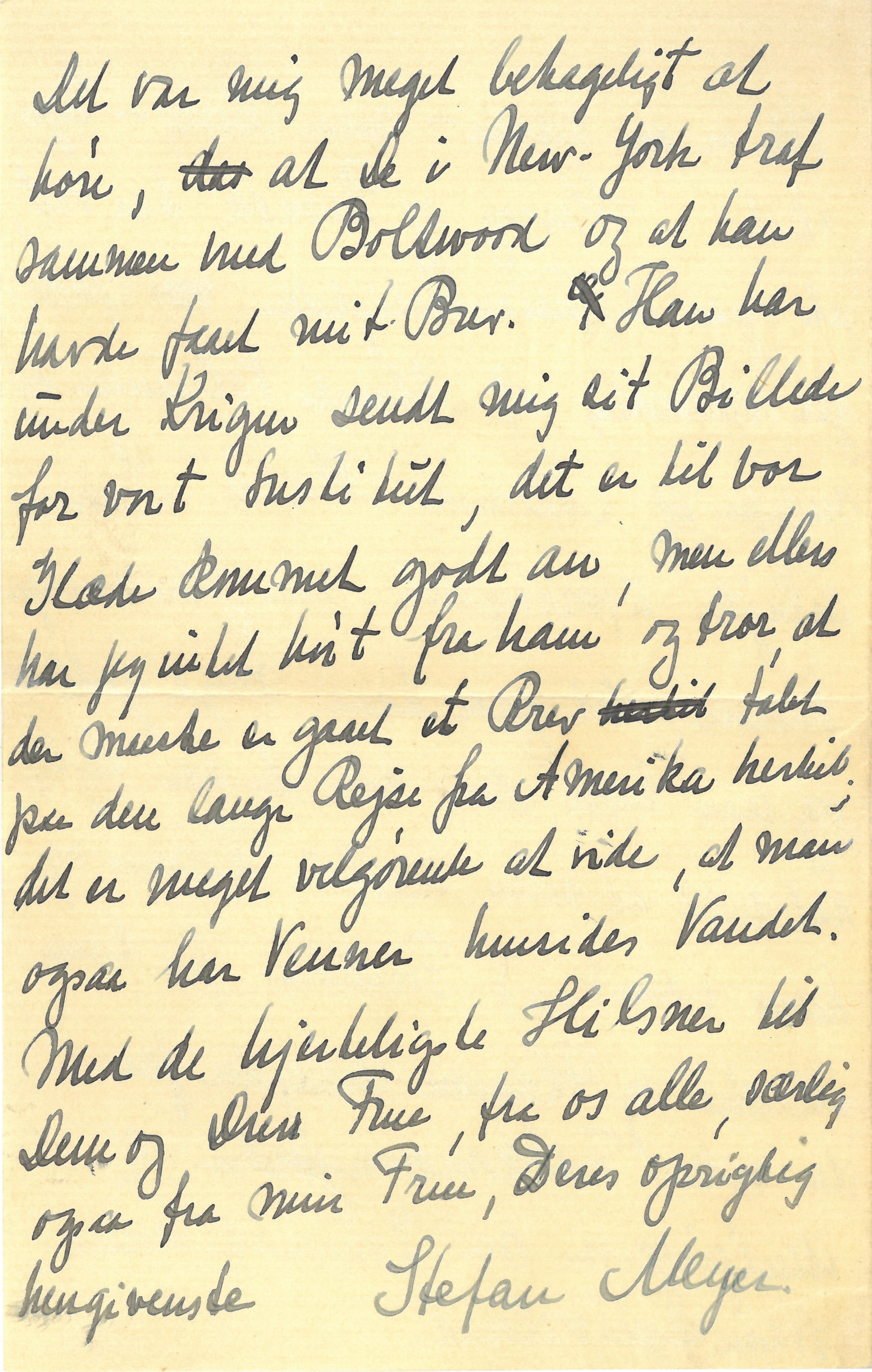 |Det var mig meget behageligt at høre, at De i New-York traf sammen med Boltwood og at han havde faaet mit Brev. Han har under Krigen sendt mig sit Billede for vort Institut, det er til vor Glæde kommet godt an, men ellers har jeg intet hørt fra ham og tror, at der maaske er gaaet et Brev tabt paa den lange Rejse fra Amerika hertil; det er meget velgørende at vide, at man ogsaa har Venner hinsides Vandet.