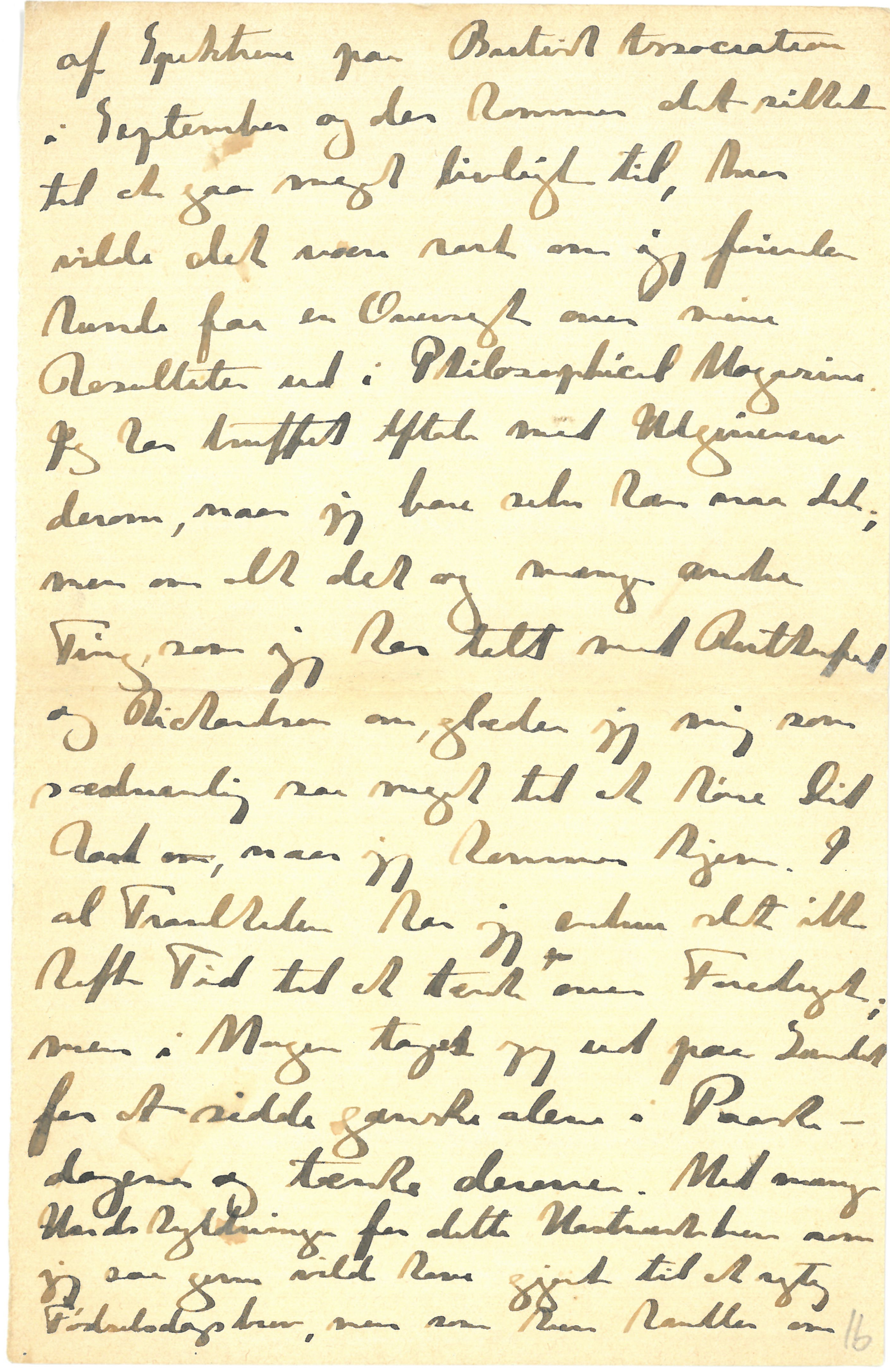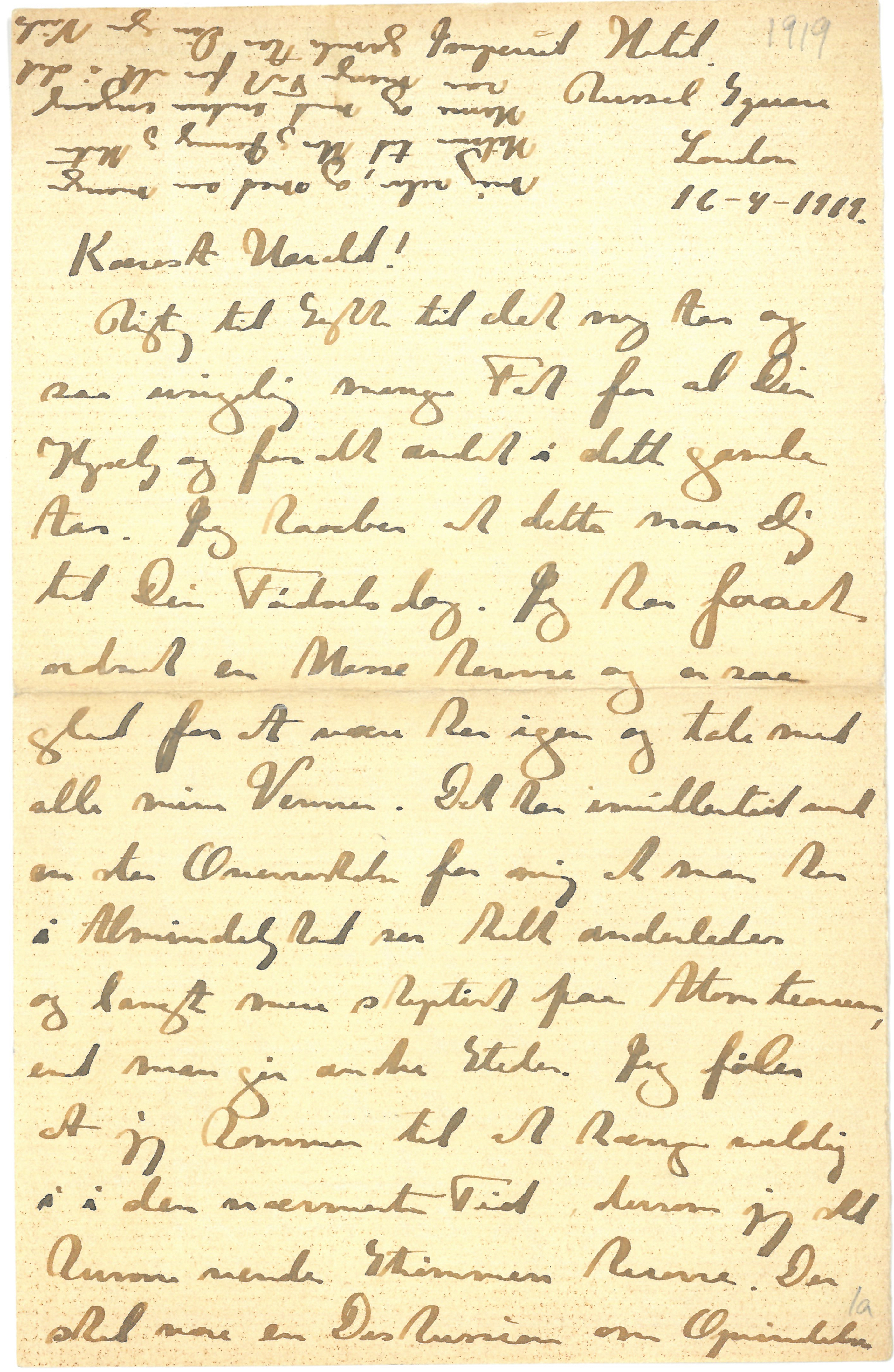 Rigtig til Lykke til det ny Aar og saa usigelig mange Tak for al Din Hjælp og for alt andet i dette gamle Aar. Jeg haaber at dette naar Dig til Din Fødselsdag. Jeg har faaet ordnet en Masse herovre og er saa glad for at være her igen og tale med alle mine Venner. Det har imidlertid været en stor Overraskelse for mig at man her i Almindelighed ser helt anderledes og langt mere skeptisk paa Atomteorien, end man gør andre Steder. Jeg føler at jeg kommer til at hænge vældig i i den nærmeste Tid, dersom jeg skal kunne vende Strømmen herovre. Der skal være en Diskussion om Oprindelsen |af Spektrene paa British Association i September og der kommer det sikkert til at gaa meget livligt til, hvor vilde det være rart om jeg forinden kunde faa en Oversigt over mine Resultater ud i Philosophical Magazine. Jeg har truffet Aftale med Udgiveren derom, naar jeg bare selv kan naa det; men om alt det og mange andre Ting, som jeg har talt med Rutherford og Richardson om, glæder jeg mig som sædvanlig saa meget til at høre Dit Raad om, naar jeg kommer hjem. I al Travlheden har jeg endnu slet ikke haft Tid til at tænke over Foredraget; men i Morgen tager jeg ud paa Landet for at sidde ganske alene i Paaskedagene og tænke derover. Med mange Undskyldninger for dette Hastværksbrev som jeg saa gerne vilde have gjort til et rigtig Fødselsdagsbrev, men som kun handler om 1r| mig selv, og med saa mange Hilsner til Mor og Jenny og Moster Hanne og med endnu engang saa mange Tak for alt i det gamle Aar.