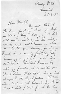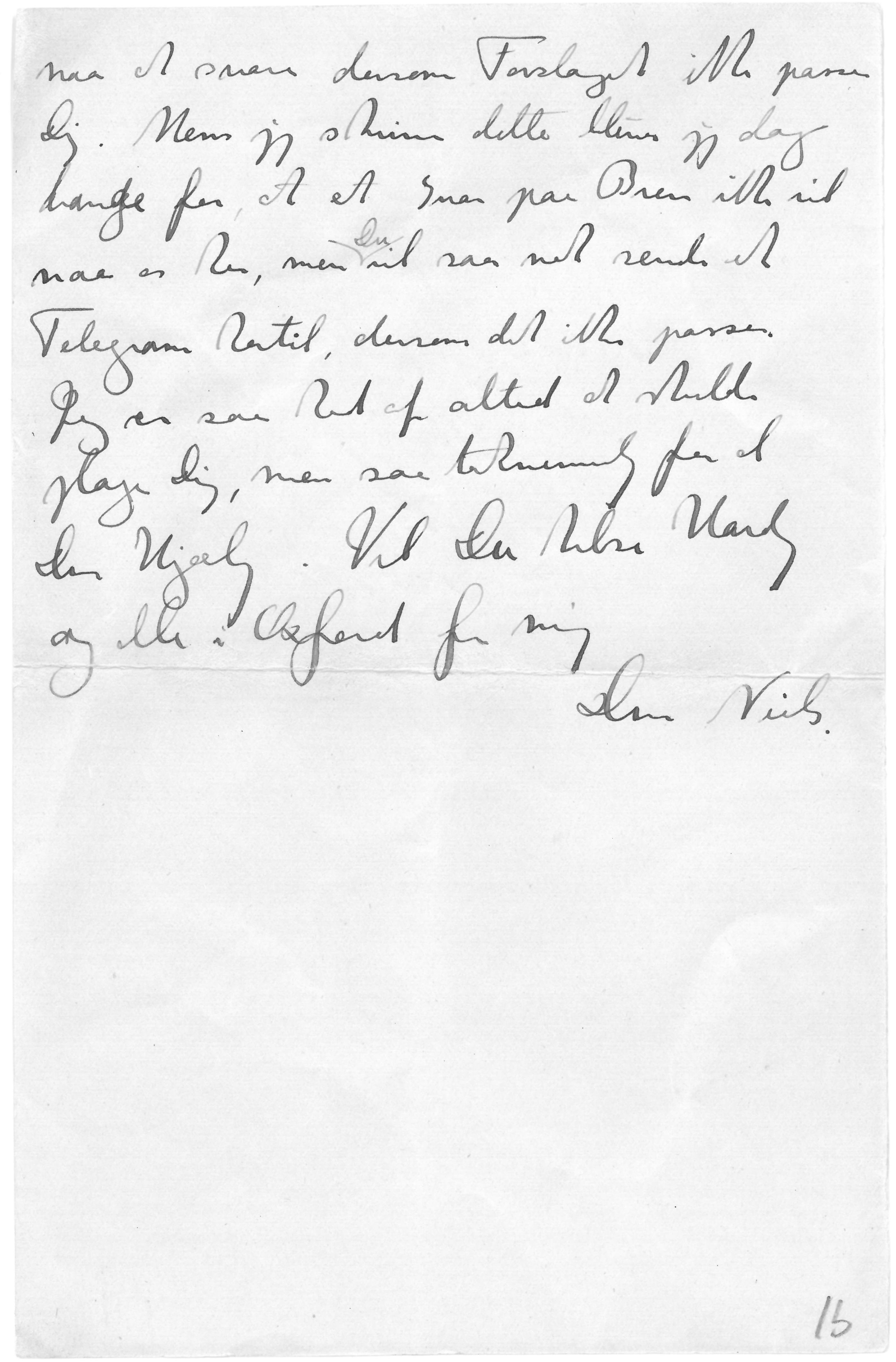 Jeg sender blot et Par Linier for at sige, at vi rejser herfra paa Mandag Morgen tidlig, og at det vilde være vidunderligt om Du virkelig, som Du sagde, vilde komme og møde os i London paa Mandag, for at sige Farvel; der er nemlig forskellige Ting hvorom jeg meget gerne vilde høre Dit Raad. Hvis det passer Dig vilde jeg foreslaa, at vi mødtes paa Strand Palace Hotel Kl 12, hvor vi tænker at spise Lunch. Du vil finde os i Forhallen eller i Lunchroom (ikke Grilroom). Jeg skynder mig at sende dette af Sted for at Du kan |naa at svare dersom Forslaget ikke passer Dig. Mens jeg skriver dette bliver jeg dog bange for, at et Svar paa Brev ikke vil naa os her, men Du vil saa nok sende et Telegram hertil, dersom det ikke passer. Jeg er saa ked af altid at skulde plage Dig, men saa taknemlig for al Din Hjælp. Vil Du hilse Hardy og alle i Oxford fra mig