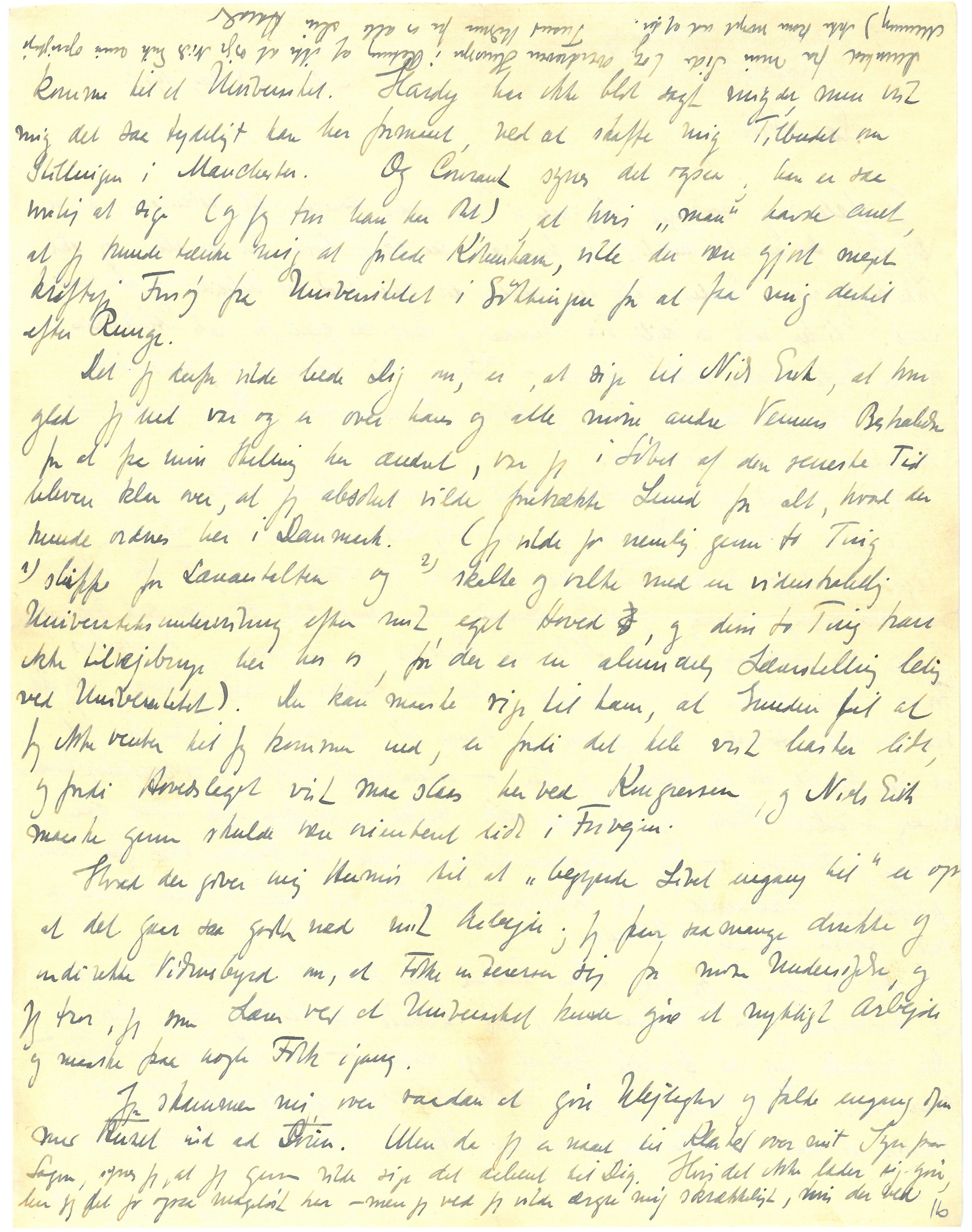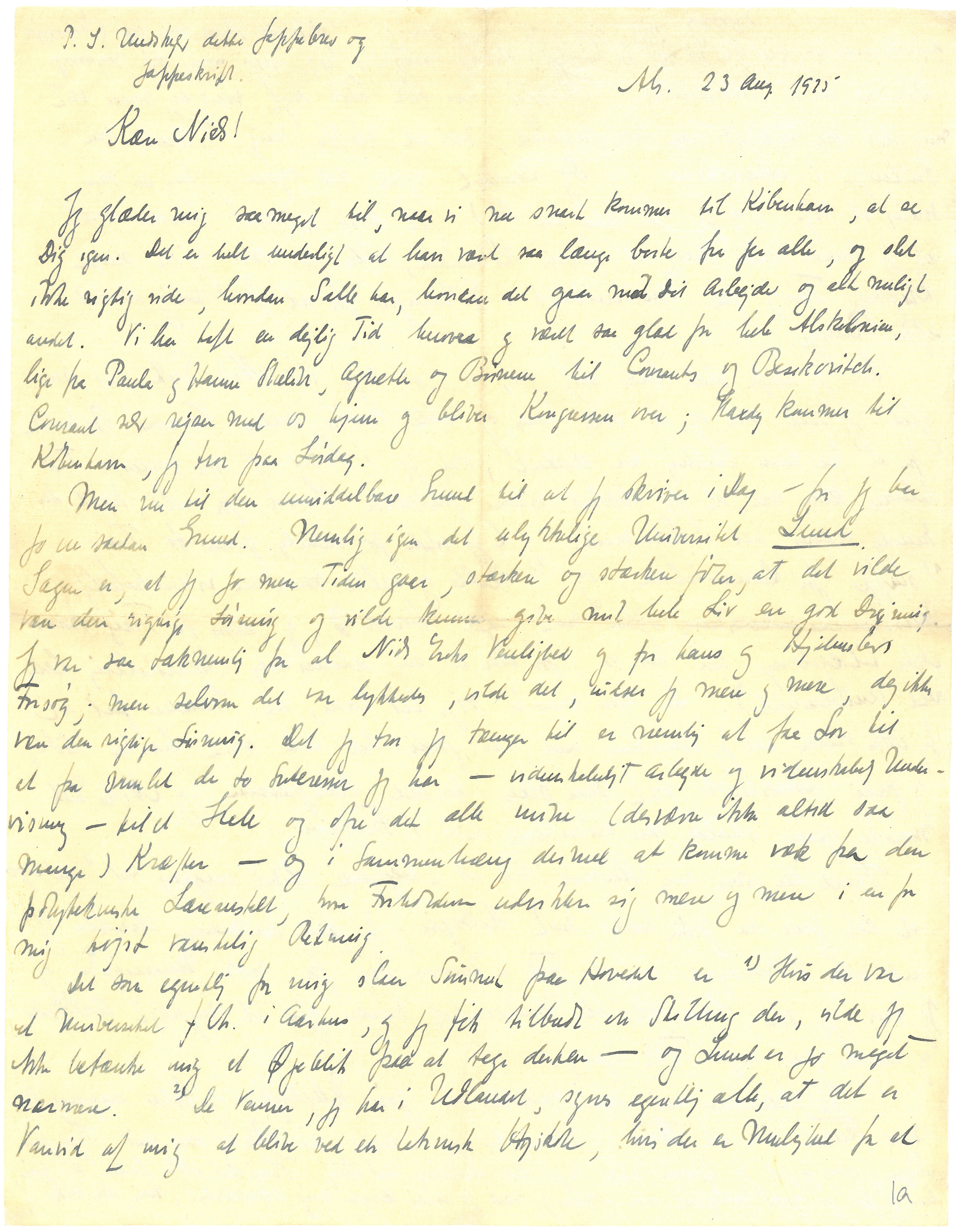 Det jeg derfor vilde bede Dig om, er, at sige til Niels Erik, at hvor glad jeg vel var og er over hans og alle mine andre Venners Bestræbelser for at faa min Stilling her ændret, var jeg i Løbet af den seneste Tid bleven klar over, at jeg absolut vilde fortrække Lund for alt, hvad der kunde ordnes her i Danmark. (Jeg vilde jo nemlig gerne to Ting