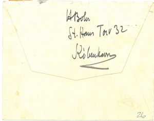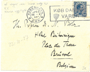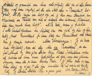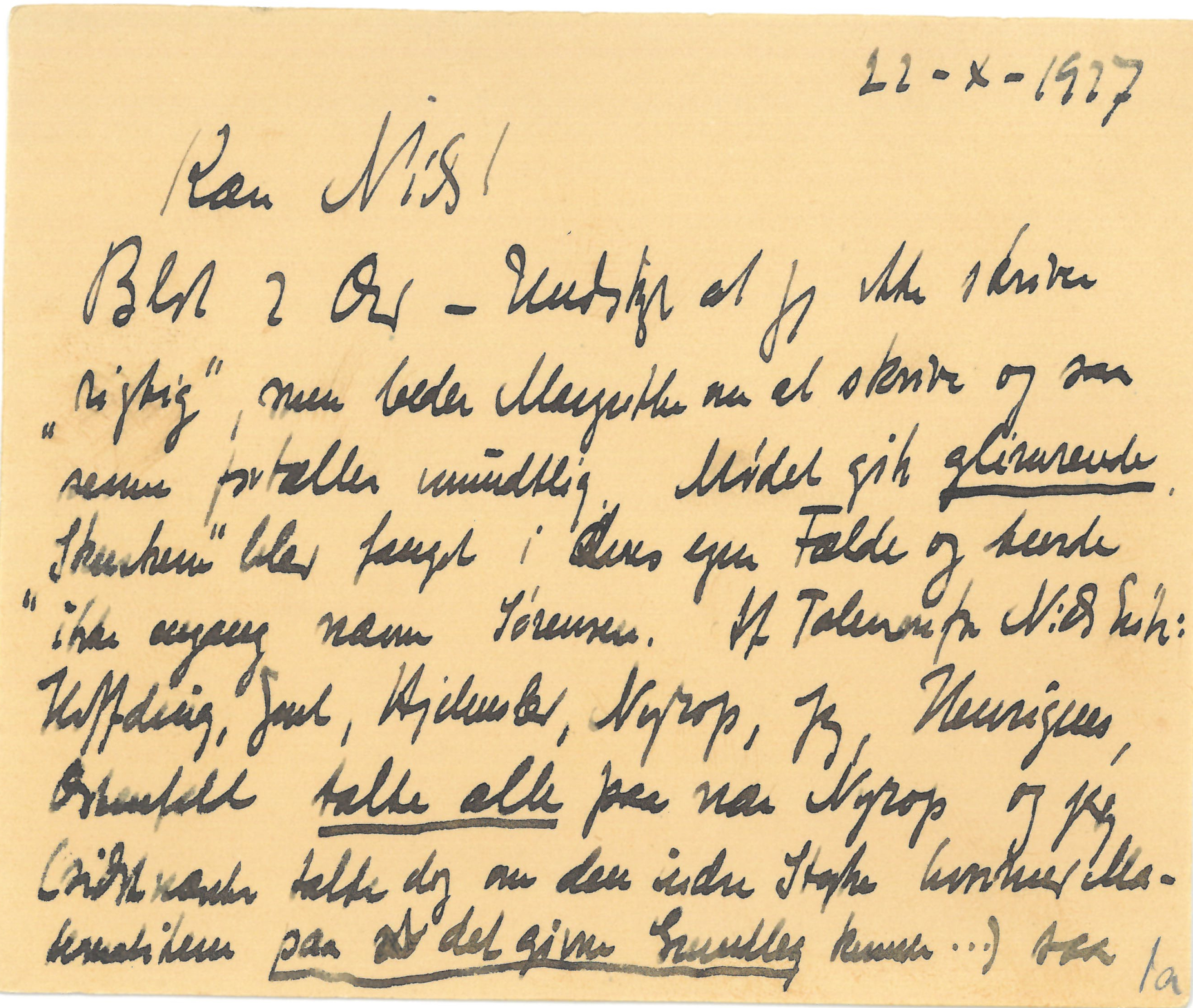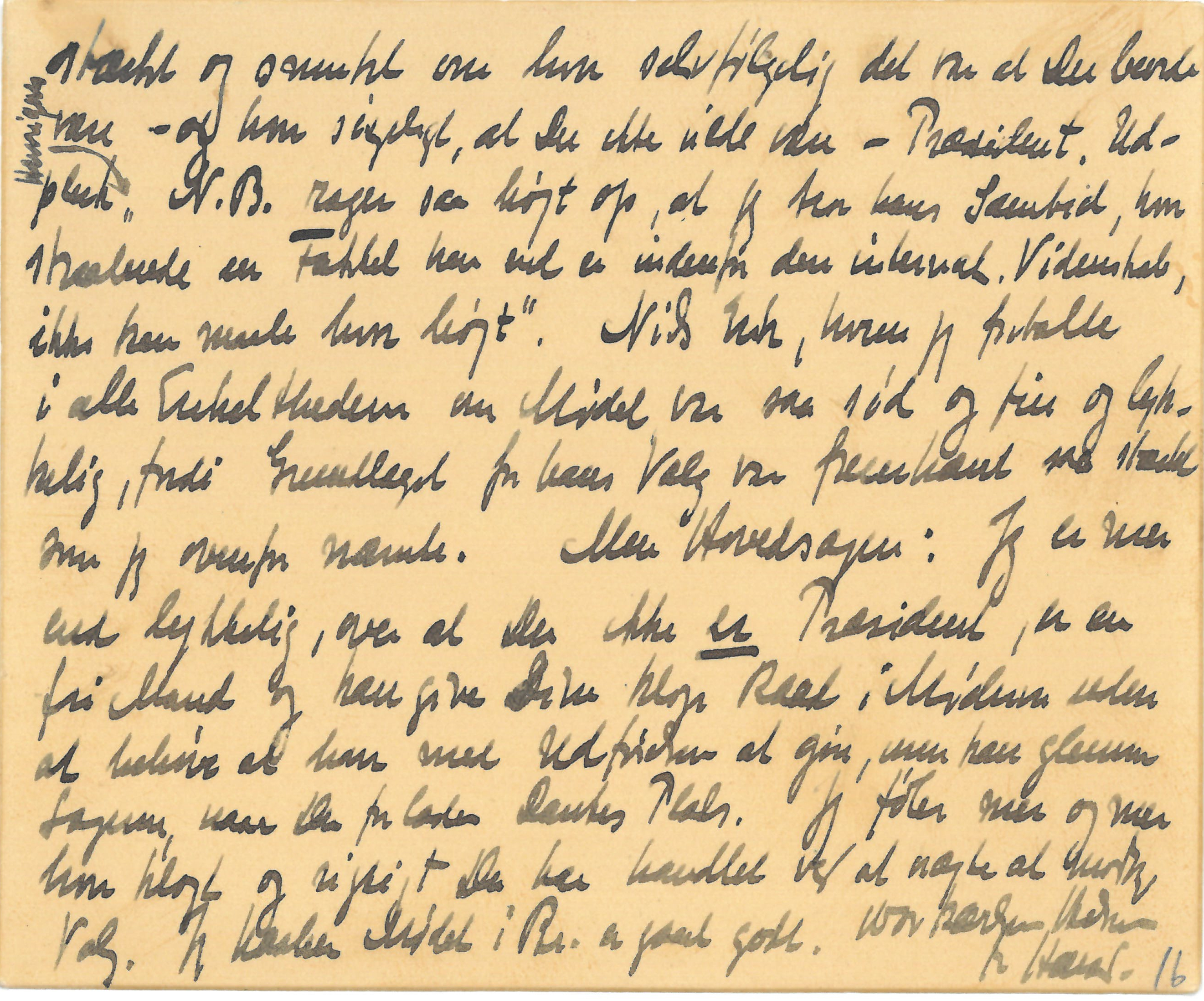 Blot 2 Ord – Undskyld at jeg ikke skriver “rigtig”, men beder Margrethe om at skrive og saa senere fortæller mundtlig. Mødet gik glimrende. “Skurkene” blev fanget i deres egen Fælde og turde ikke engang nævne Sørensen. Af Talerne for Niels Erik: Høffding, Juel, Hjelmslev, Nyrop, Jeg, Henriques, Ostenfeld talte alle paa nær Nyrop og jeg (sidstnævnte talte dog om den indre Styrke hvormed Matematikerne paa det givne Grundlag kunde ...) saa |stærkt og smukt om hvor selvfølgelig det var at Du burde være – og hvor sørgeligt, at Du ikke vilde være – Præsident. Udpluk Henriques “N.B. rager saa højt op, at jeg tror hans Samtid, kun skælvede en Fakkel han end er indenfor den internat. Videnskab, ikke kan maale hvor højt”. Niels Erik, hvem jeg fortalte i alle Enkeltheder om Mødet var saa sød og fin og lykkelig, fordi Grundlaget for hans Valg var fremhævet saa stærkt som jeg ovenfor nævnte. Men Hovedsagen: Jeg er mer end lykkelig, over at Du ikke er Præsident, er en fri Mand og kan give Dine kloge Raad i Møderne uden at behøve at have med Udførelsen at gøre, men kan glemme Sagerne, naar Du forlader Dantes Plads. Jeg føler mere og mere hvor klogt og rigtigt Du har handlet ved at nægte at modtage Valg. Jeg haaber Mødet i Br. er gaaet godt.
