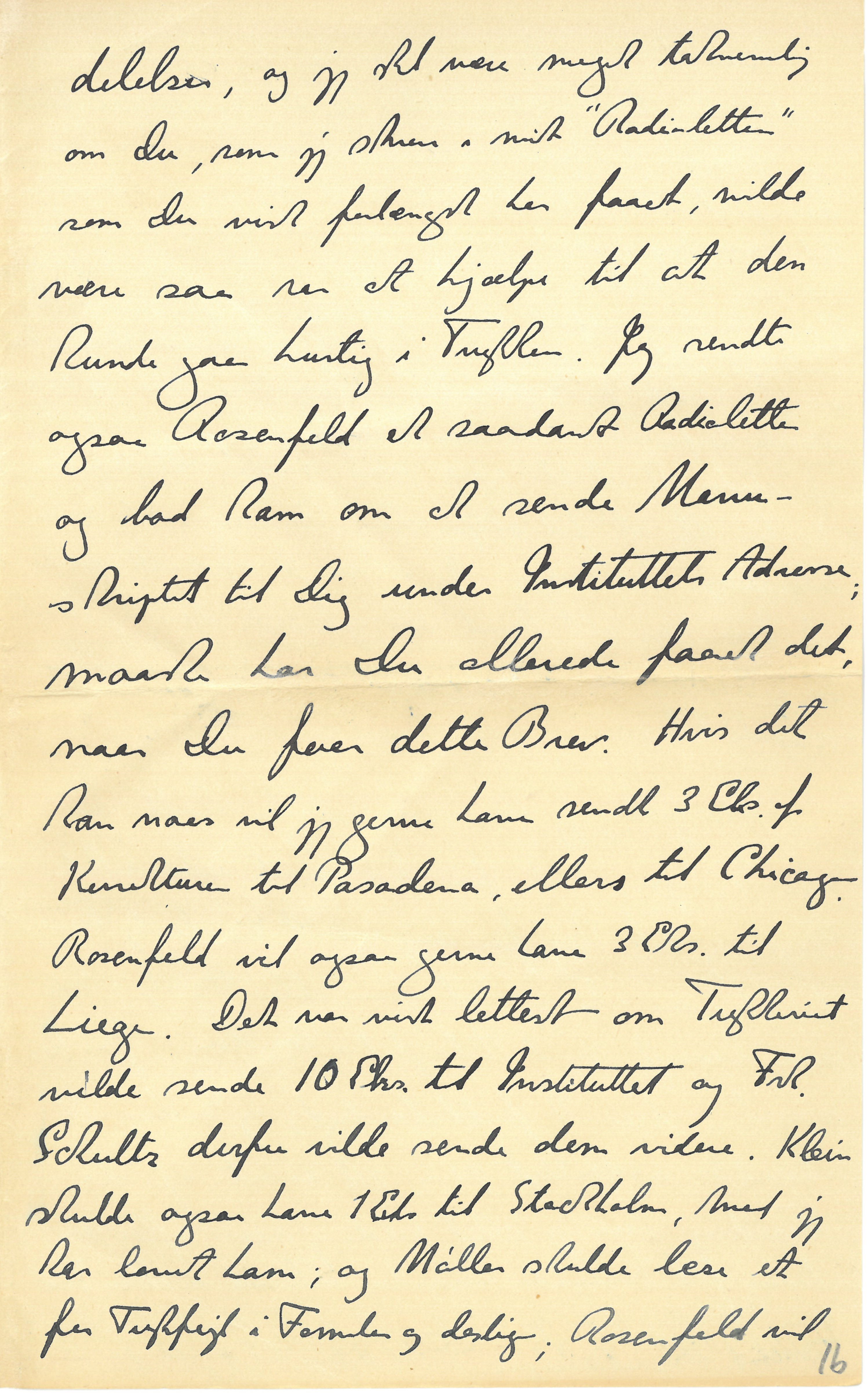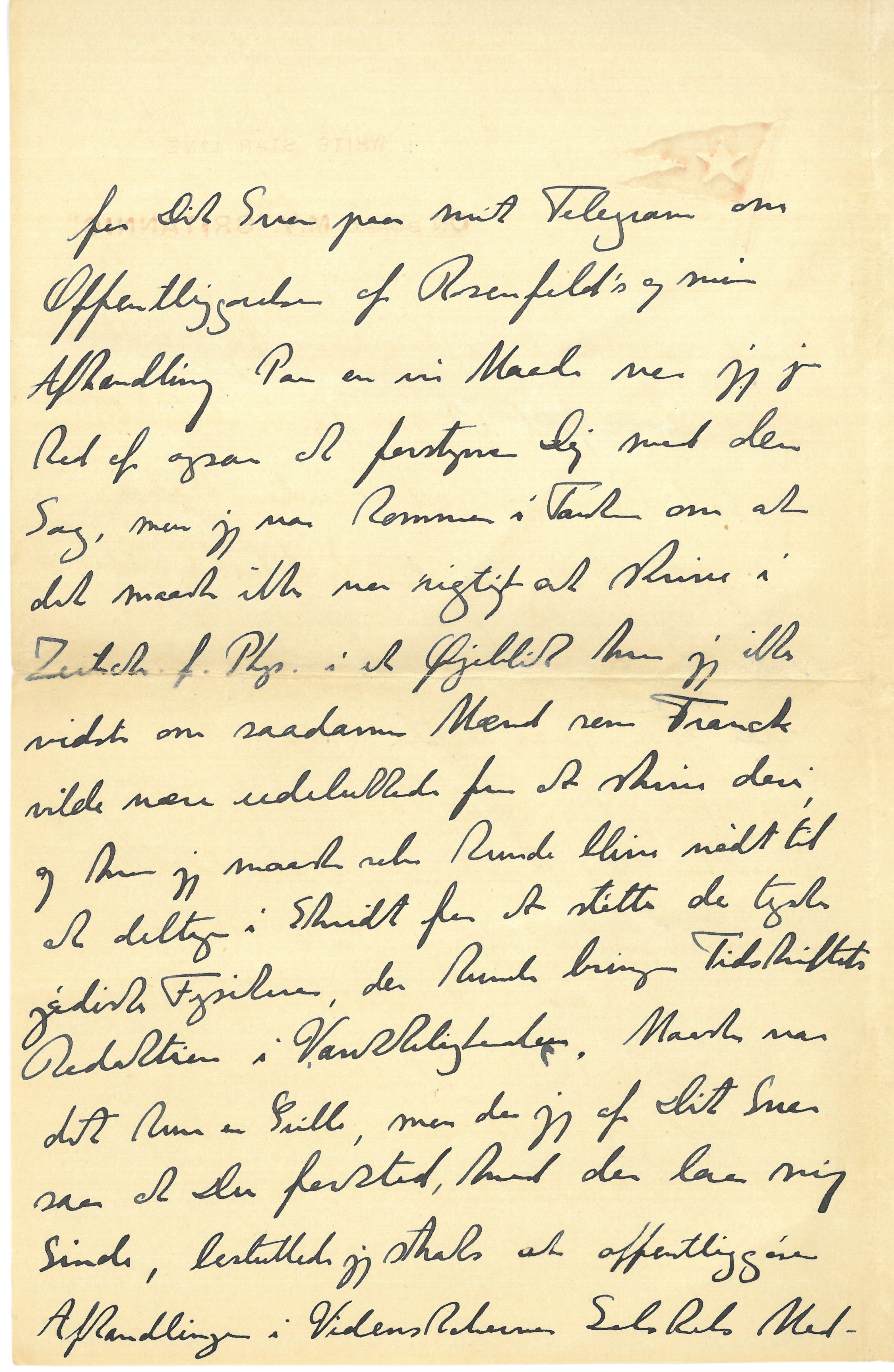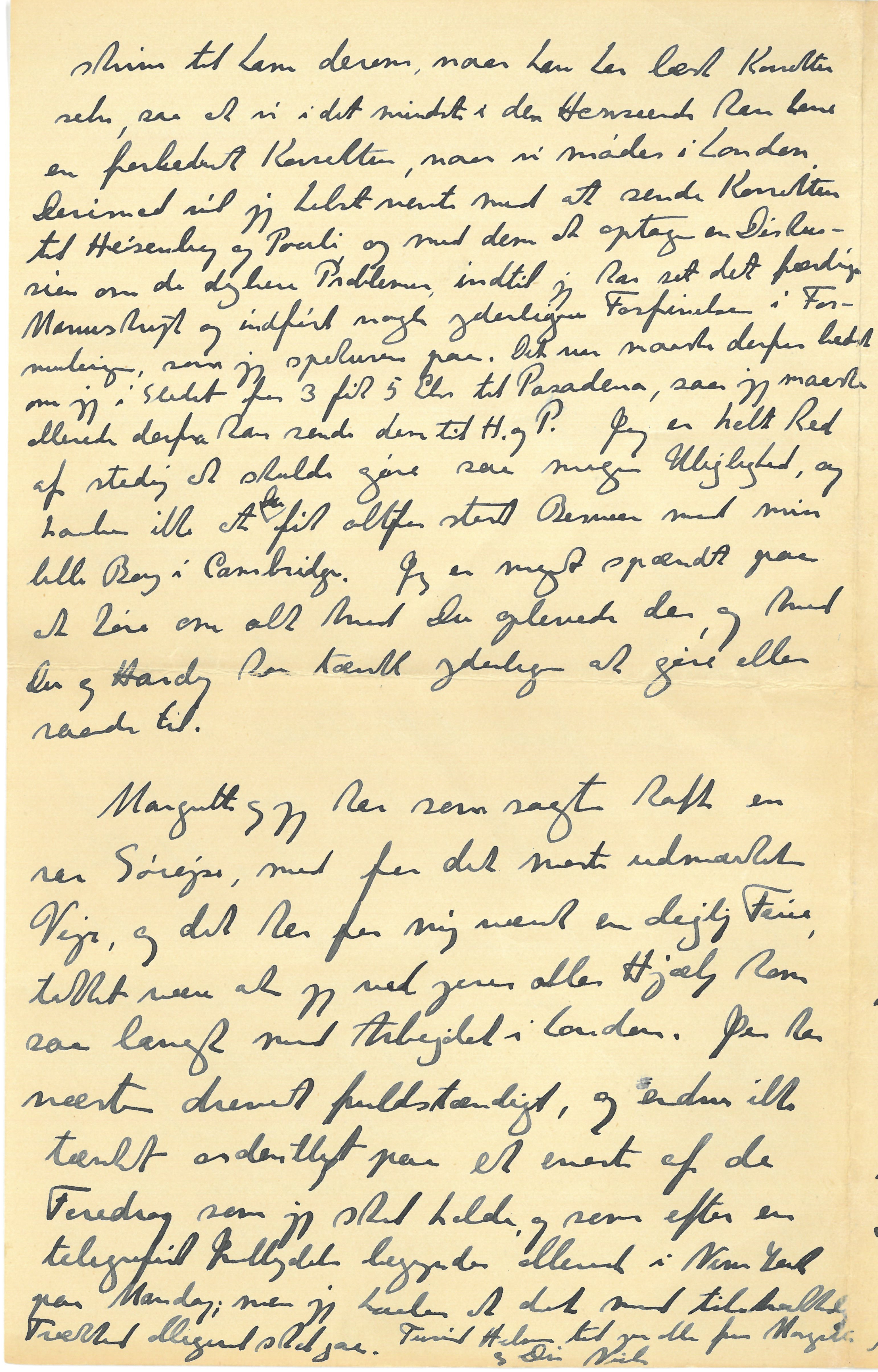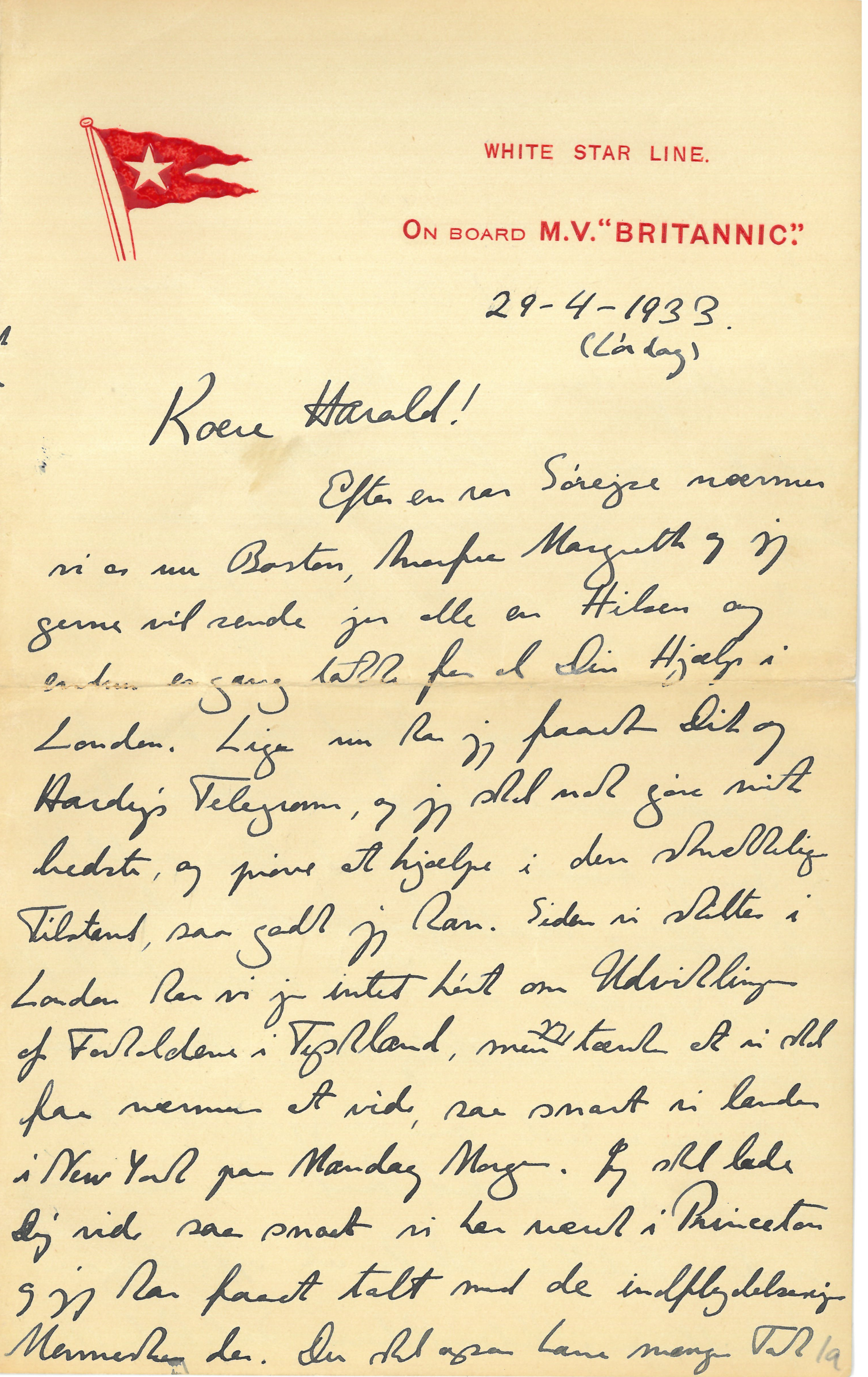 Efter en rar Sørejse nærmer vi os nu Boston, hvorfra Margrethe og jeg gerne vil sende jer alle en Hilsen og endnu engang takke for al Din Hjælp i London. Lige nu har jeg faaet Dit og Hardy’s Telegram, og jeg skal nok gøre mit bedste, og prøve at hjælpe i den skrækkelige Tilstand, saa godt jeg kan. Siden vi skiltes i London har vi jo intet hørt om Udviklingen af Forholdene i Tyskland, men jeg tænker at vi skal faa nærmere at vide, saa snart vi lander i New York paa Mandag Morgen. Jeg skal lade Dig vide saa snart vi har været i Princeton og jeg har faaet talt med de indflydelsesrige Mennesker der. Du skal ogsaa have mange Tak |for Dit Svar paa mit Telegram om Offentliggørelsen af Rosenfeld’s og min Afhandling. Paa en vis Maade var jeg jo ked af ogsaa at forstyrre Dig med den Sag, men jeg var kommen i Tanke om at det maaske ikke var rigtigt at skrive i Zeitsch. f. Phys. i et Øjeblik hvor jeg ikke vidste om saadanne Mænd som Franck vilde være udelukkede fra at skrive deri; og hvor jeg maaske selv kunde blive nødt til at deltage i Skridt for at støtte de tyske jødiske Fysikere, der kunde bringe Tidsskriftets Redaktion i Vanskeligheder. Maaske var det kun en Grille, men da jeg af Dit Svar saa at Du forstod, hvad der laa mig Sinde, besluttede jeg straks at offentliggøre Afhandlingen i Videnskabernes Selskabs Med |delelser, og jeg skal være meget taknemlig om Du, som jeg skrev i mit “Radioletter” som Du vist forlængst har faaet, vilde være saa rar at hjælpe til at den kunde gaa hurtig i Trykken. Jeg sendte ogsaa Rosenfeld et saadant Radioletter og bad ham om at sende Manuskriptet til Dig under Instituttets Adresse; maaske har Du allerede faaet det, naar Du faar dette Brev. Hvis det kan naas vil jeg gerne have sendt 3 Eks. af Korrekturen til Pasadena, ellers til Chicago. Rosenfeld vil ogsaa gerne have 3 Eks. til Liege. Det var vist lettest om Trykkeriet vilde sende 10 Eks. til Instituttet og Frk. Schultz derfra vilde sende dem videre. Klein skulde ogsaa have 1 Eks. til Stockholm, hvad jeg har har lovet ham; og Møller skulde læse et for Trykfejl i Formler og deslige; Rosenfeld vil |skrive til ham derom, naar han har læst Korrektur selv, saa at vi i det mindste i den Henseende kan have en forbedret Korrektur, naar vi mødes i London. Derimod vil jeg helst vente med at sende Korrektur til Heisenberg og Pauli og med dem at optage en Diskussion om de dybere Problemer, indtil jeg har set det færdige Manuskript og indført nogle yderligere Forfinelser i Formuleringen, som jeg spekulerer paa. Det var maaske derfor bedst om jeg i Stedet for 3 fik 5 Eks til Pasadena, saa jeg maaske allerede derfra kan sende dem til H. og P. Jeg er helt ked af stadig at skulde gøre saa megen Ulejlighed, og haaber ikke at Du fik altfor stort Besvær med min lille Bog i Cambridge. Jeg er meget spændt paa at høre om alt hvad Du oplevede der, og hvad Du og Hardy har tænkt yderligere at gøre eller raade til.