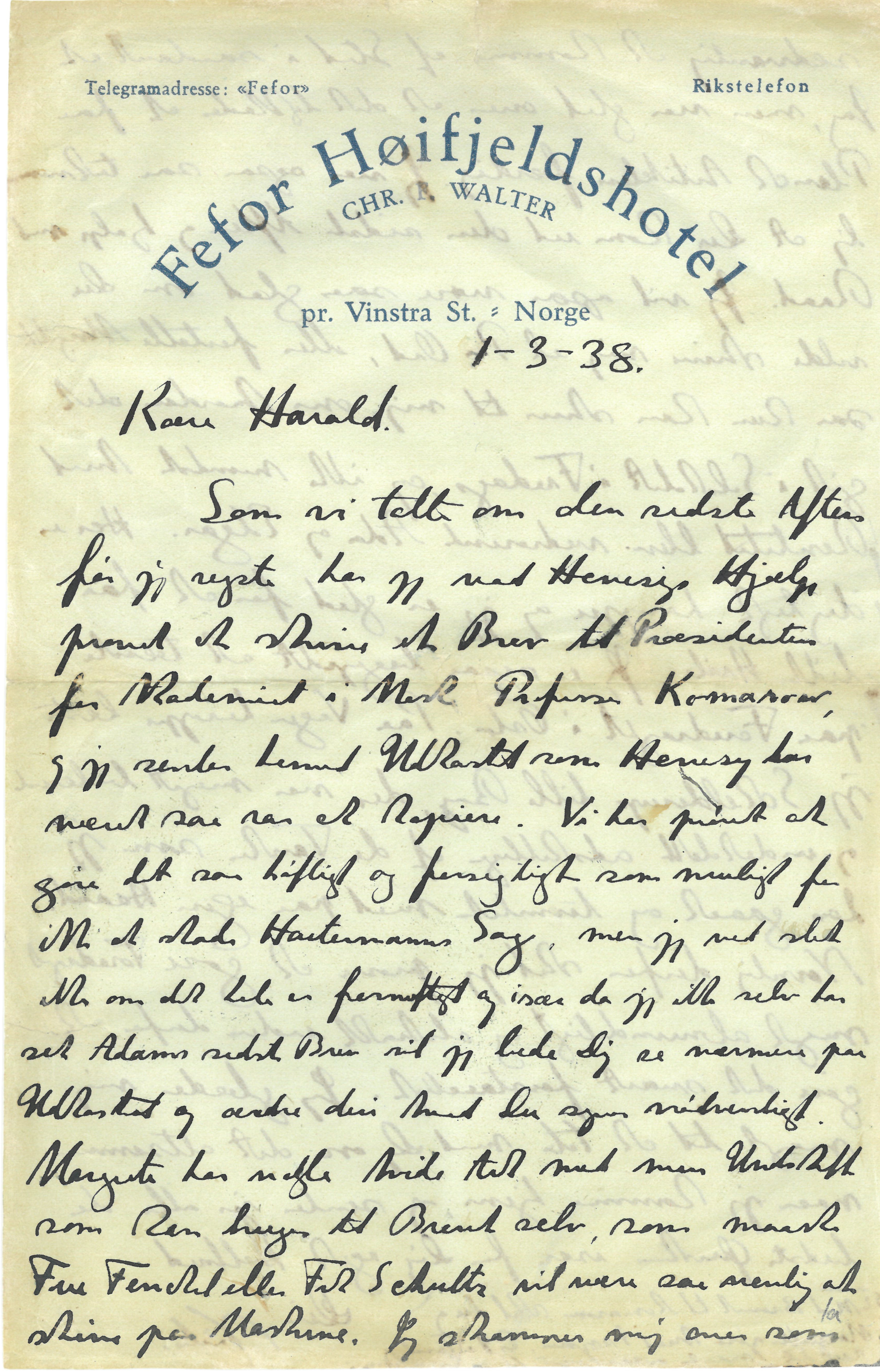 A Copenhagen, Niels Bohr Archive, Harald Bohr Correspondence, HBC-BOHR-380301t. Letter, handwritten by Niels Bohr on stationery from Fefor Høifjeldshotel