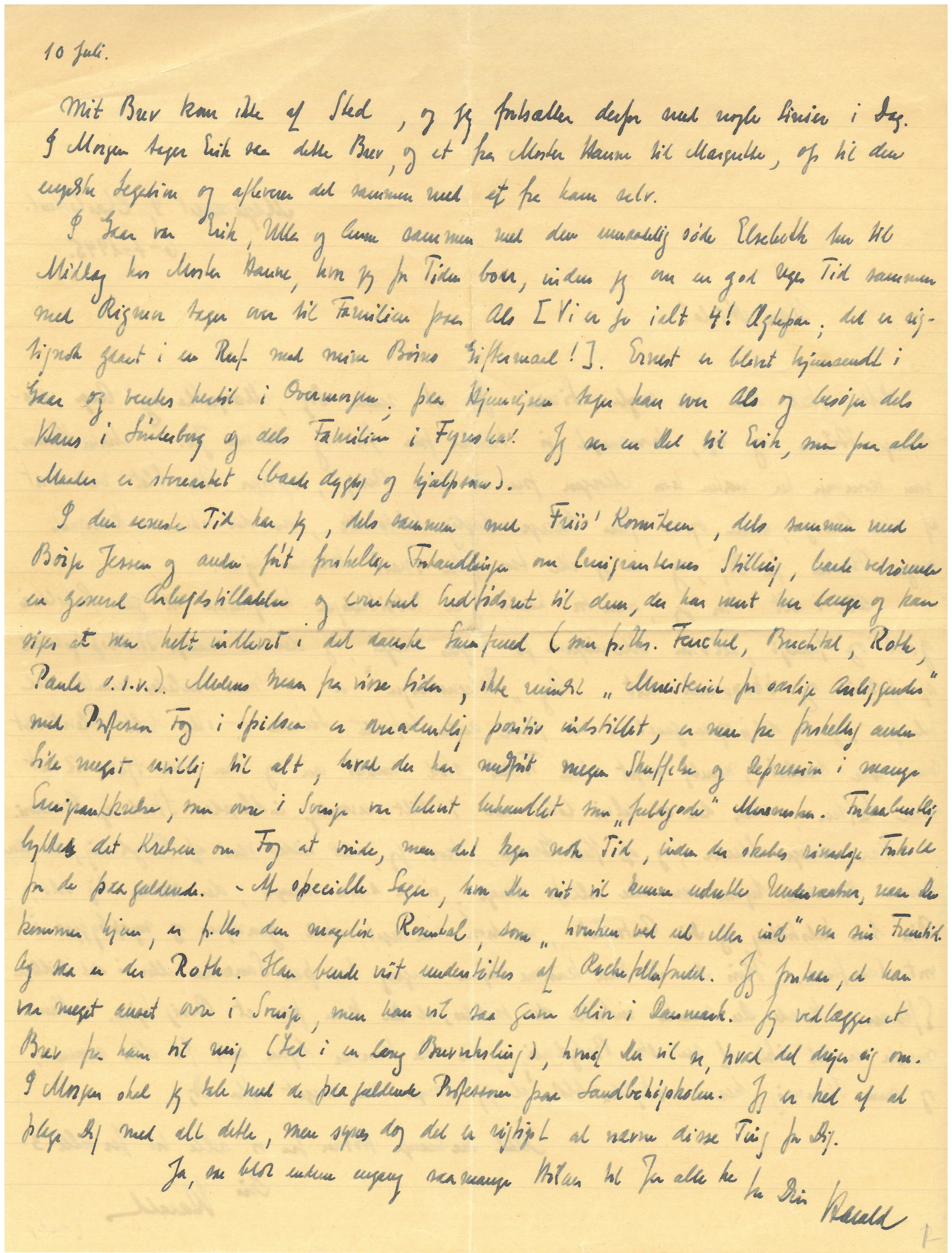 I den seneste Tid har jeg, dels sammen med Friis’ Komiteen, dels sammen med Børge Jessen og andre ført forskellige Forhandlinger om Emigranternes Stilling, baade vedrørende en generel Arbejdstilladelse og eventuel Indfødsret til dem, der har været her længe og kan siges at være helt indlært i det danske Samfund (som f.Eks. Fenchel, Buchtal, Roth, Paula o.s.v.). Medens man fra visse Sider, ikke mindst “Ministeriet for særlige Anliggender” med Professor Fog i Spidsen er overordentlig positiv indstillet, er man fra forskellig anden Side meget uvillig til alt, hvad der har medført megen Skuffelse og Depression i mange Emigrantkredse, som ovre i Sverige var blevet behandlet som “fuldgode” Mennesker. Forhaabentlig lykkes det Kredsen om Fog at vinde, men det tager nok Tid, inden der skabes rimelige Forhold for de paagældende. – Af specielle Sager, hvor Du vist vil kunne udrette Underværker, naar Du kommer hjem, er f.Eks den mageløse Rozental, som “hverken ved ud eller ind” om sin Fremtid. Og saa er der Roth. Han burde vist understøttes af Rockefellerfondet. Jeg forstaar, at han var meget anset ovre i Sverige, men han vil saa gerne blive i Danmark. Jeg vedlægger et Brev fra ham til mig (Led i en lang Brevveksling), hvori Du vil se, hvad det drejer sig om. I Morgen skal jeg tale med de paagældende Professorer paa Landbohøjskolen. Jeg er ked af at plage Dig med alt dette, men synes dog det er rigtigt at nævne disse Ting for Dig.