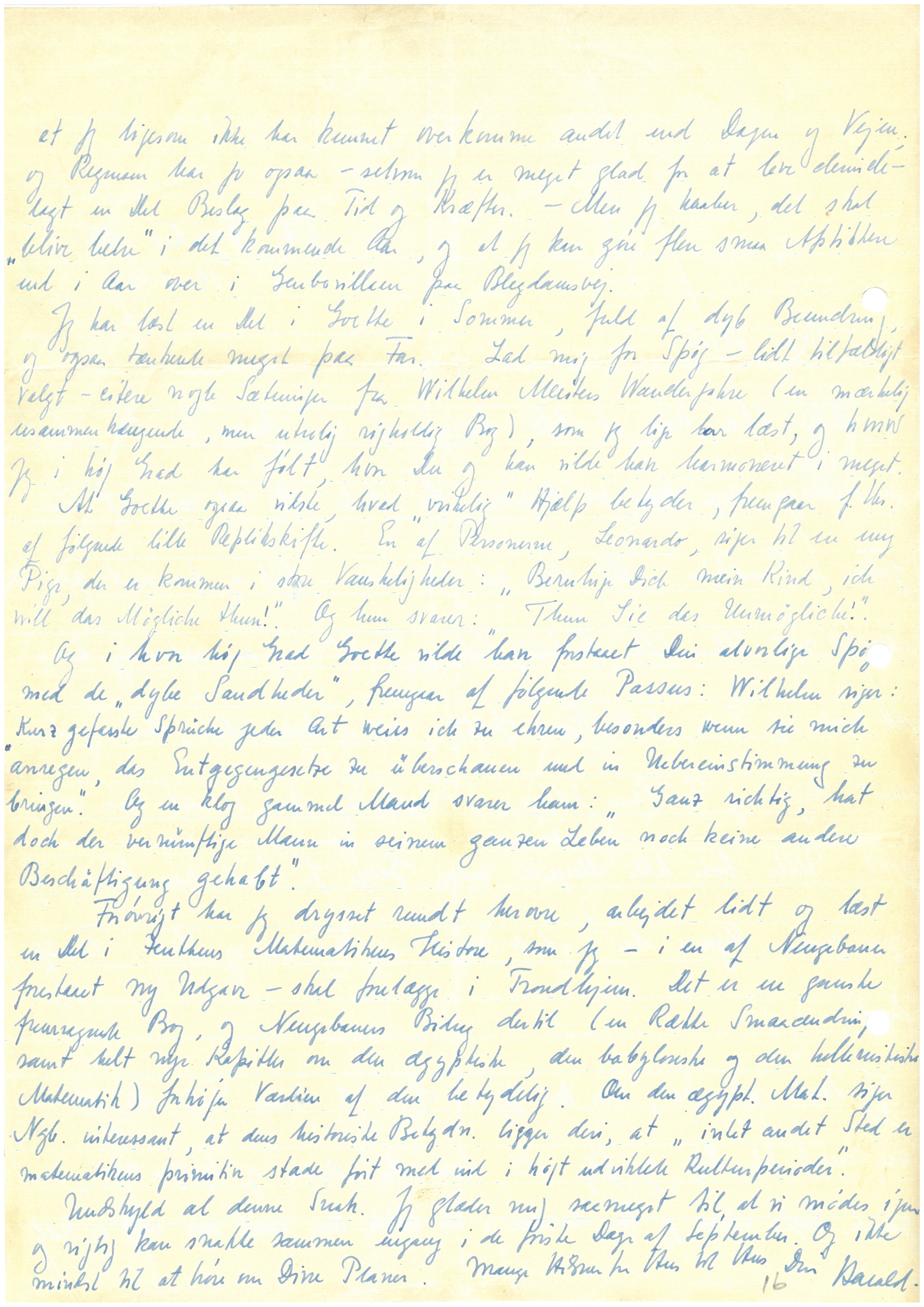 Jeg har læst en Del i Goethe i Sommer, fuld af dyb Beundring, og ogsaa tænkende meget paa Far. Lad mig for Spøg – lidt tilfældigt valgt – citere nogle Sætninger fra Wilhelm Meisters Wanderjahre (en mærkelig usammenhængende, men utrolig righoldig Bog), som jeg lige har læst, og hvori jeg i høj Grad har følt, hvor Du og han vilde have harmoneret i meget.